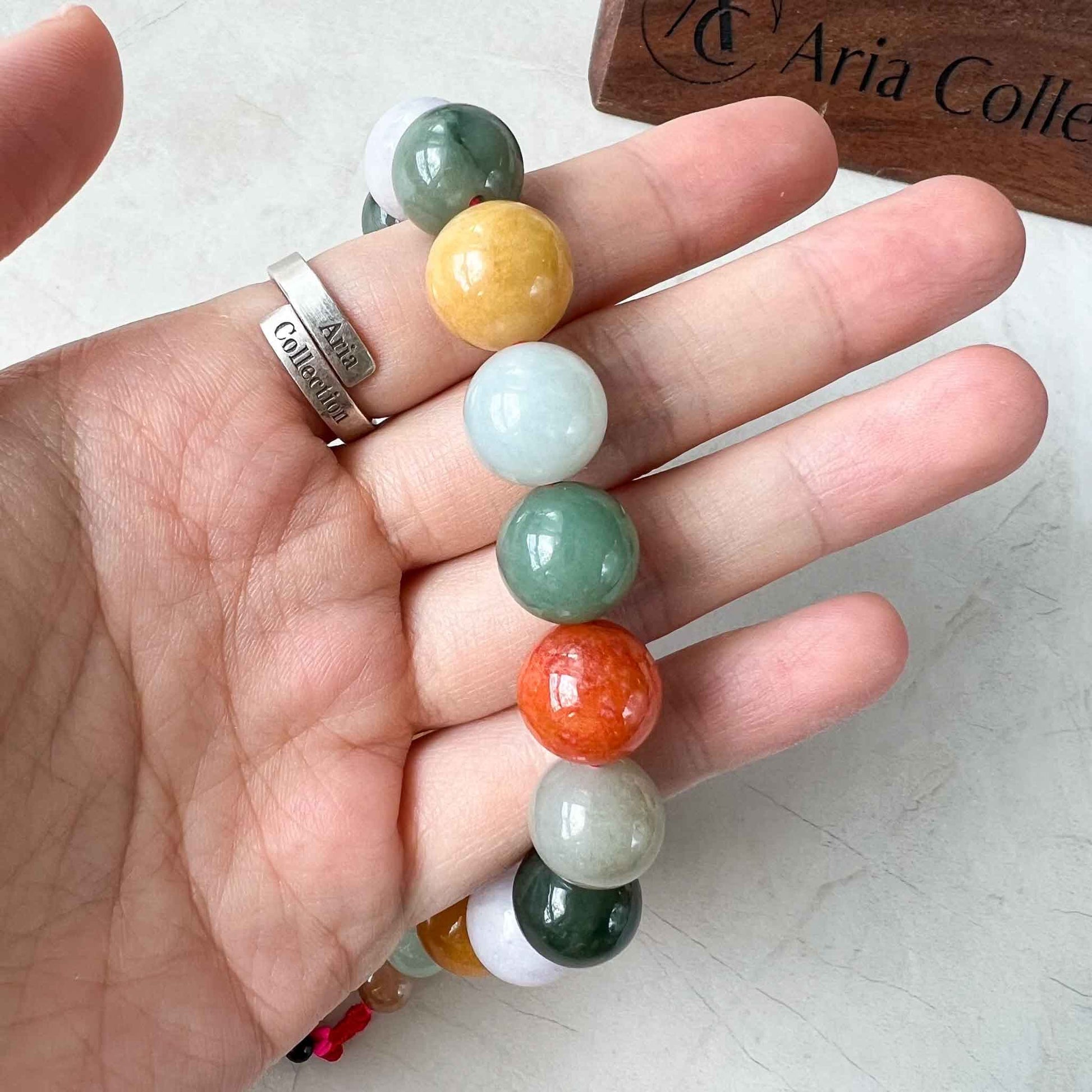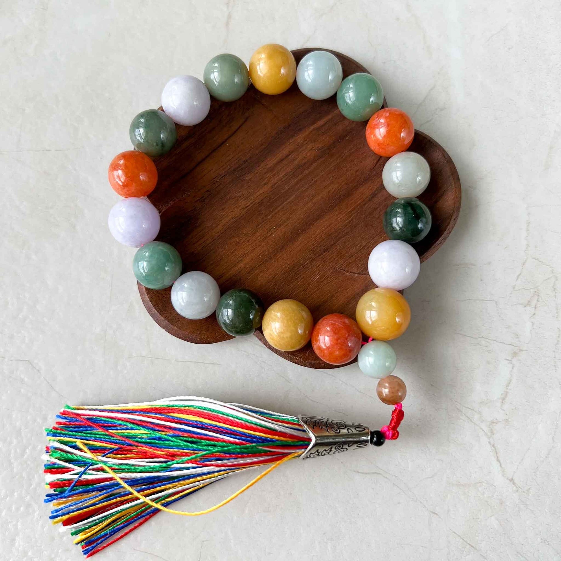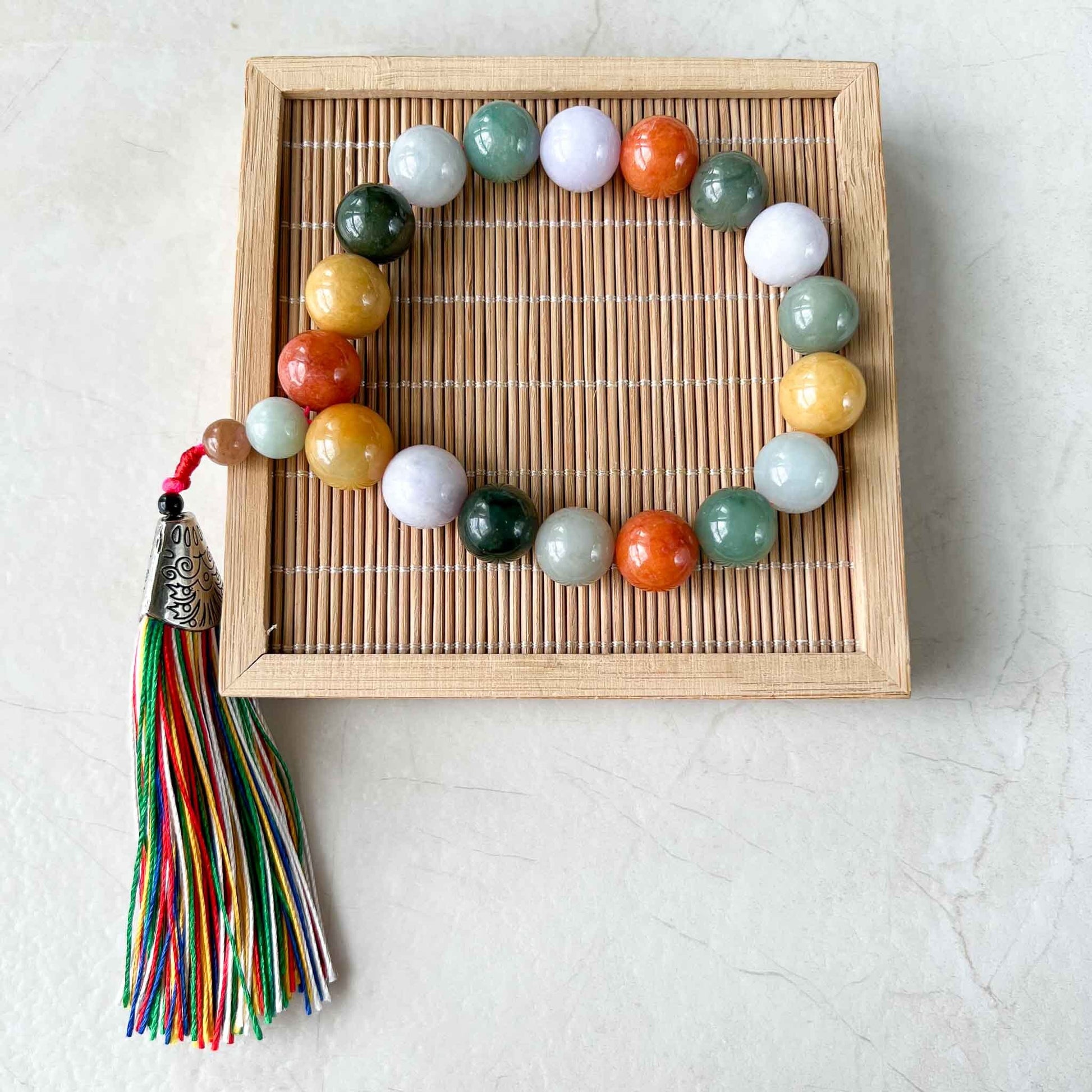 This mala prayer beaded necklace is used by many cultures and religions to count and recite mantras. There are 18 beads + two decorative beads. The mantras are recited and counted by bead. The prayer maybe repeated multiple times as well. This mala beaded bracelet is crafted from the best jadeite jade. Many believe jade will provide spiritual energy to its user as they recite the mantra. This prayer bracelet is high grade jade and is certainly impressive because of its multi-color beads.