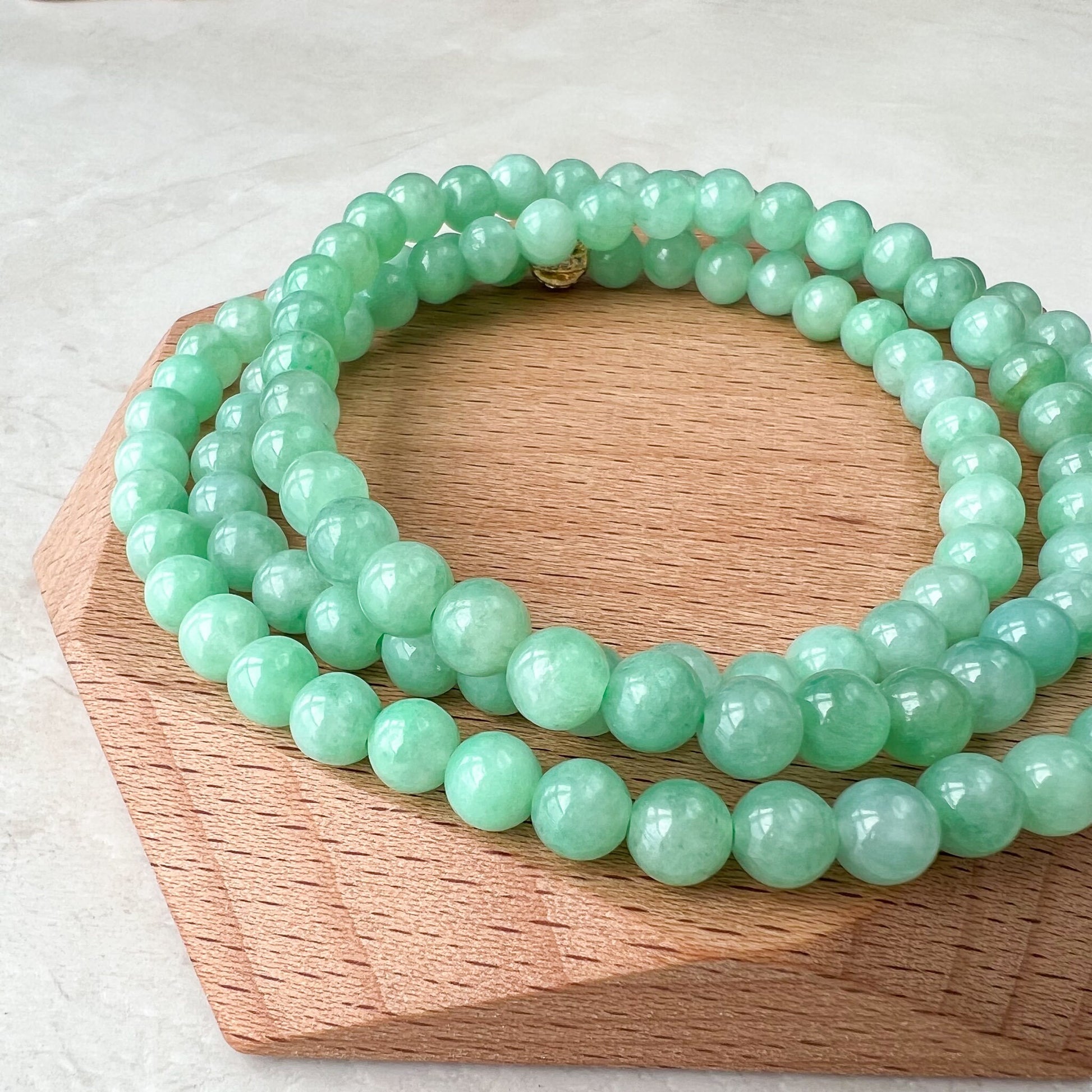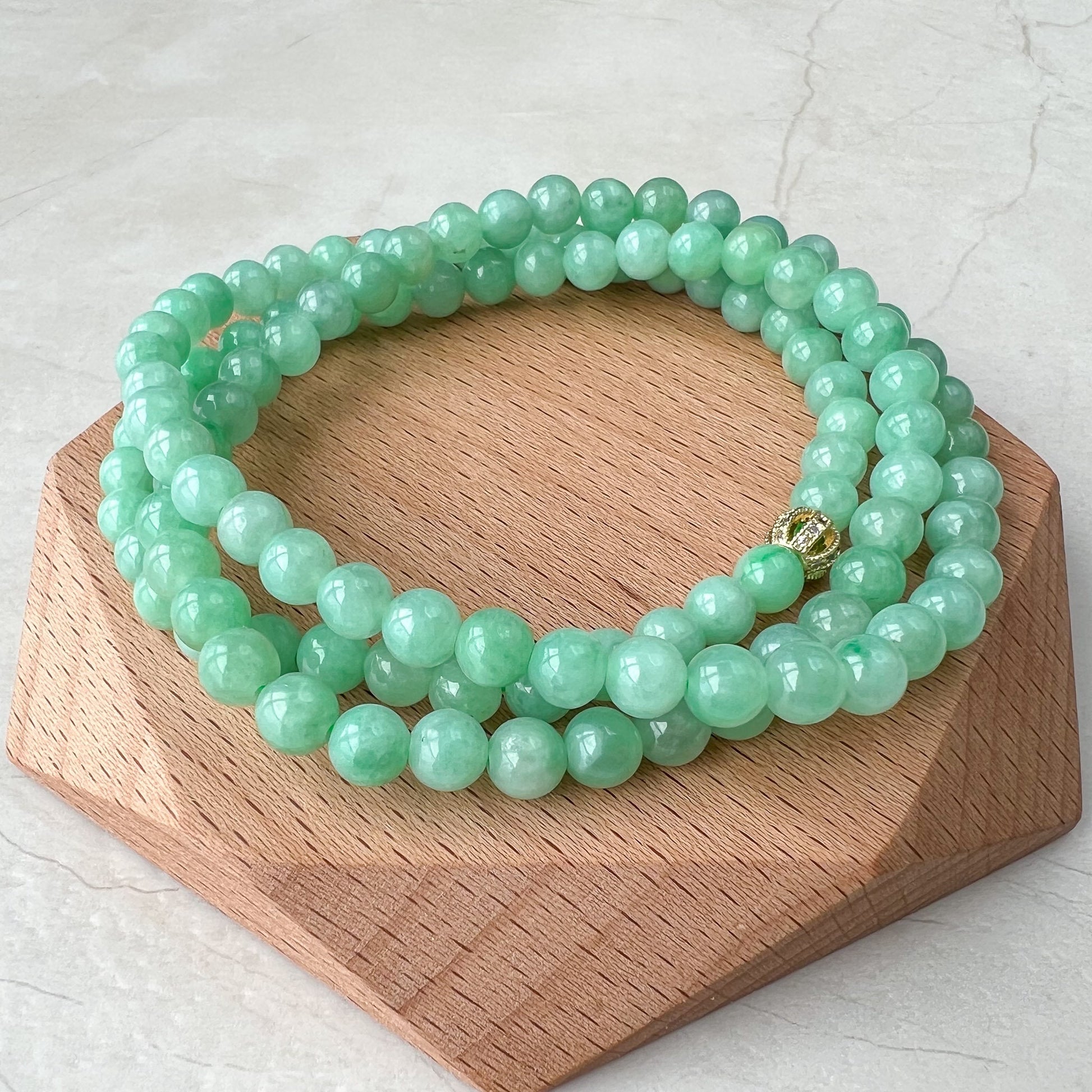 BRACELET/NECKLACE: The necklace is crafted and beaded with 111 jadeite jade beads and a distinct gold-plated bead. Note: this is not a 108 mala prayer bead bracelet. This can be used as a necklace as well. If you need to convert it to 108 mala bracelet, message us. The beads are considered small though.