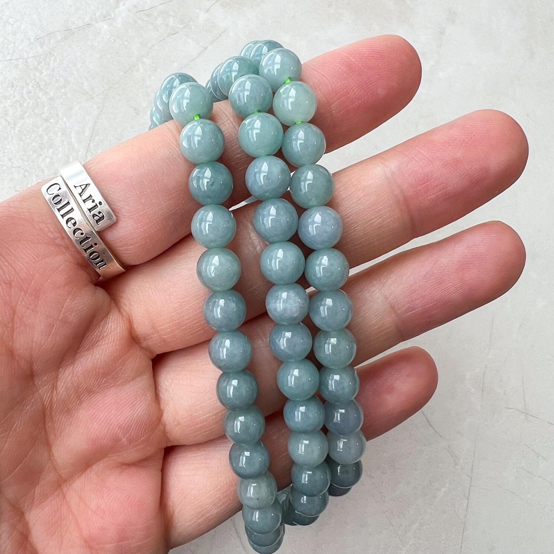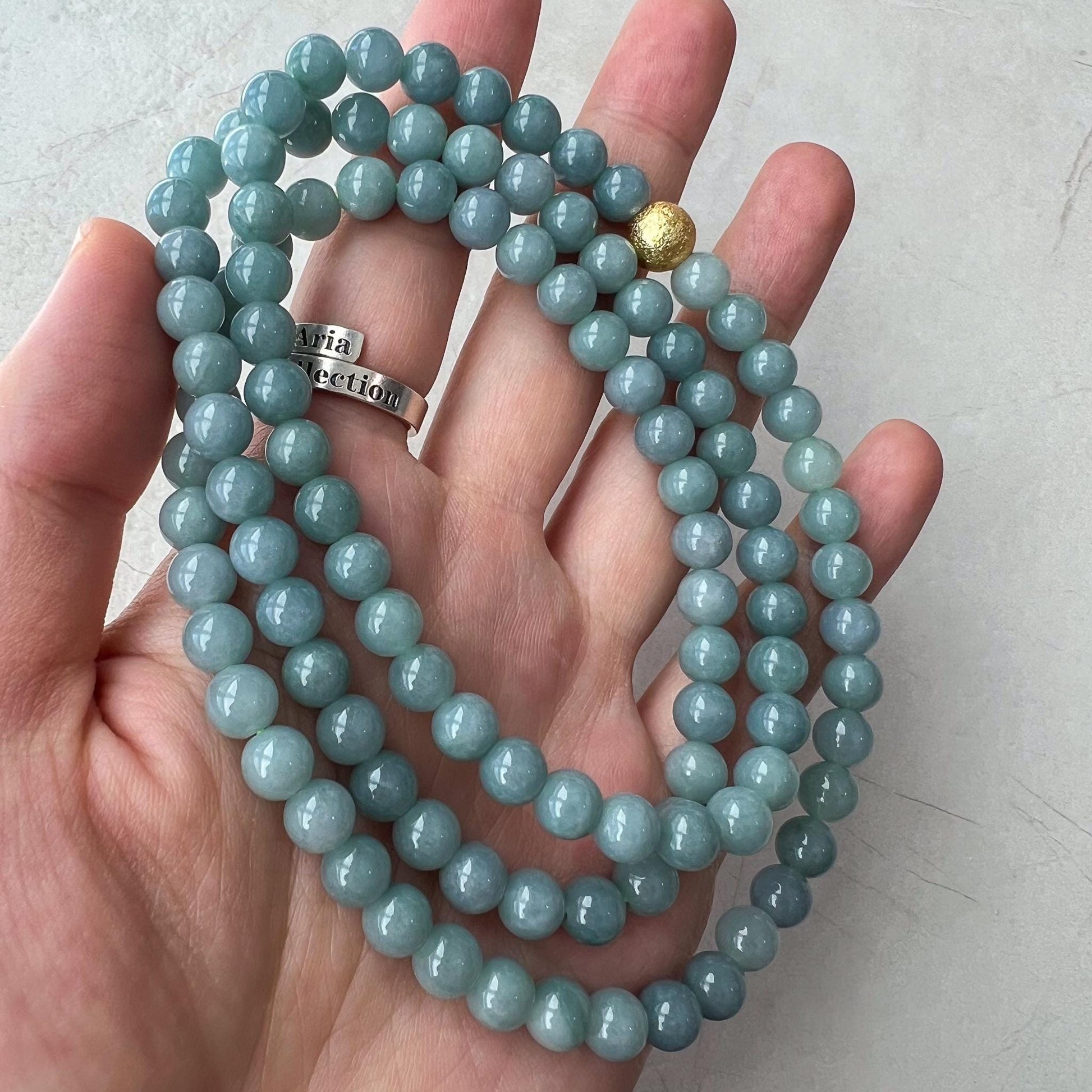 JADE COLOR: The beads have beautiful light green/green blue tones. The beads are individually carved so there may be slight differences between all of them. They do not come from a manufactured machine, so they will be slight variance in size. Individually carving the beads creates more texture, variance, and authenticity in the mala necklace.