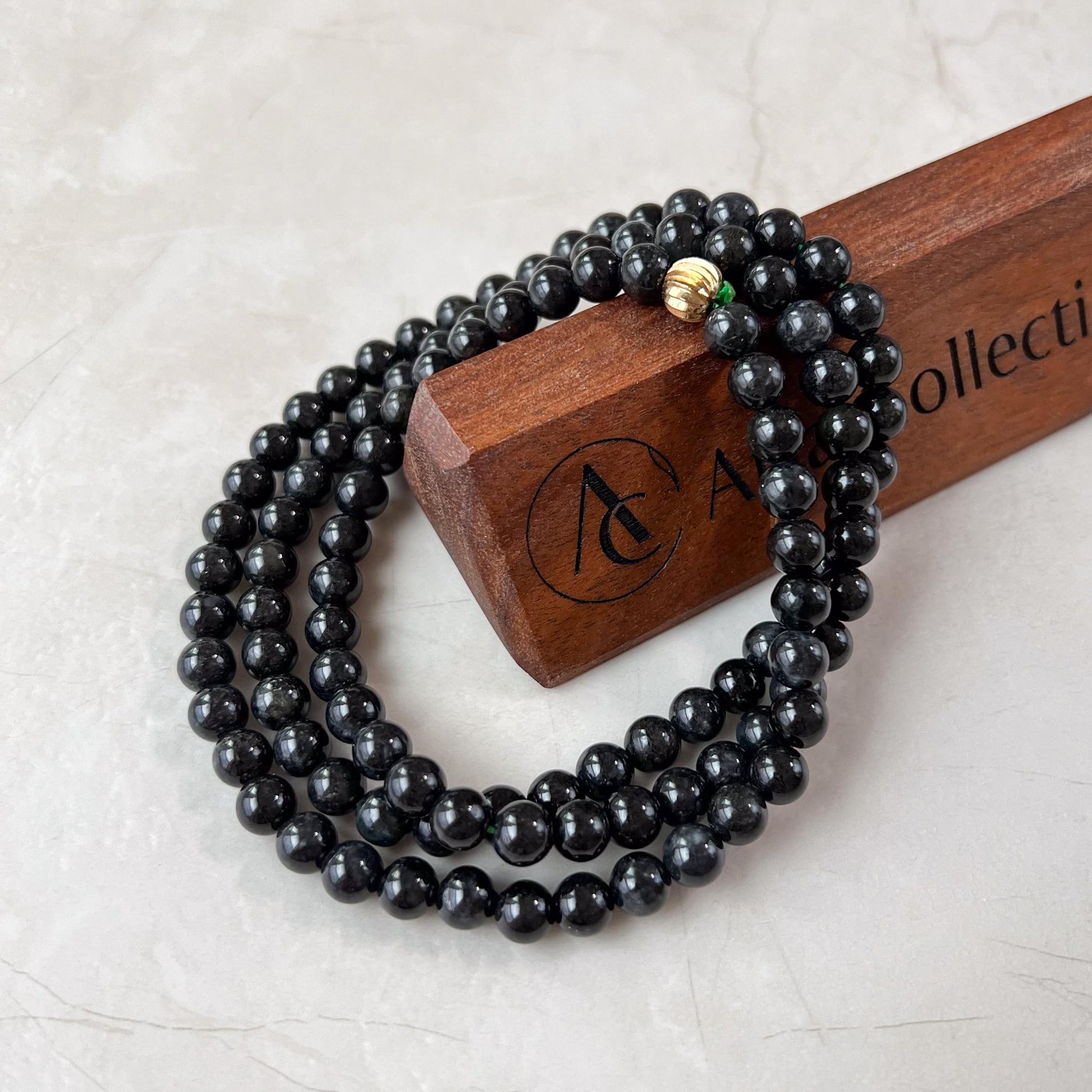 NECKLACE: The necklace/prayer bead/bracelet is crafted and beaded with 108 jadeite jade beads and a distinct gold-plated bead marker bead.