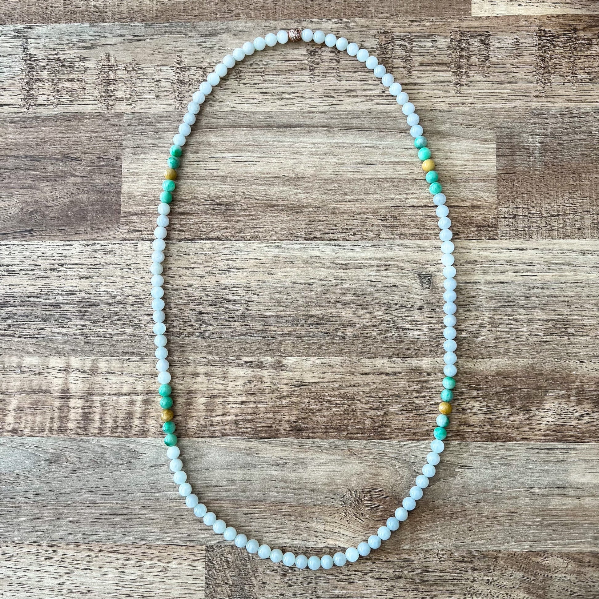 JADE COLOR: The beads have beautiful green, white, yellow tones that have are semi-translucent, a very beautiful quality piece of jade. The beads are hand carved so there may be slight differences between all of them. They do not come from a manufactured machine, so they will not be perfectly round. Hand carving the beads creates more texture in the mala necklace. It also provides a more natural and rustic feel to the necklace.