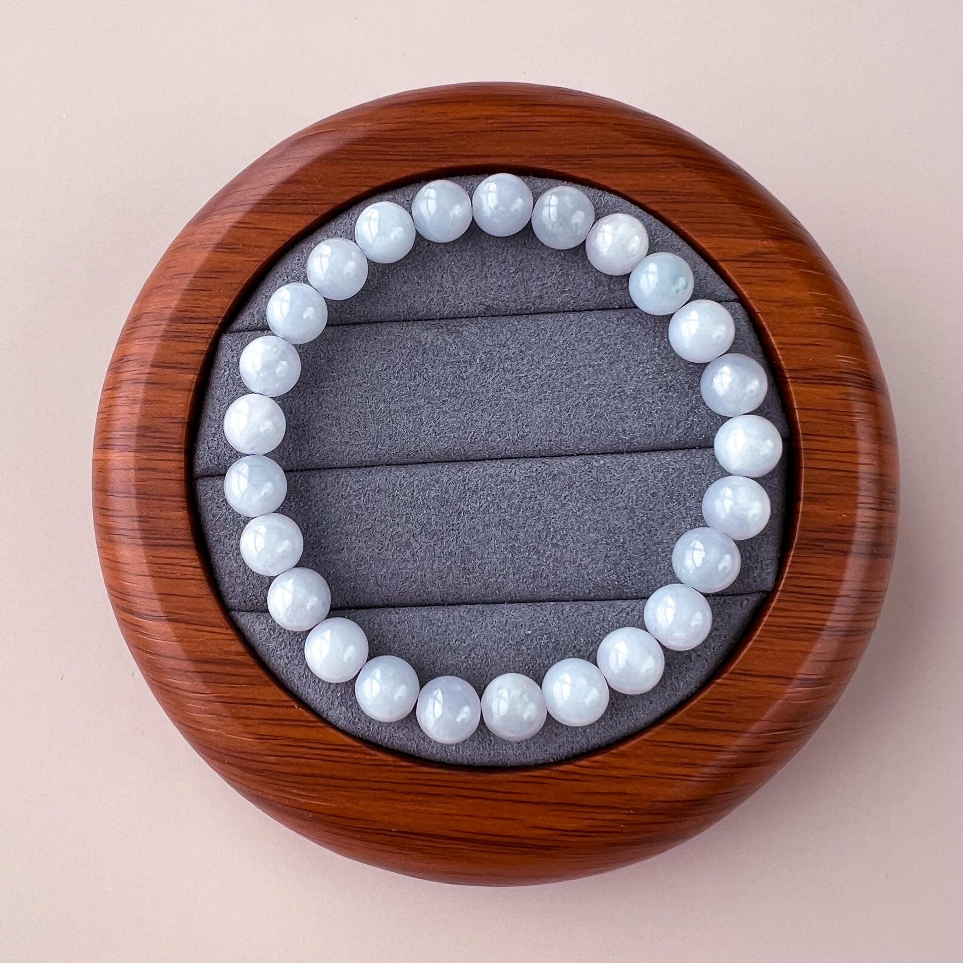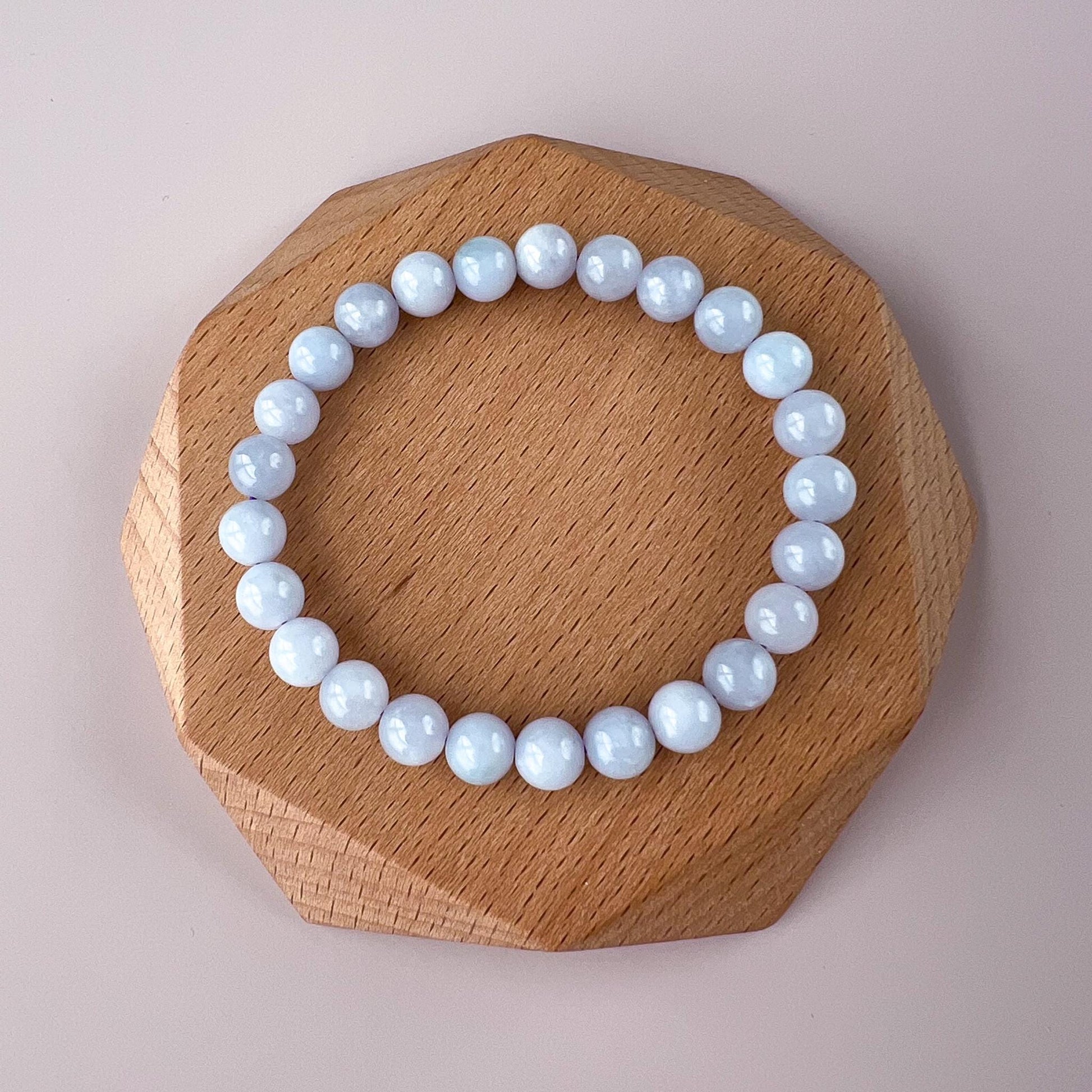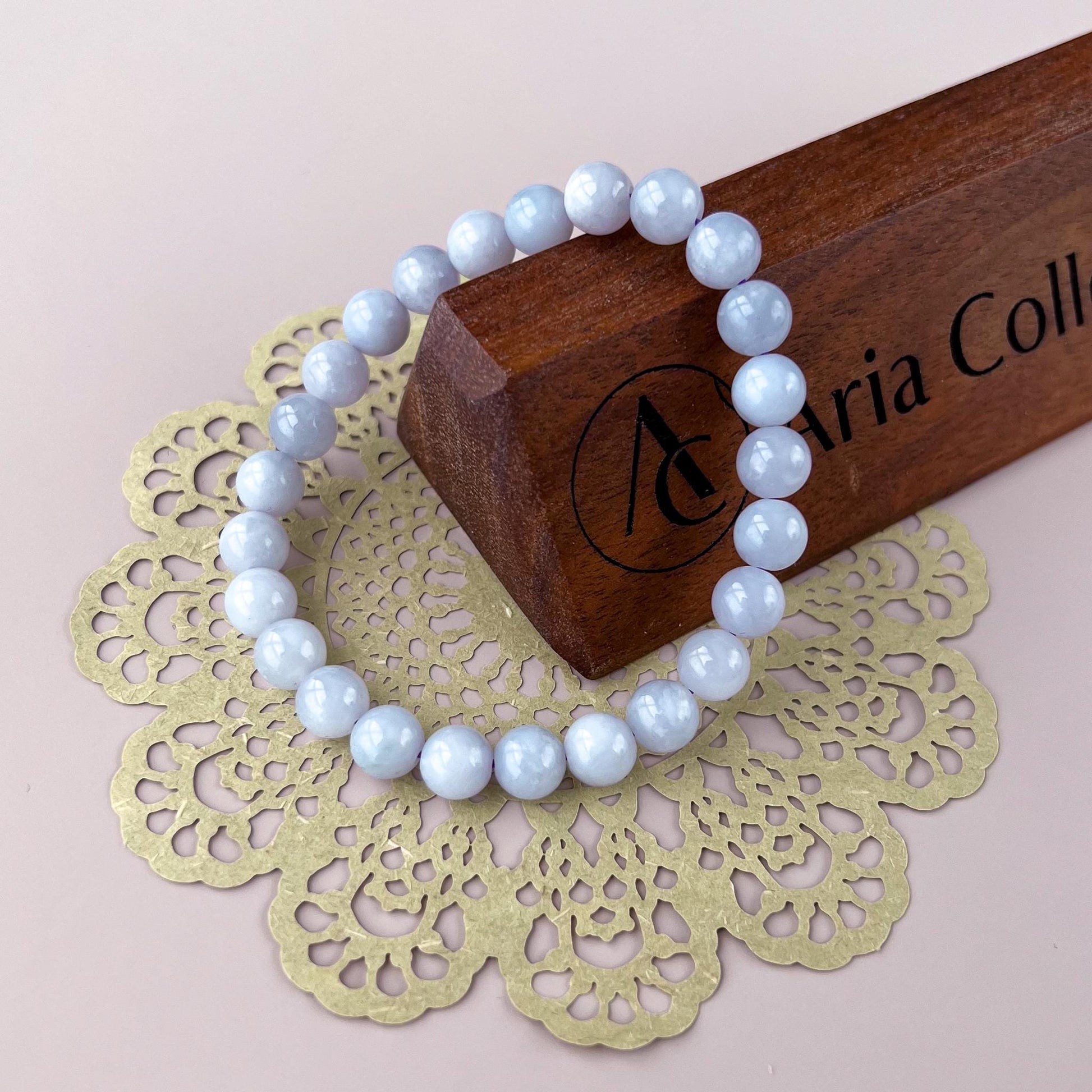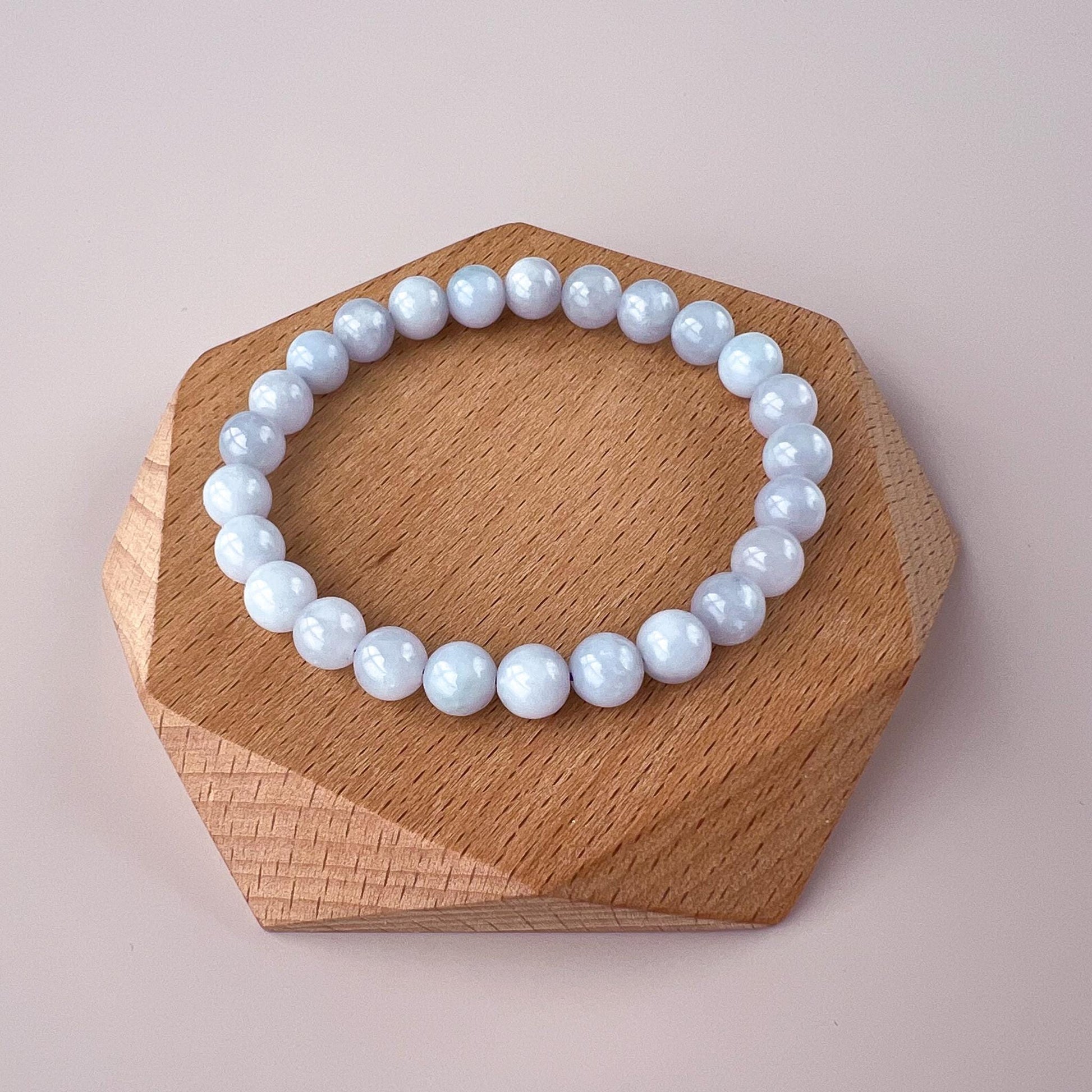 JADE COLOR: Semi-translucent purple lavender beads The beads are hand carved so there may be slight differences between all of them. They do not come from a manufactured machine, so they will not be perfectly round. Hand carving the beads creates more texture in the bracelet.