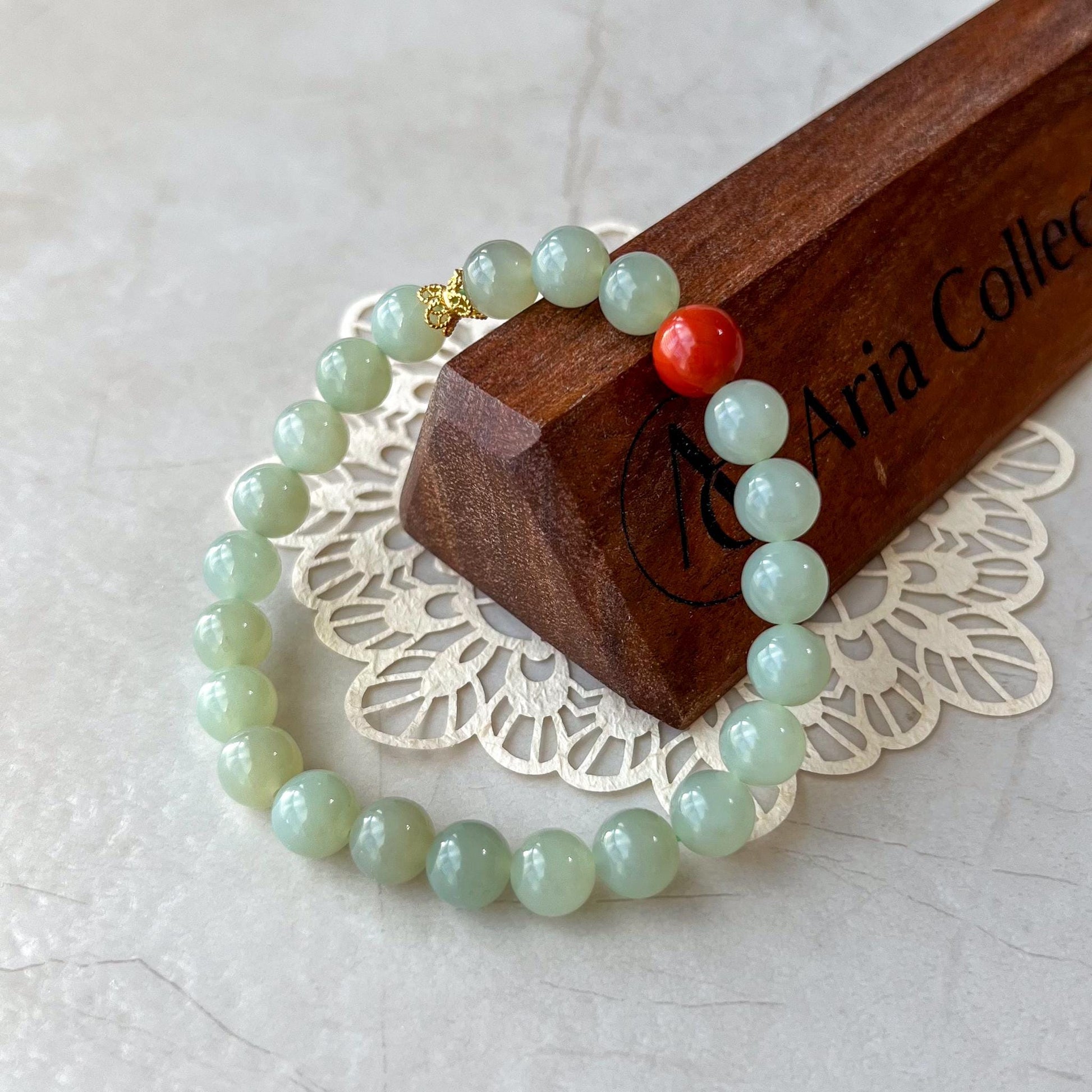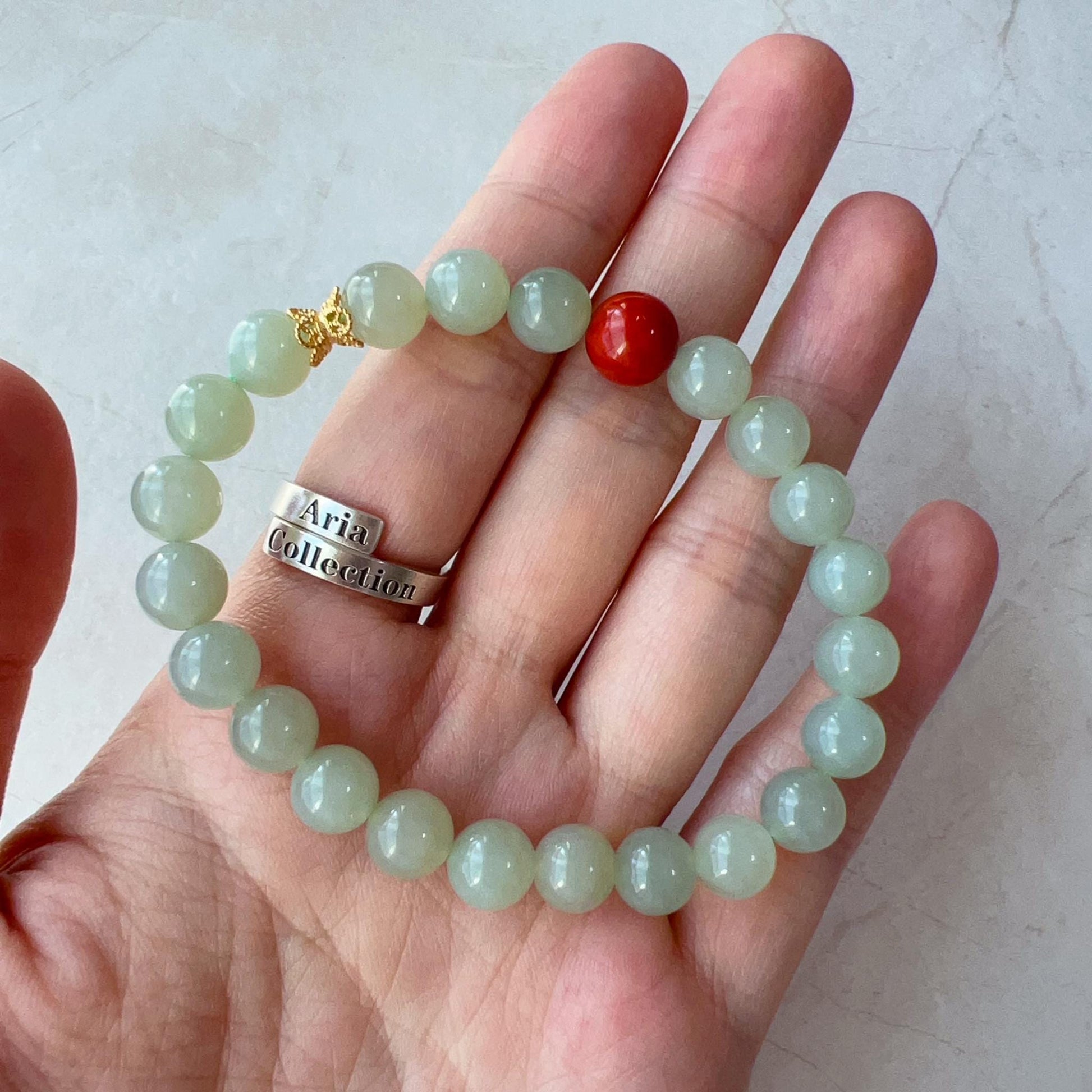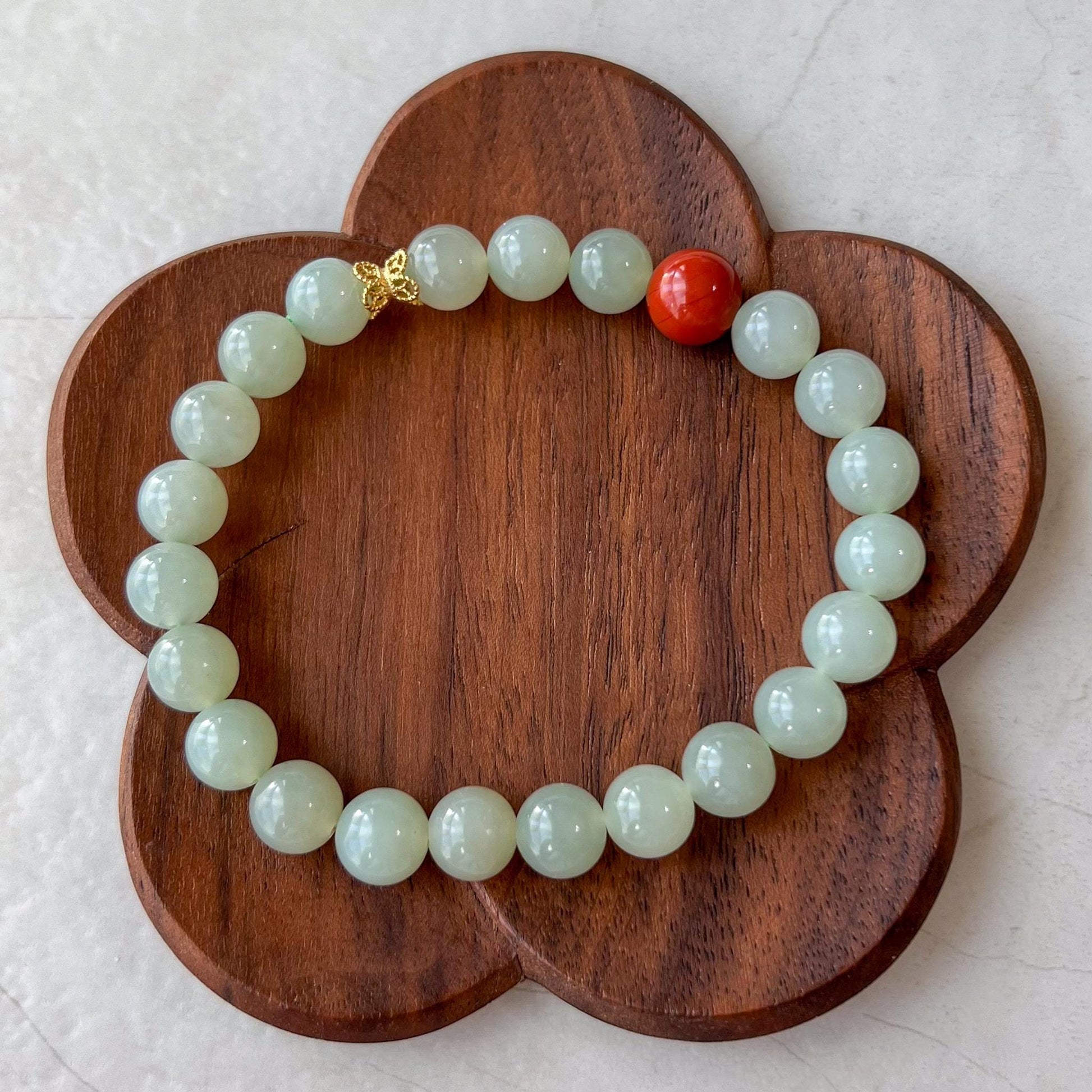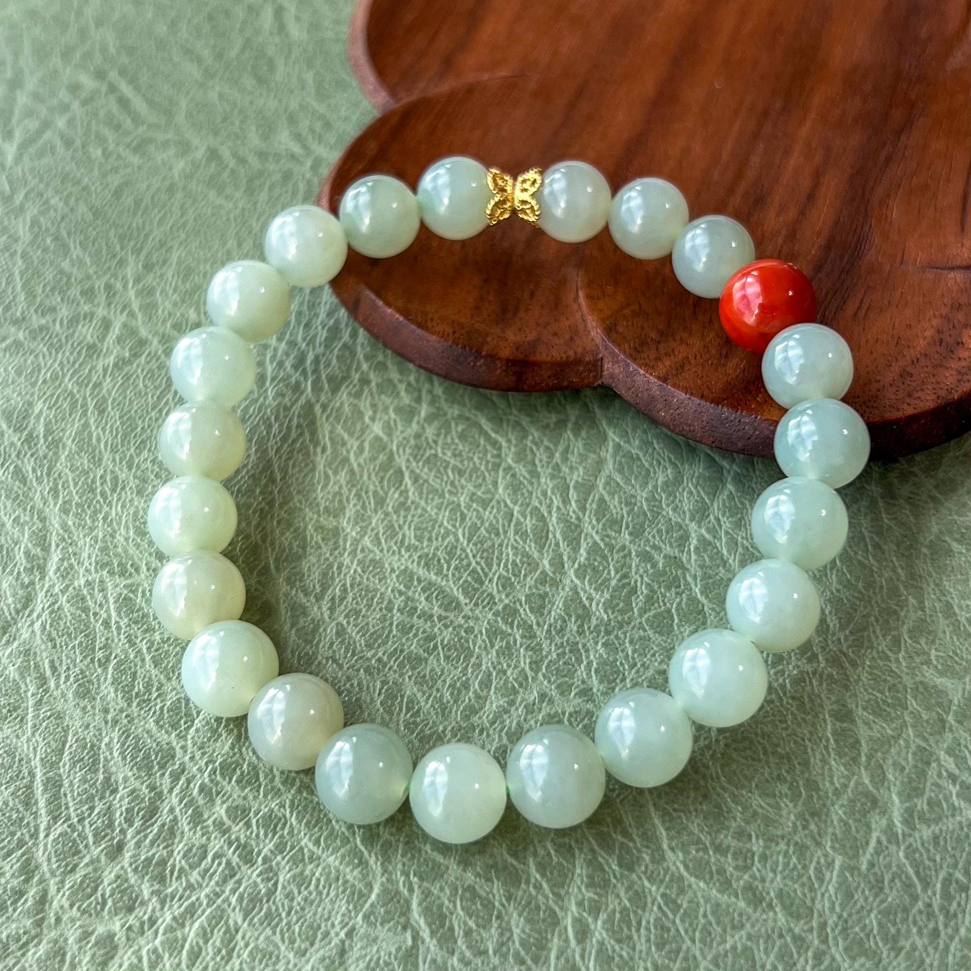 Light green beads are natural nephrite jade. The red accent bead is Southern Red Agate, which is prized for its rich red color, which ranges from bright cherry red to deep, almost brownish-red hues. It is primarily mined in China, notably in the Sichuan and Yunnan provinces. The vibrant red color of this agate is due to its high iron content, and it often displays a range of warm, fiery tones.