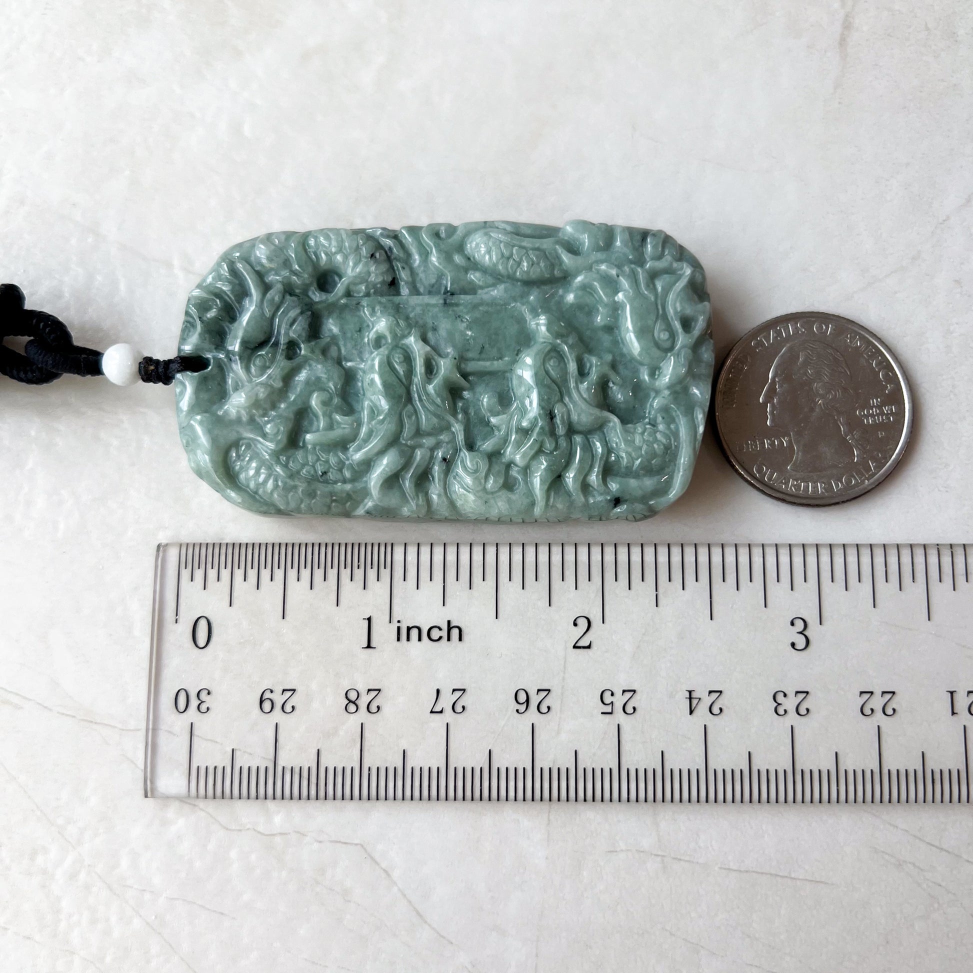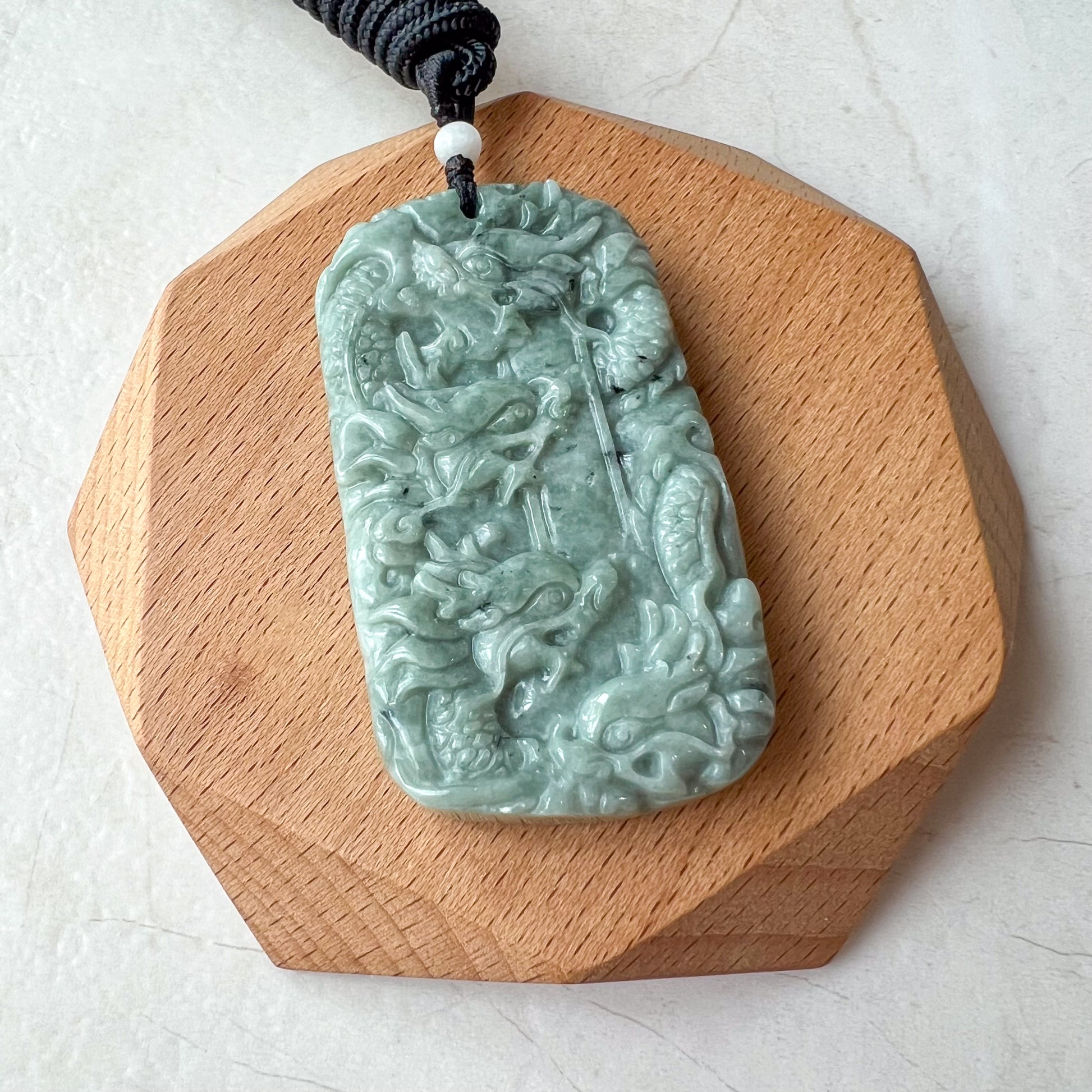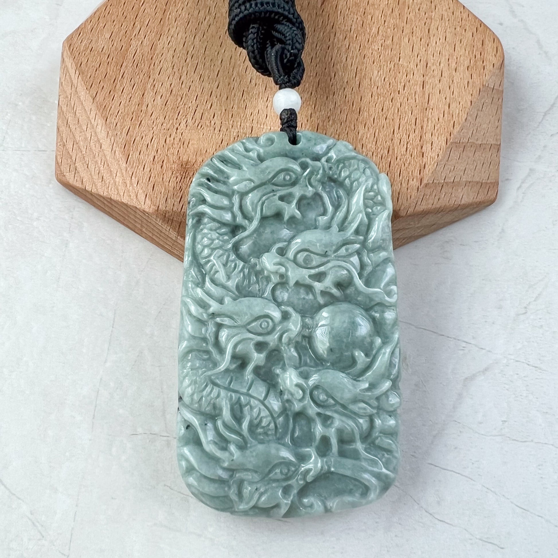 CARVING: The pendant is carved in the form of 9 dragons. It is a rare dual sided carving. There are 5 dragons on one side and another 4 on the other. The nine dragons are said to protect its wearer from harm. The carving detail is exquisite.