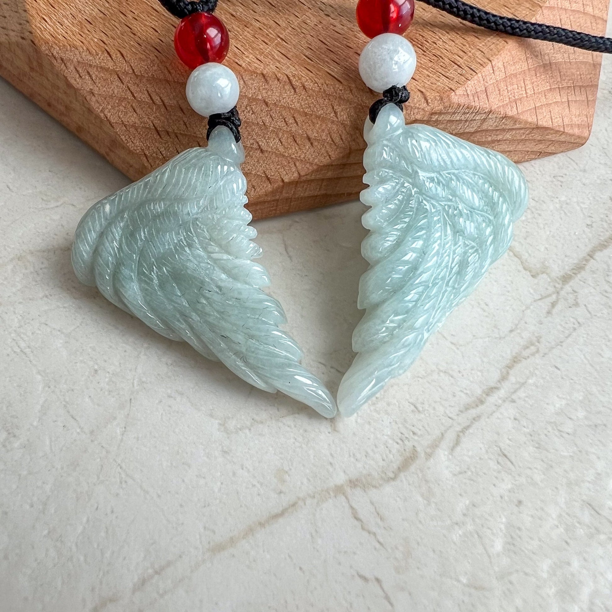 DESCRIPTION: A meticulously hand-carved pair of jade angel wings, each feather intricately detailed, showcasing the masterful artistry and precision of the craftsman. The jade used in these wings is of a high-quality, with subtle variations in shading that add depth and realism to the feathers.