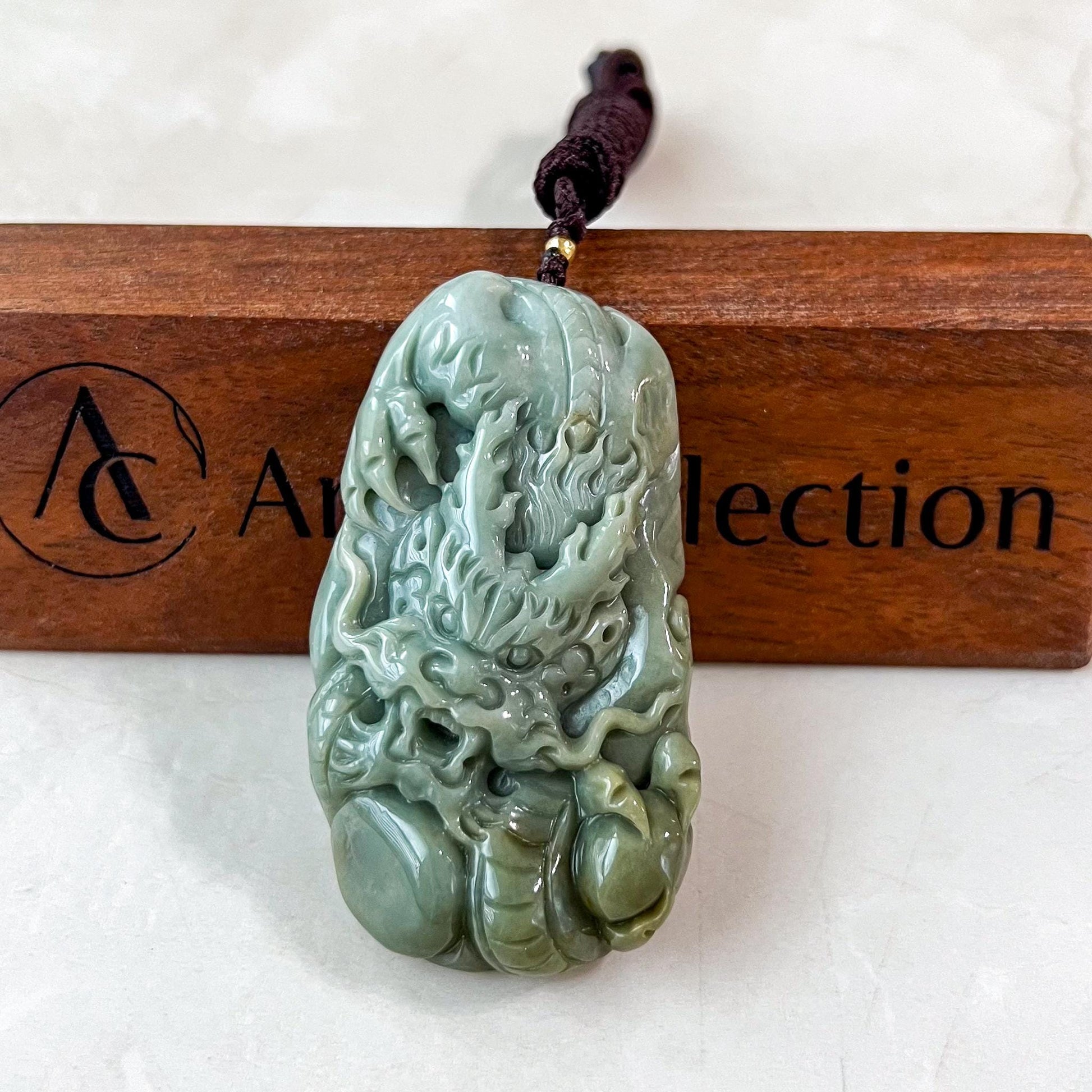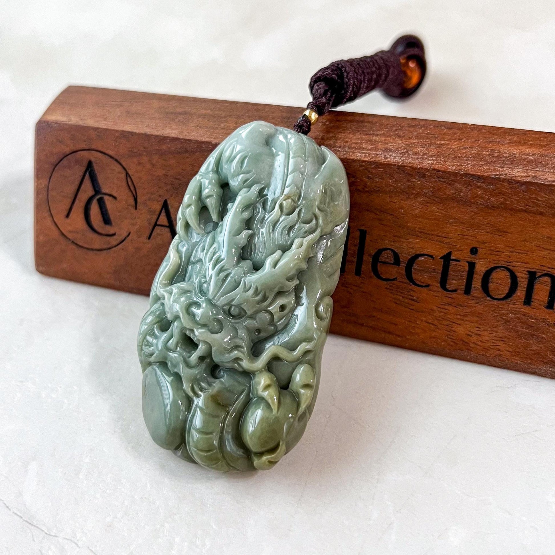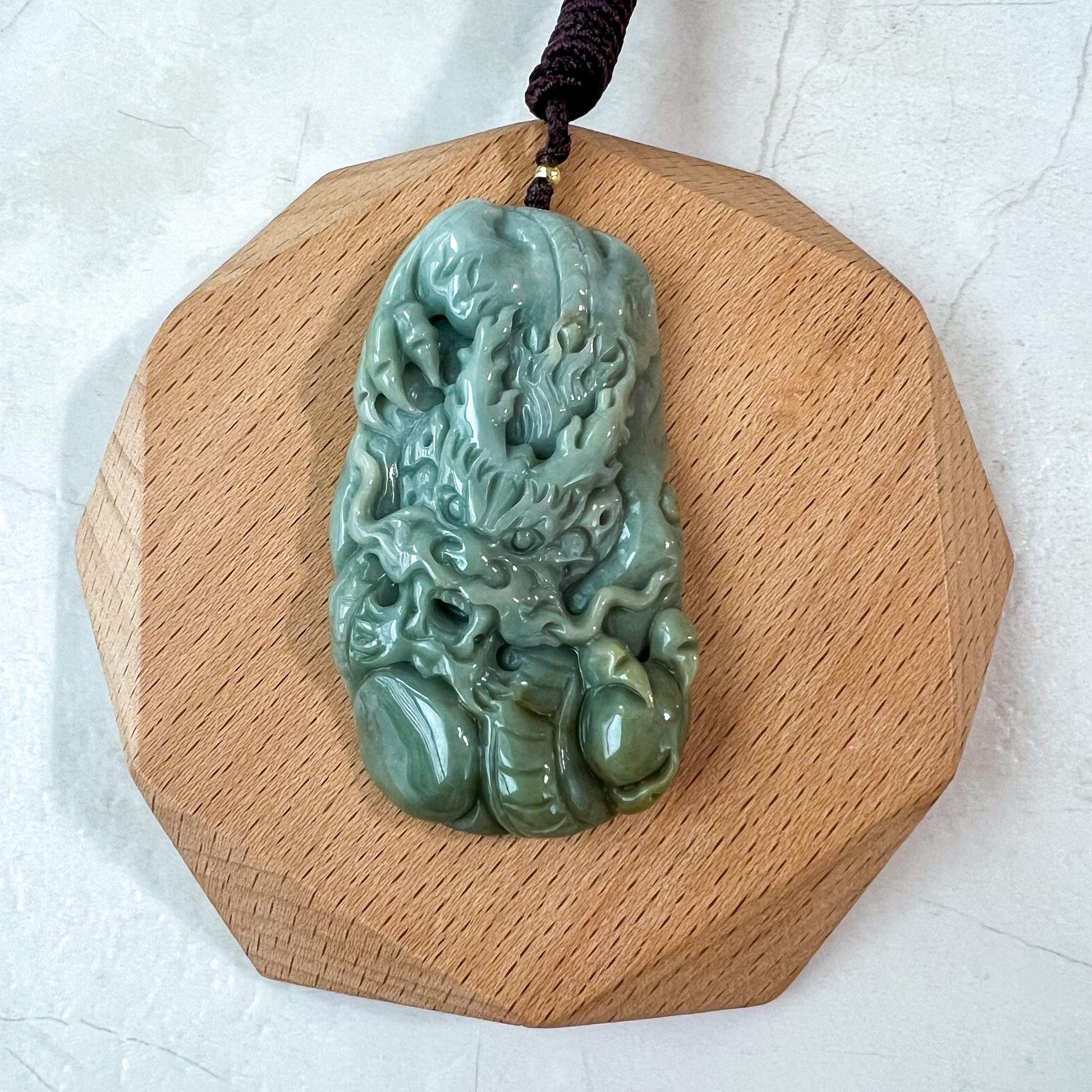 On the back of the pendant, fine details continue, with subtle carvings that reflect the dragons flowing energy and endless power, making it a true 360-degree piece of wearable art. The natural green jades translucency, combined with its rich tones, conveys a sense of prosperity, balance, and good fortune, key attributes associated with the mythical dragon in Eastern culture.