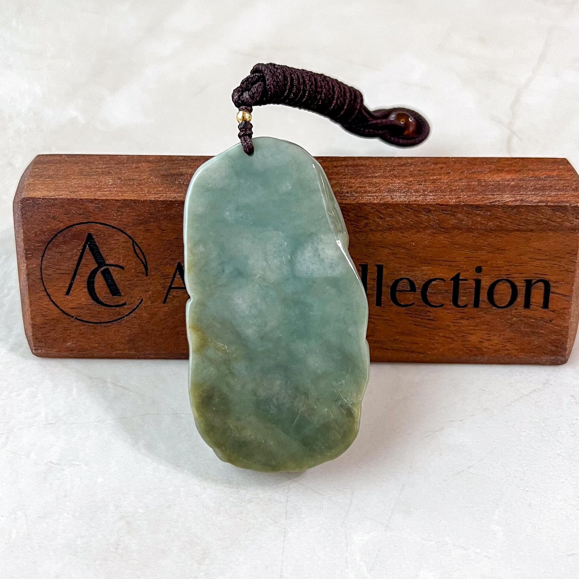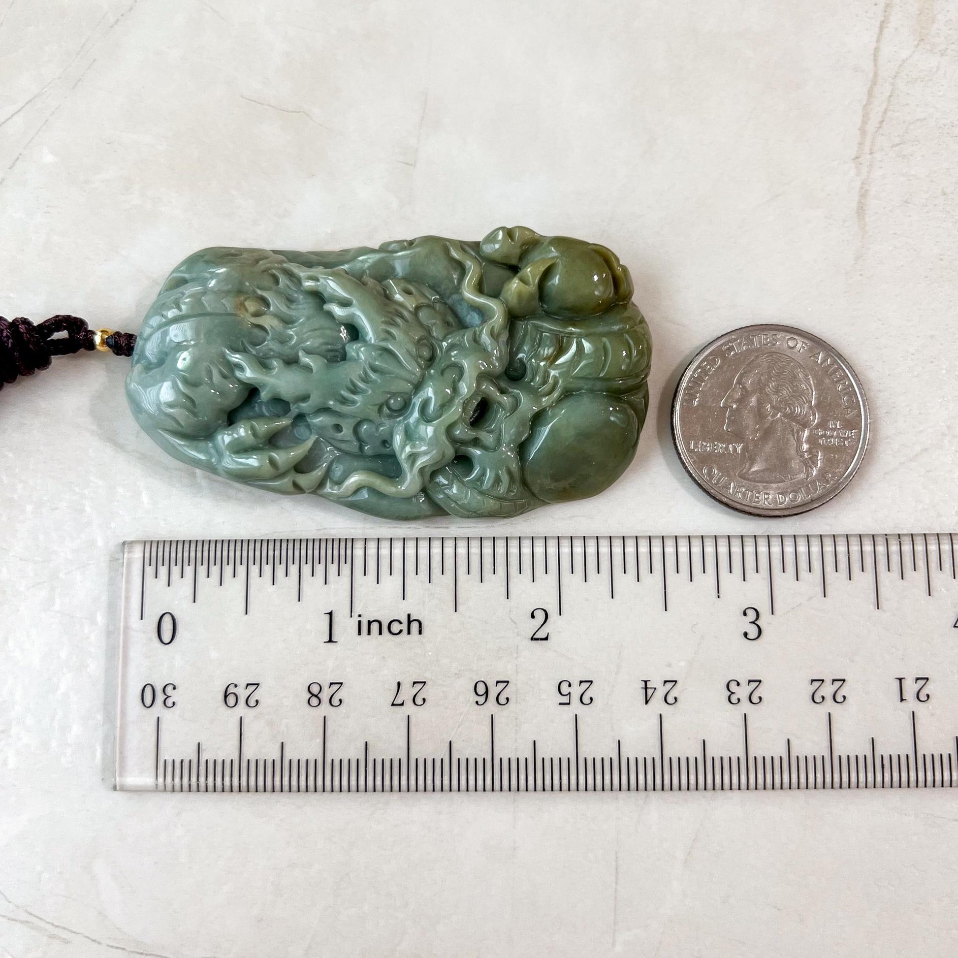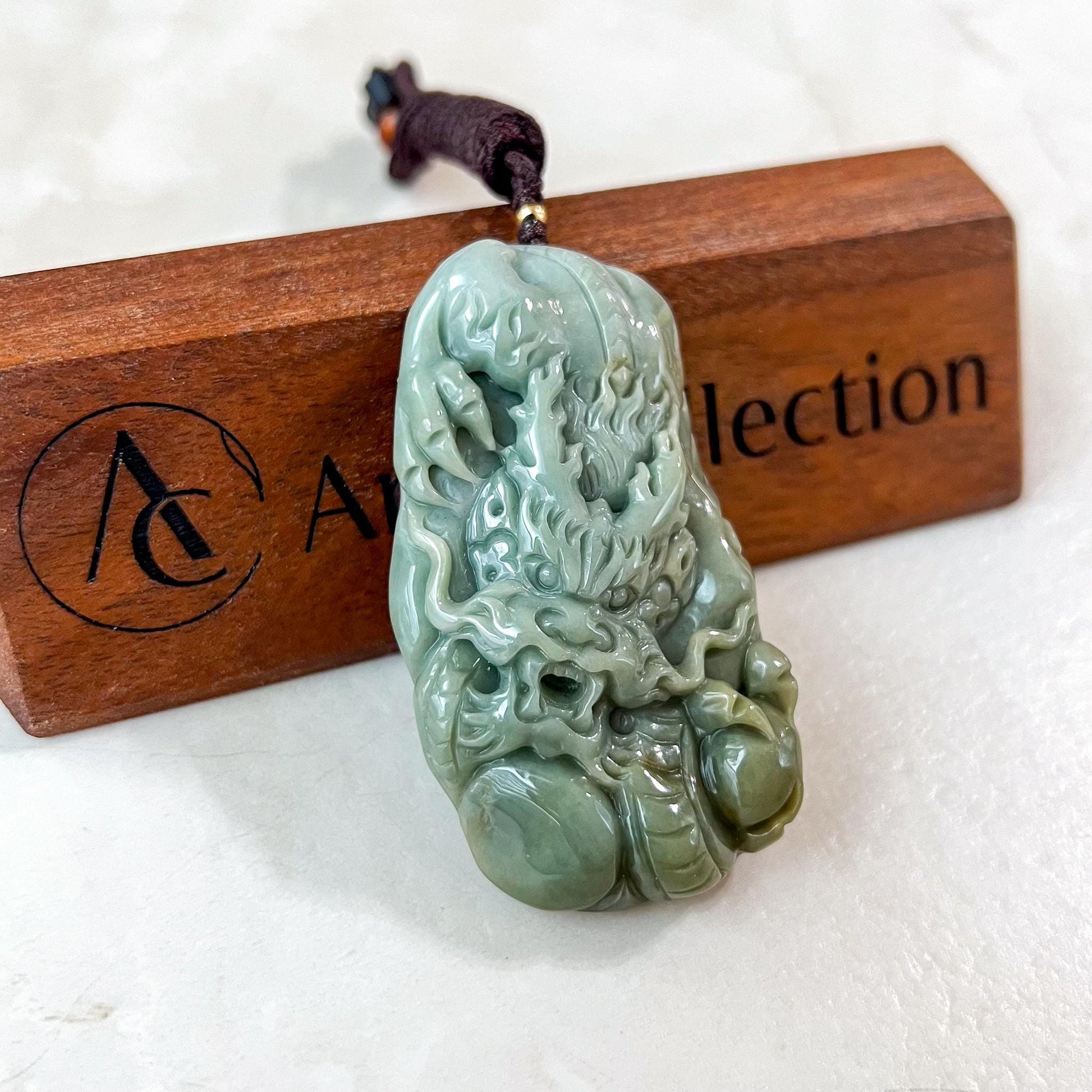 On the back of the pendant, fine details continue, with subtle carvings that reflect the dragons flowing energy and endless power, making it a true 360-degree piece of wearable art. The natural green jades translucency, combined with its rich tones, conveys a sense of prosperity, balance, and good fortune, key attributes associated with the mythical dragon in Eastern culture.