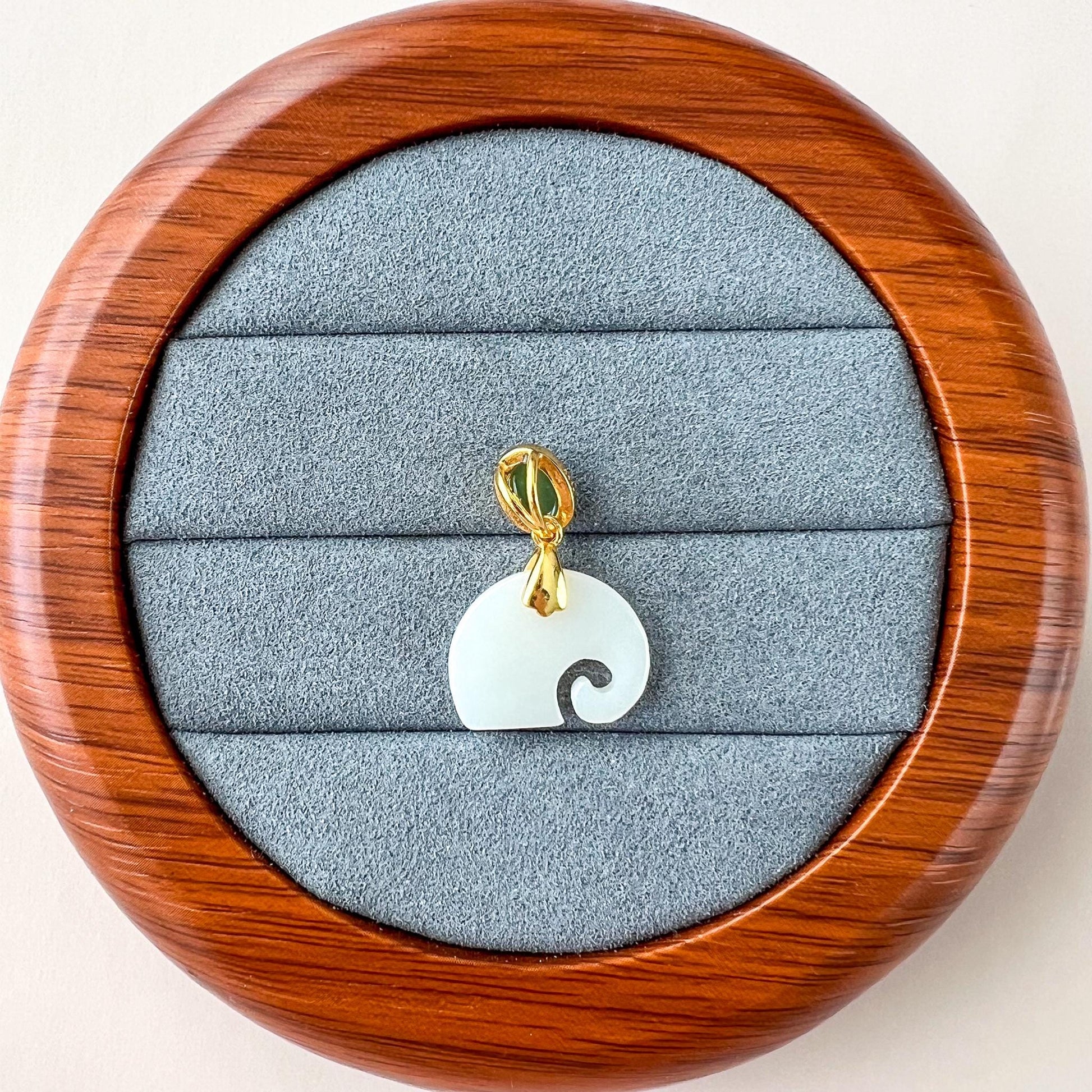 DESCRIPTION: This graceful pendant features a soft white jade elephant, a symbol of protection, wisdom, and good fortune. The gentle curl of the carving represents a peaceful, uplifting spirit, while the vibrant green jade cabochon and gold-tone accent add a touch of elegance and prosperity. Crafted from natural jade, each piece carries its own unique character, offering a meaningful charm believed to bring blessings and positive energy to its wearer. Perfect for everyday wear or gifting with intention.