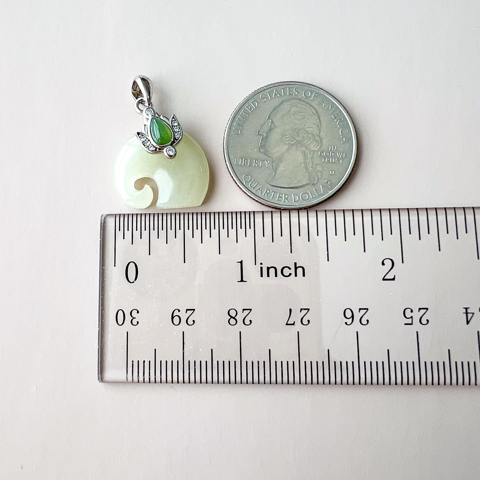 DESCRIPTION: This graceful pendant features a soft white jade elephant, a symbol of protection, wisdom, and good fortune. The gentle curl of the carving represents a peaceful, uplifting spirit, while the vibrant green jade cabochon and gold-tone accent add a touch of elegance and prosperity. Crafted from natural jade, each piece carries its own unique character, offering a meaningful charm believed to bring blessings and positive energy to its wearer. Perfect for everyday wear or gifting with intention.