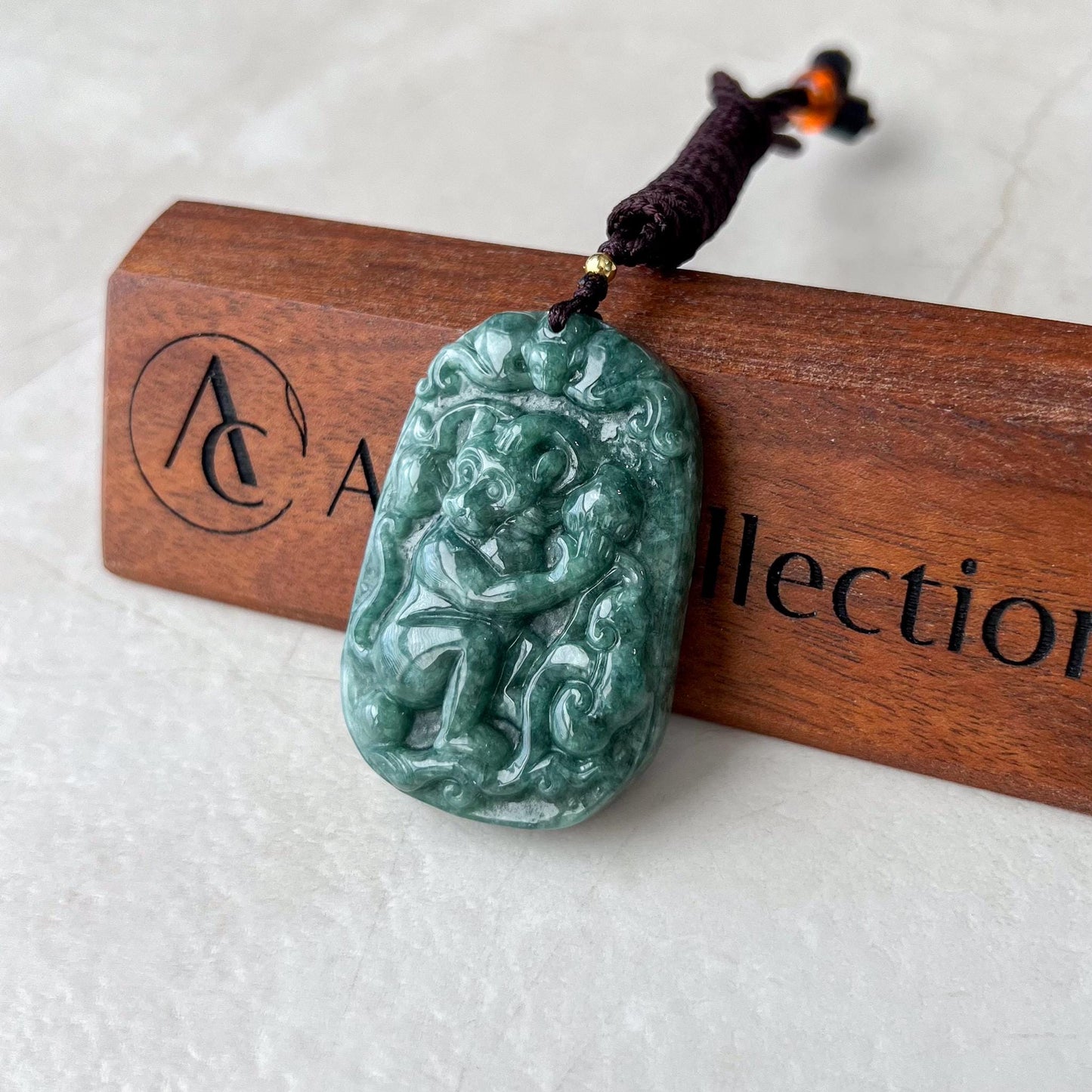 CARVING: This stunning hand-carved jade pendant features a vibrant green jadeite design, intricately depicting a playful monkey holding a peach, a traditional symbol of longevity, prosperity, and joy in Chinese culture. The pendant showcases masterful craftsmanship, with detailed carvings and a smooth, polished finish that highlights the natural beauty of the jadeite. The swirling ruyi cloud motif surrounding the monkey adds a fortune touch, enhancing its cultural significance and elegance. Perfect as a meaningful gift or a cherished addition to your collection, this pendant carries profound symbolism and timeless beauty.