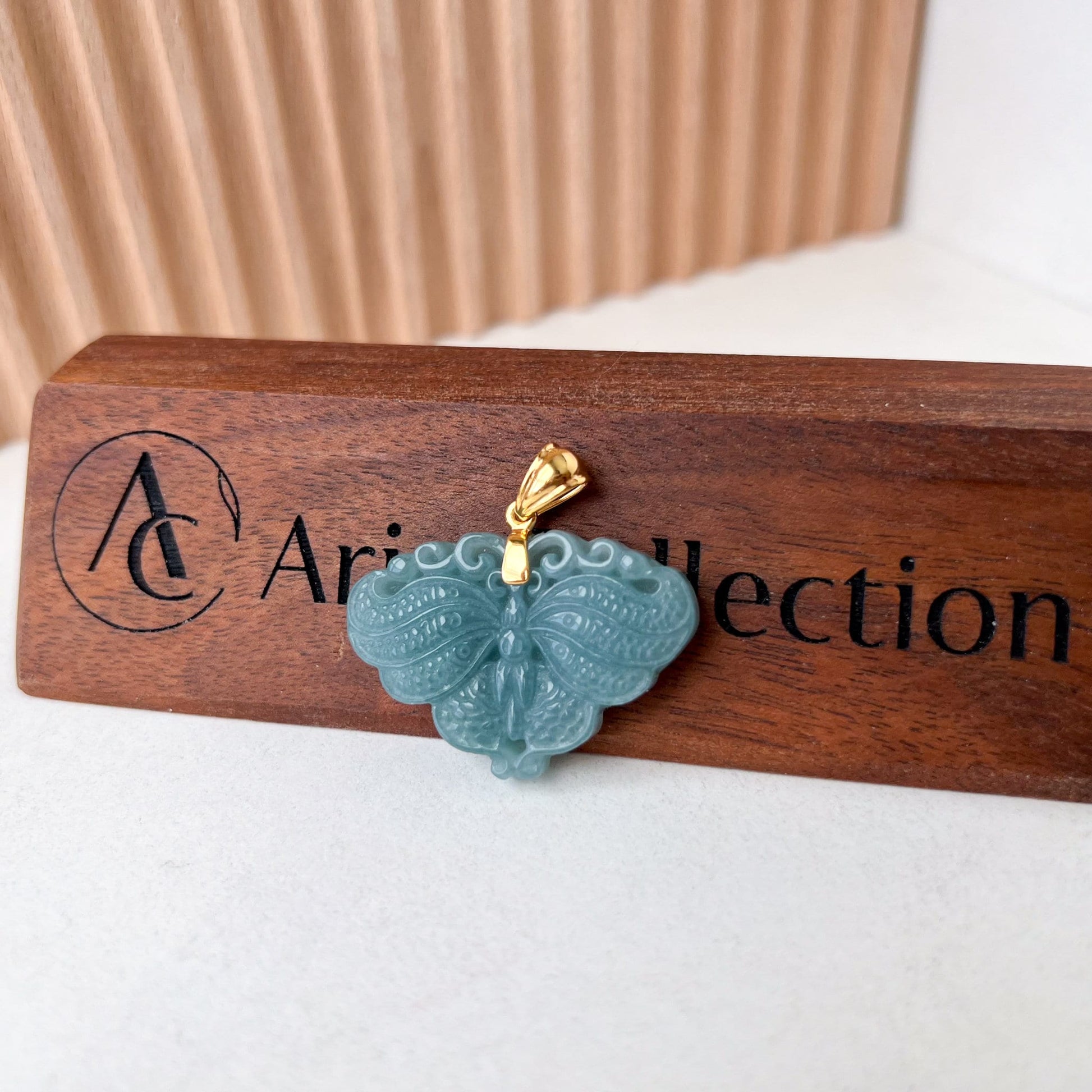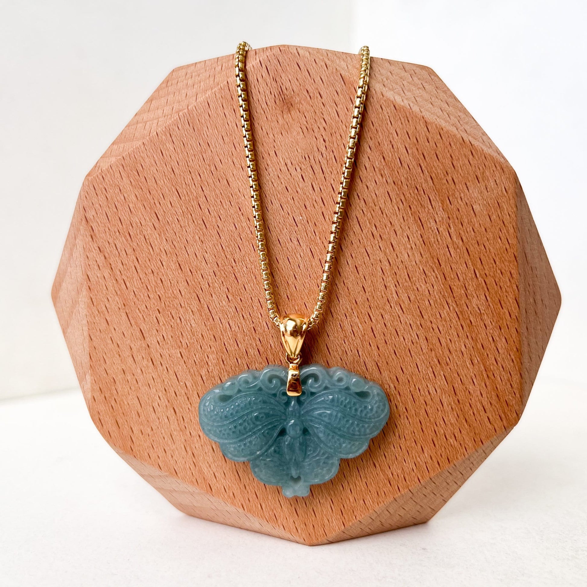 Green Jadeite Jade Butterfly Hand Carved Pendant with 18K Solid Gold Bail, SQ-0323-1701147182