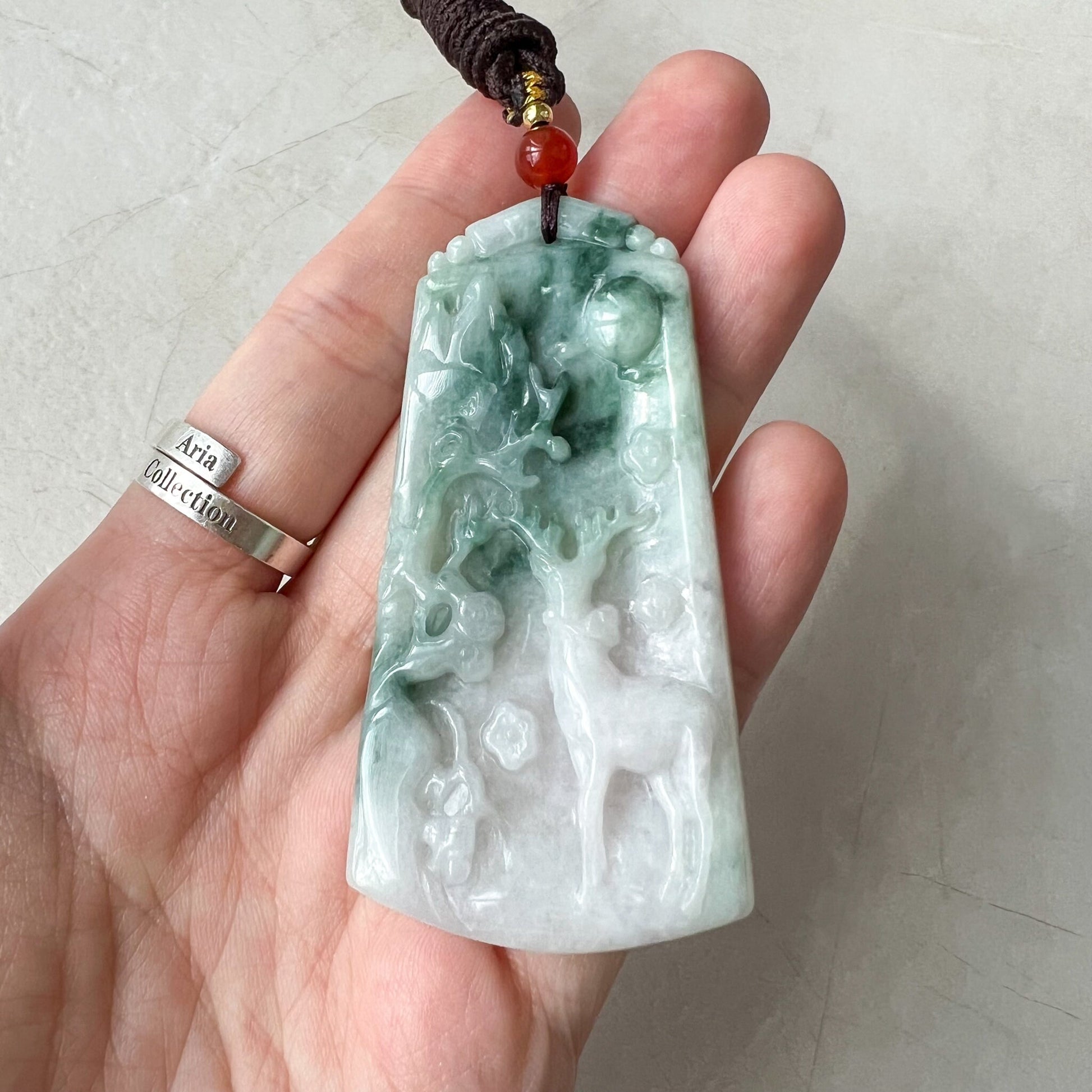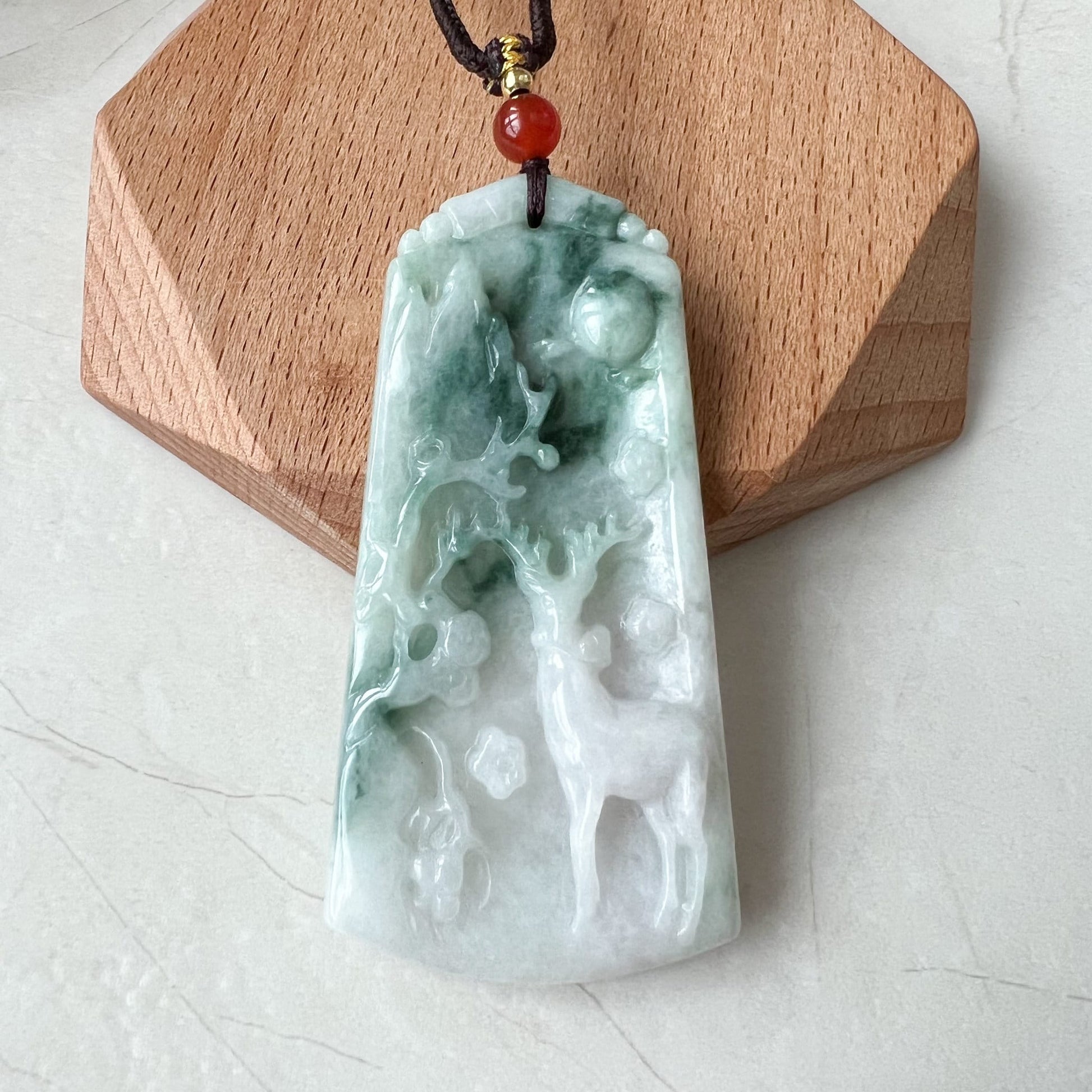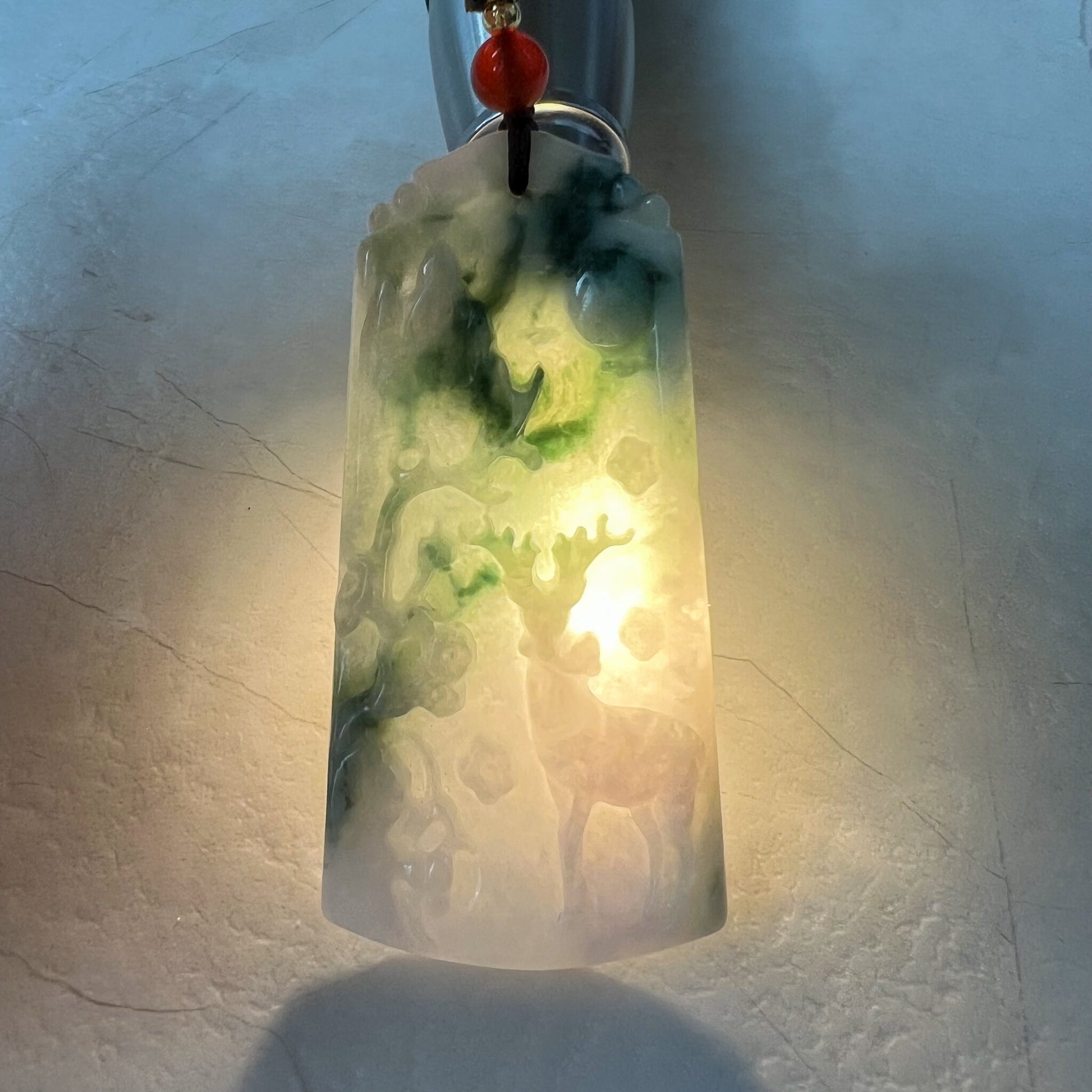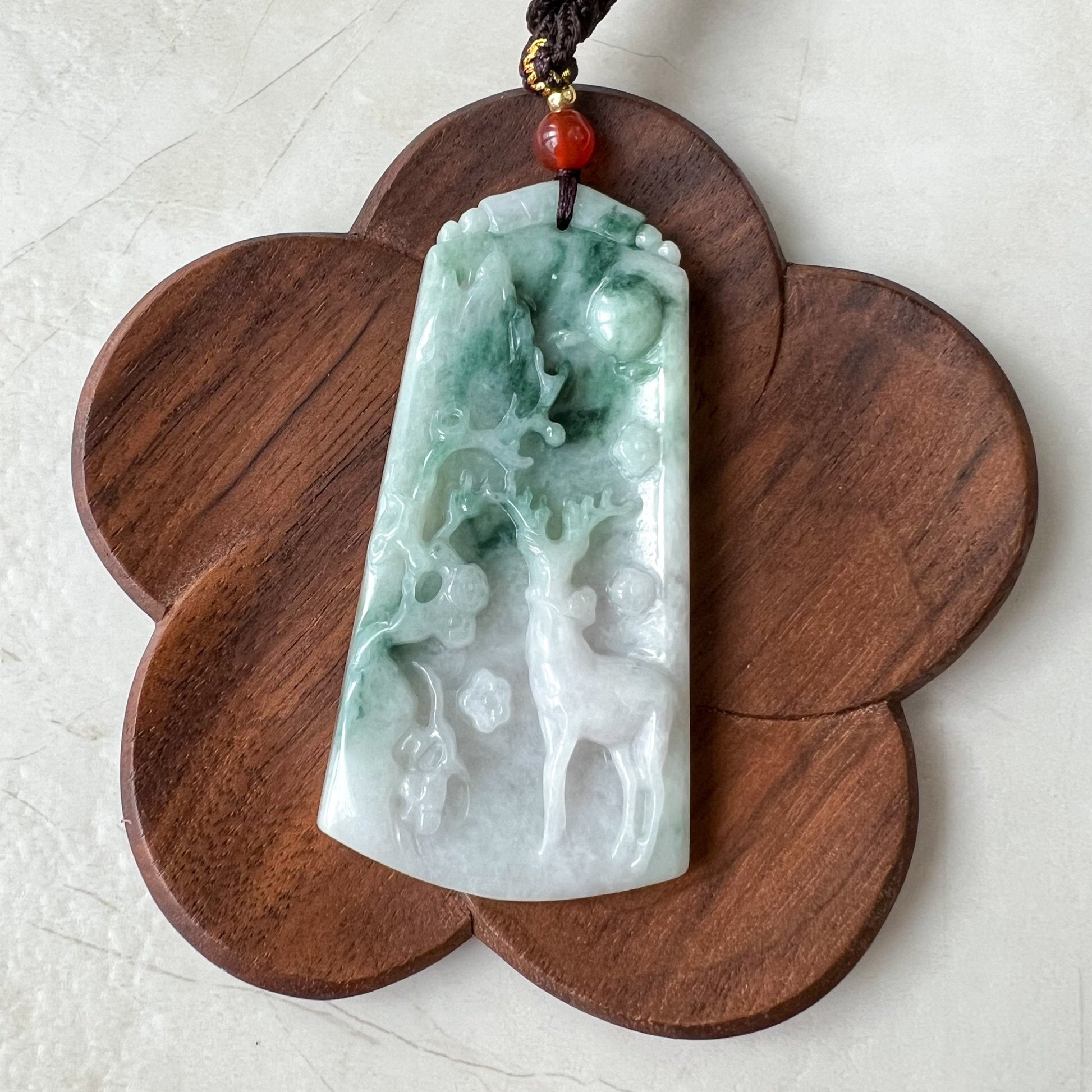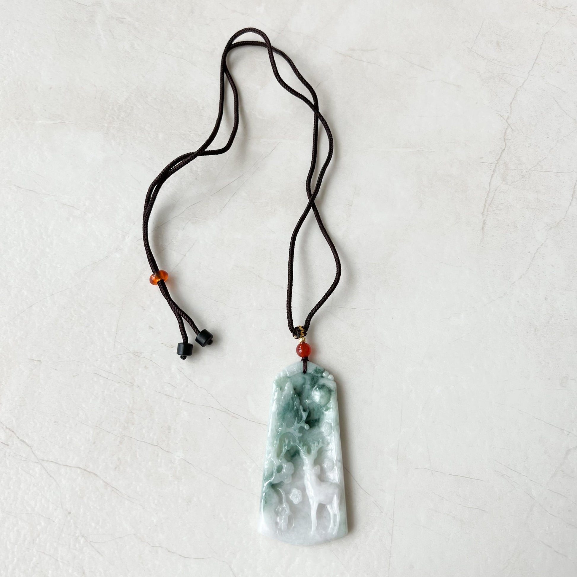 Green Jadeite Jade Deer in Forest Hand Carved Pendant Necklace, YJ-0722-0008298