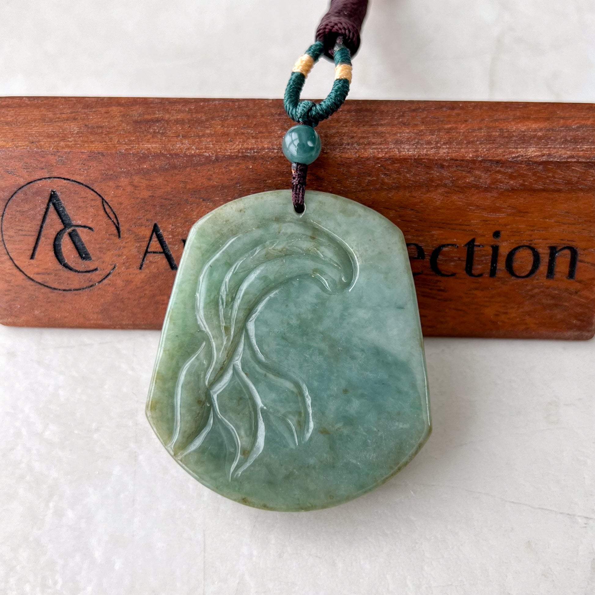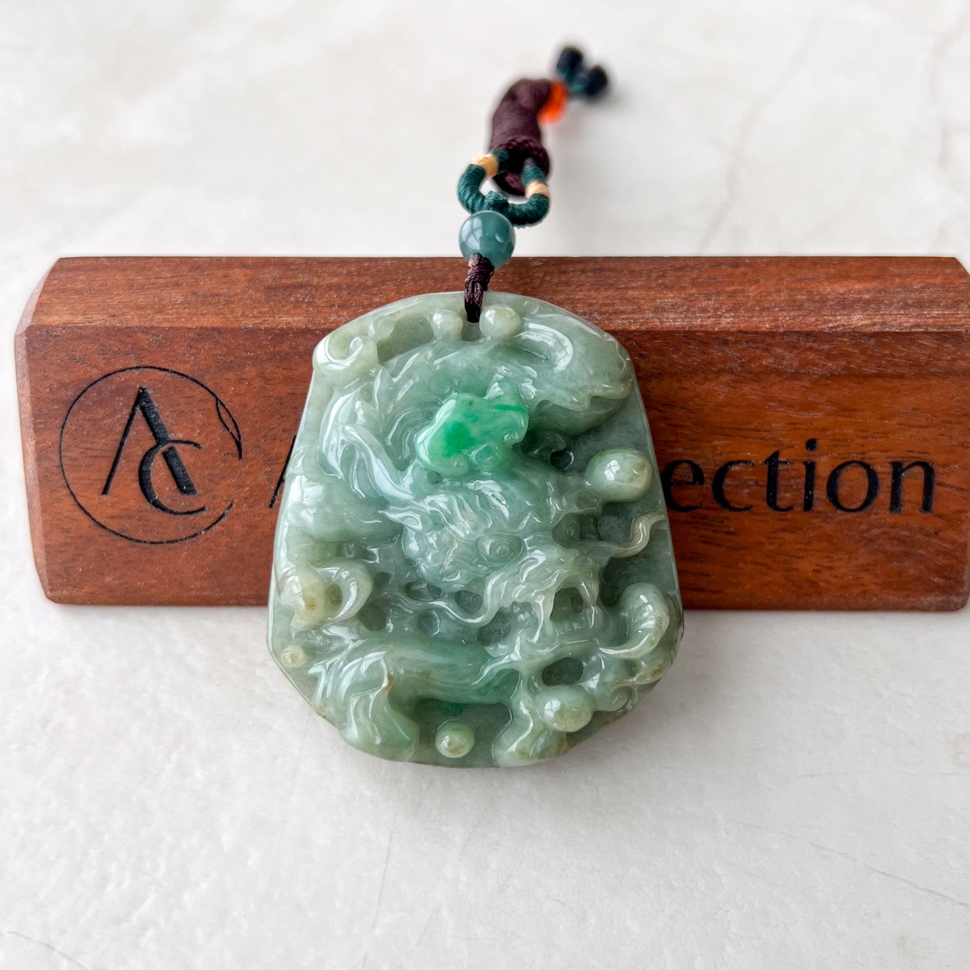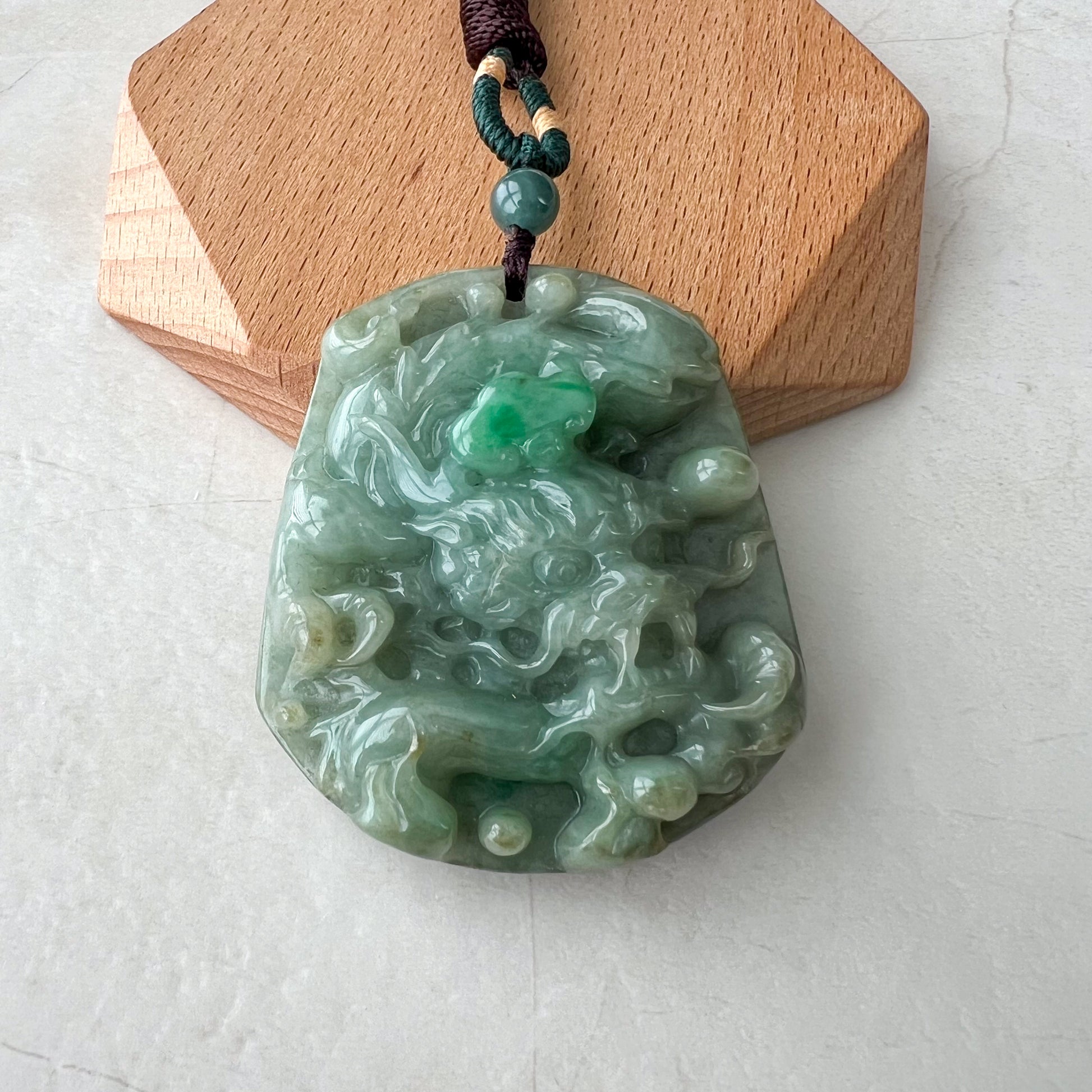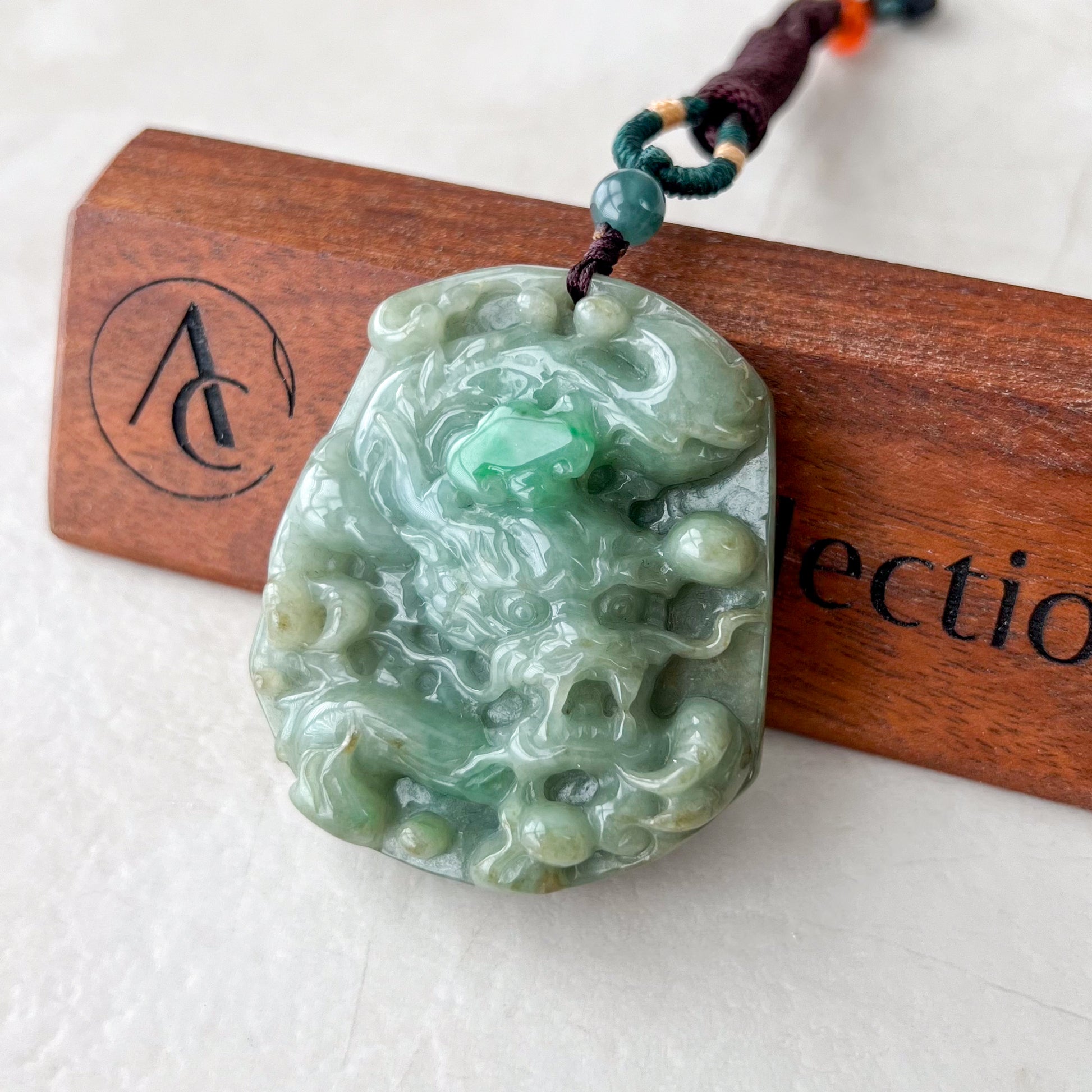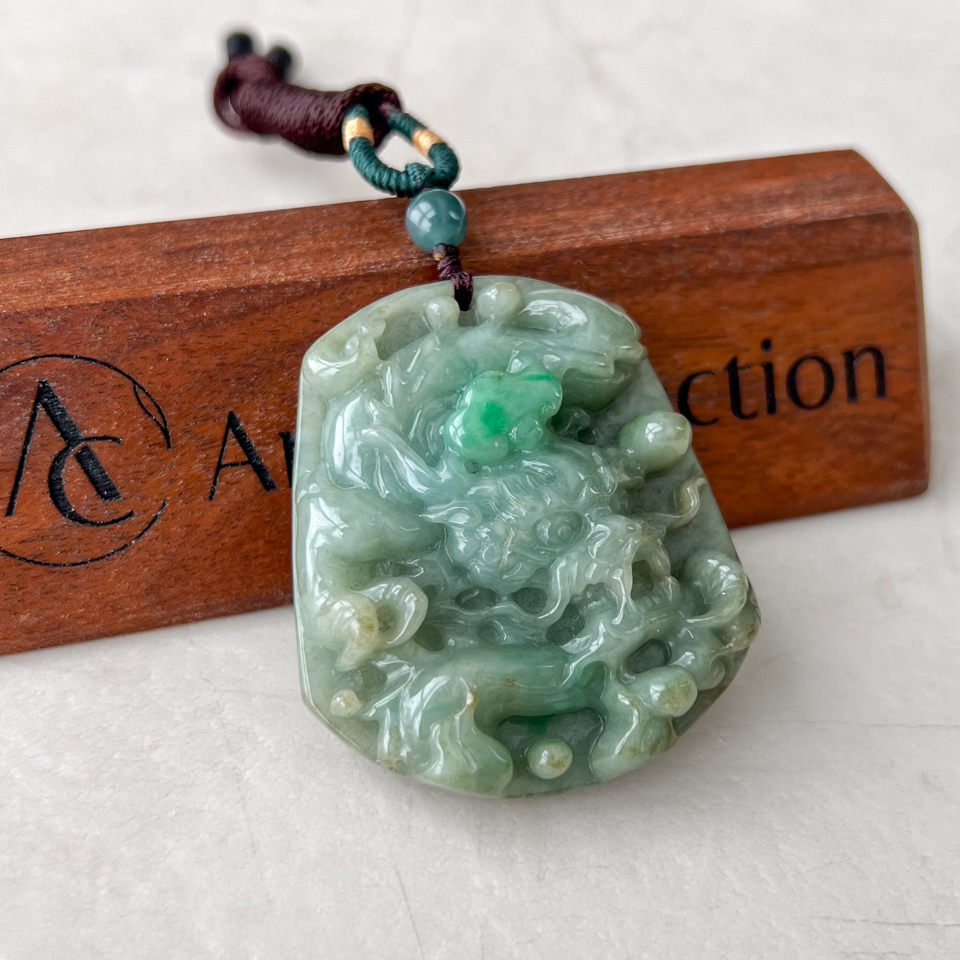 CARVING: The pendant is carved in the form of the Chinese Zodiac - Dragon. This jade piece has beautiful green hues. It is absolutely stunning hand carving, you can see the details of the dragon hair, claws, and scales. It depicts a dragon with its claws. The piece is dual sided carved. On the back you can see aa dragon tail. Double-sided carving is a very premium carving style, especially at the the level of detail this piece has!