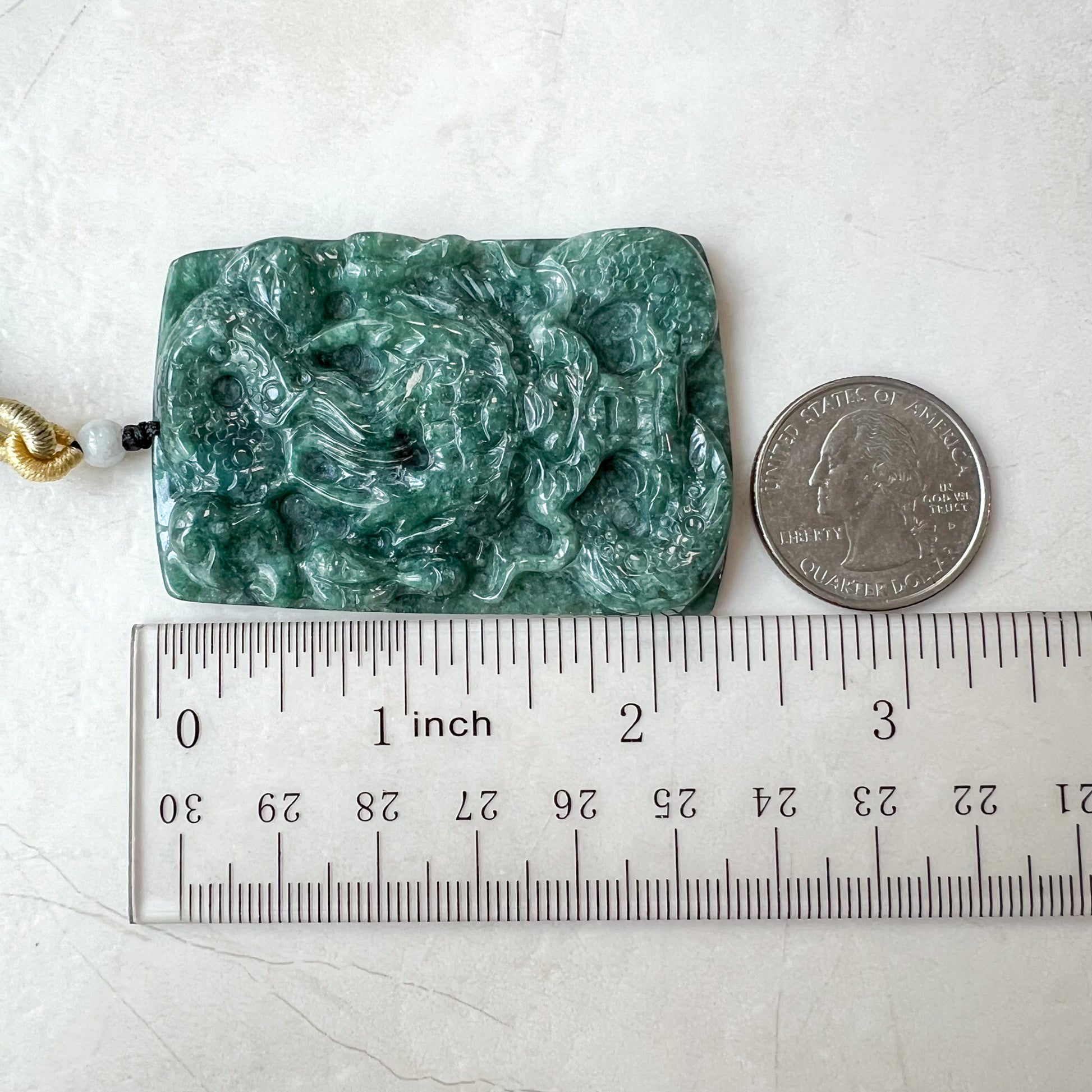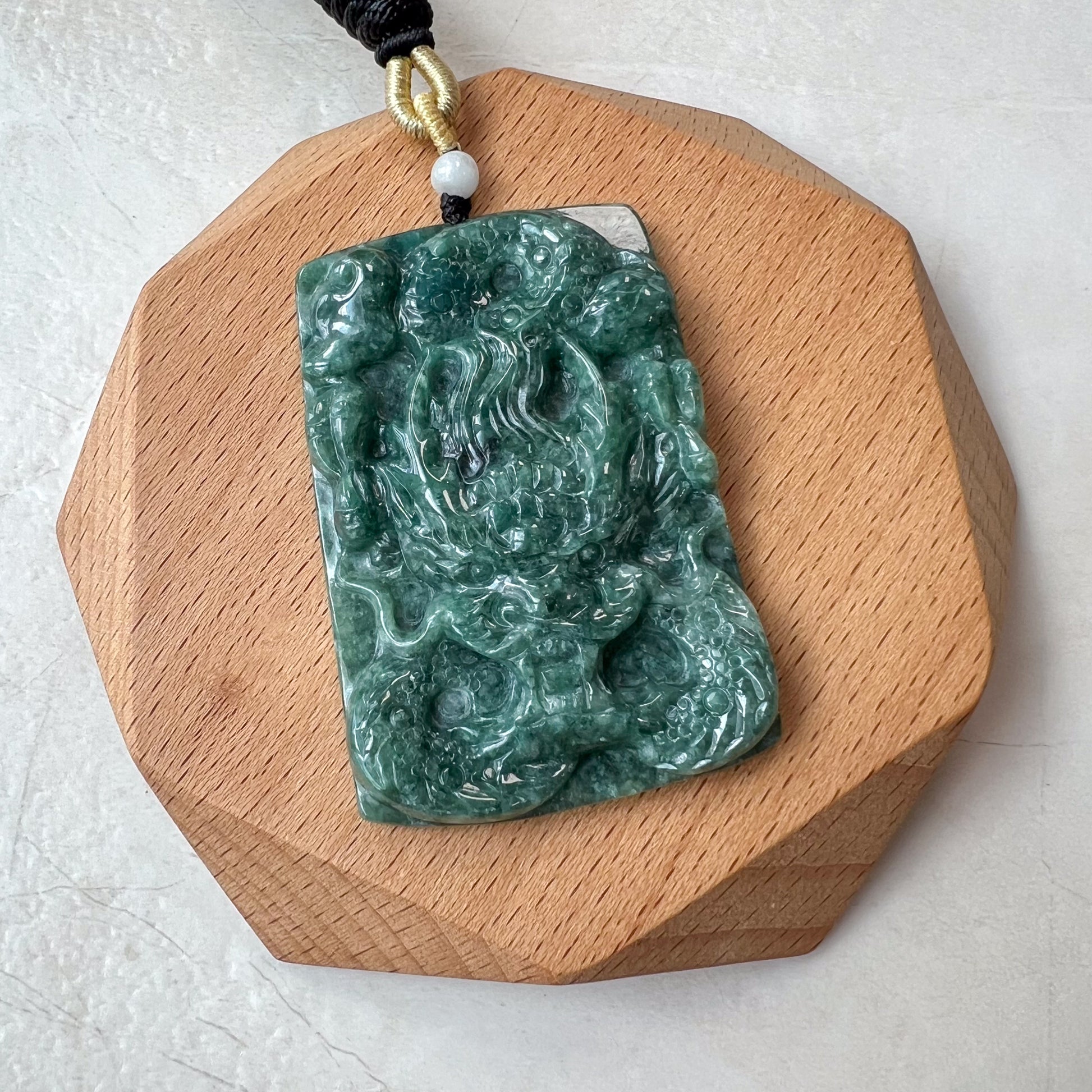 CARVING: The pendant is carved in the form of the Chinese Zodiac - Dragon. This jade piece has beautiful dark green hues. It is absolutely stunning hand carving, you can see the details of the dragon hair, claws, and scales.