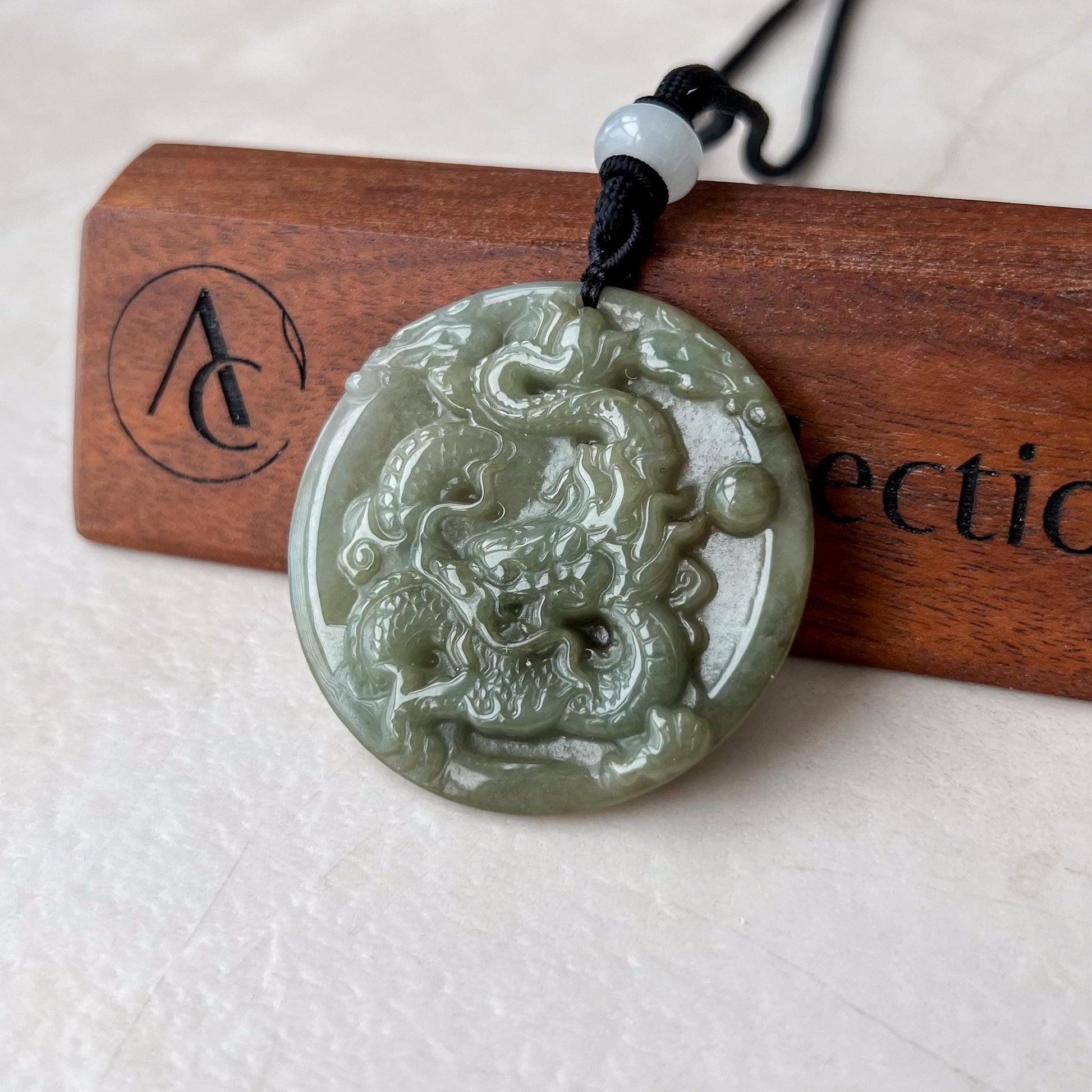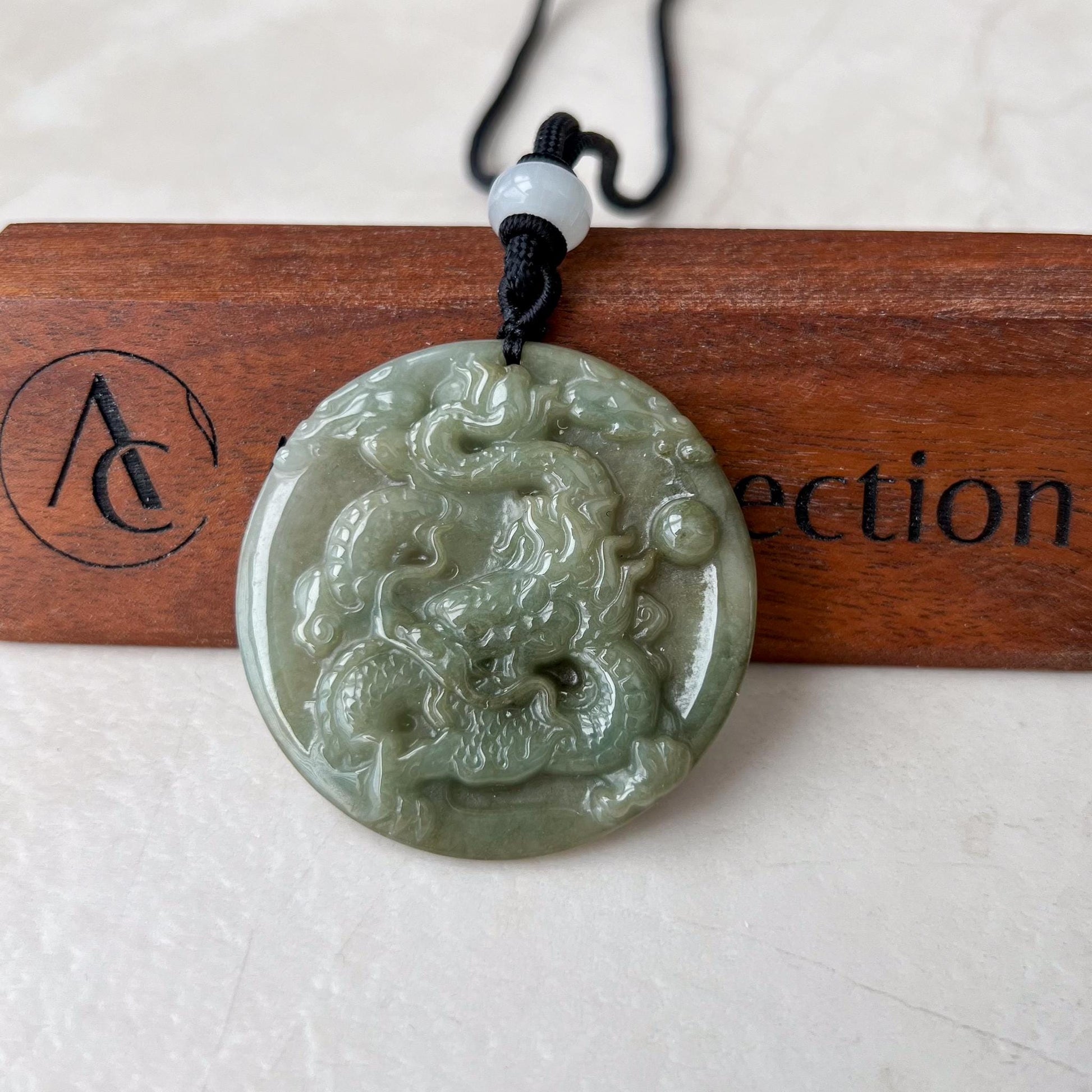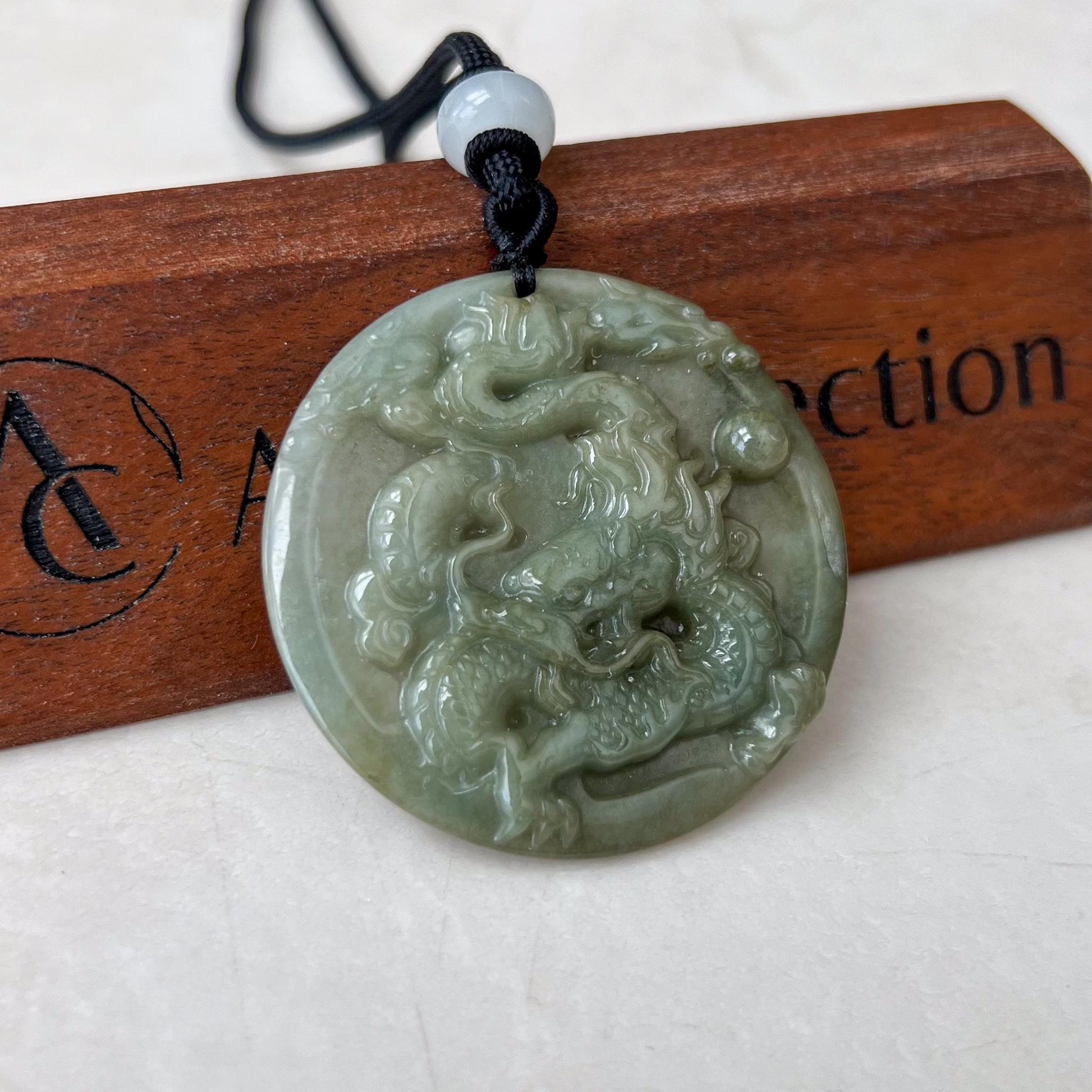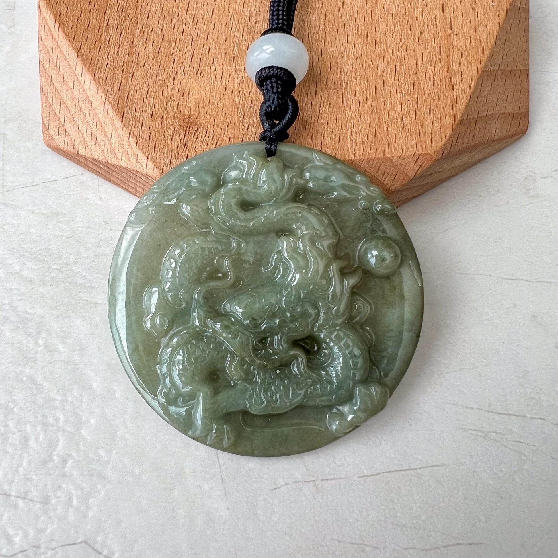 The design of this Dragon Symbolism Pendant is expertly crafted to highlight the intricate details of the dragon, from its scaled body to its fierce expression and flowing mane. It is hand-carved from natural grade a jadeite jade.