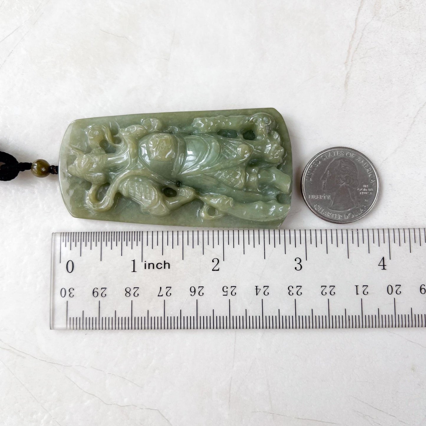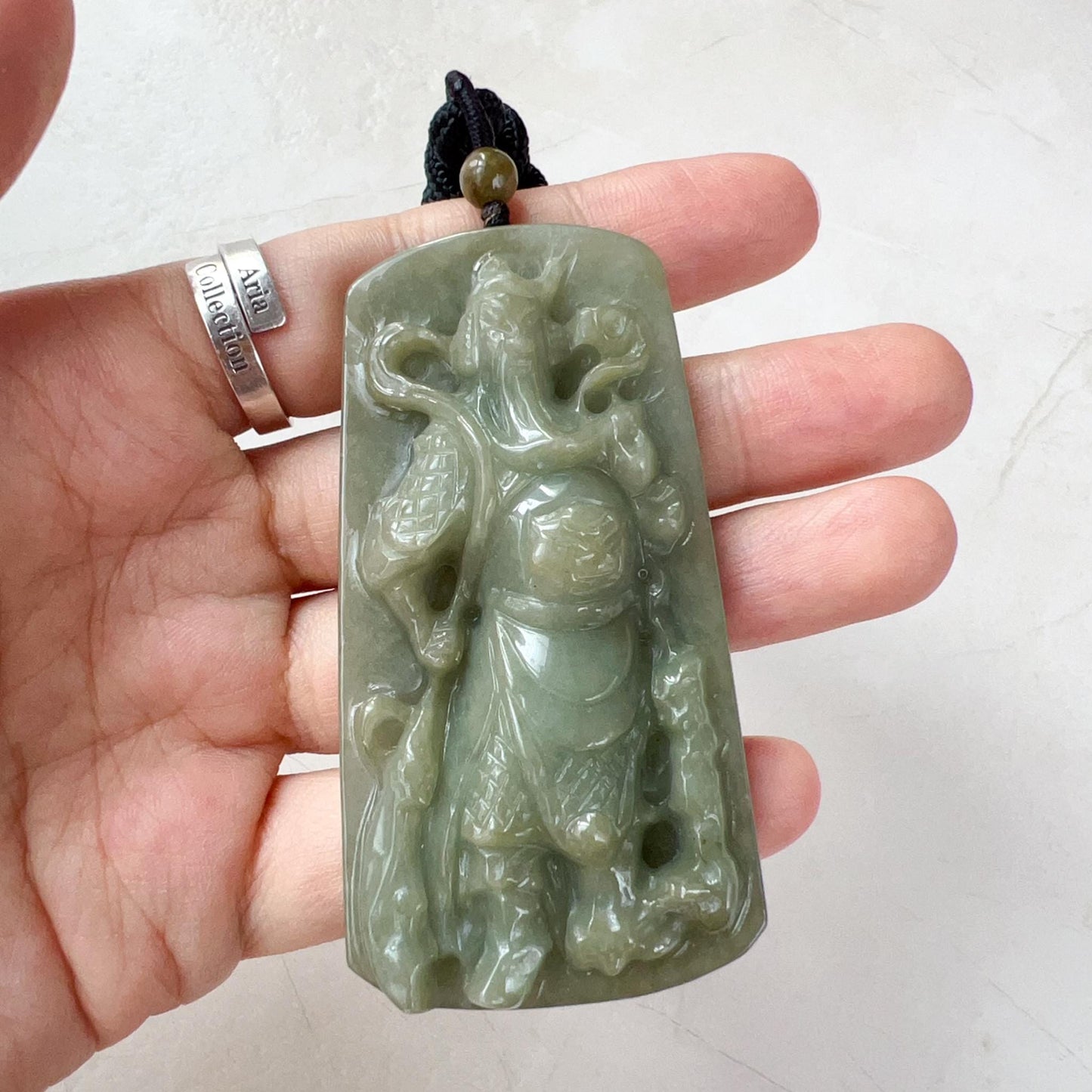 CARVING: The pendant is hand carved, so each piece is unique based on carving and natural variations of the Jadeite Jade Stone. It is carved jade in the form of the Guan Yu or Guan Gong, the God of Fortune and War.