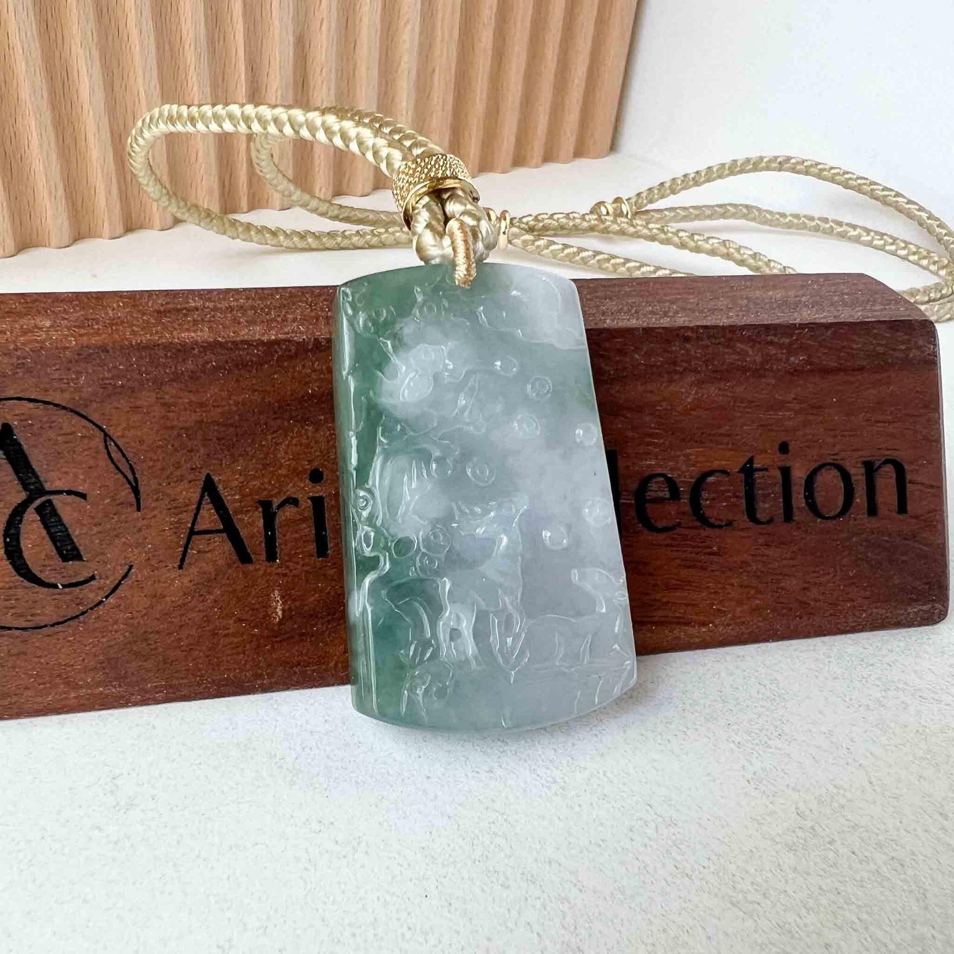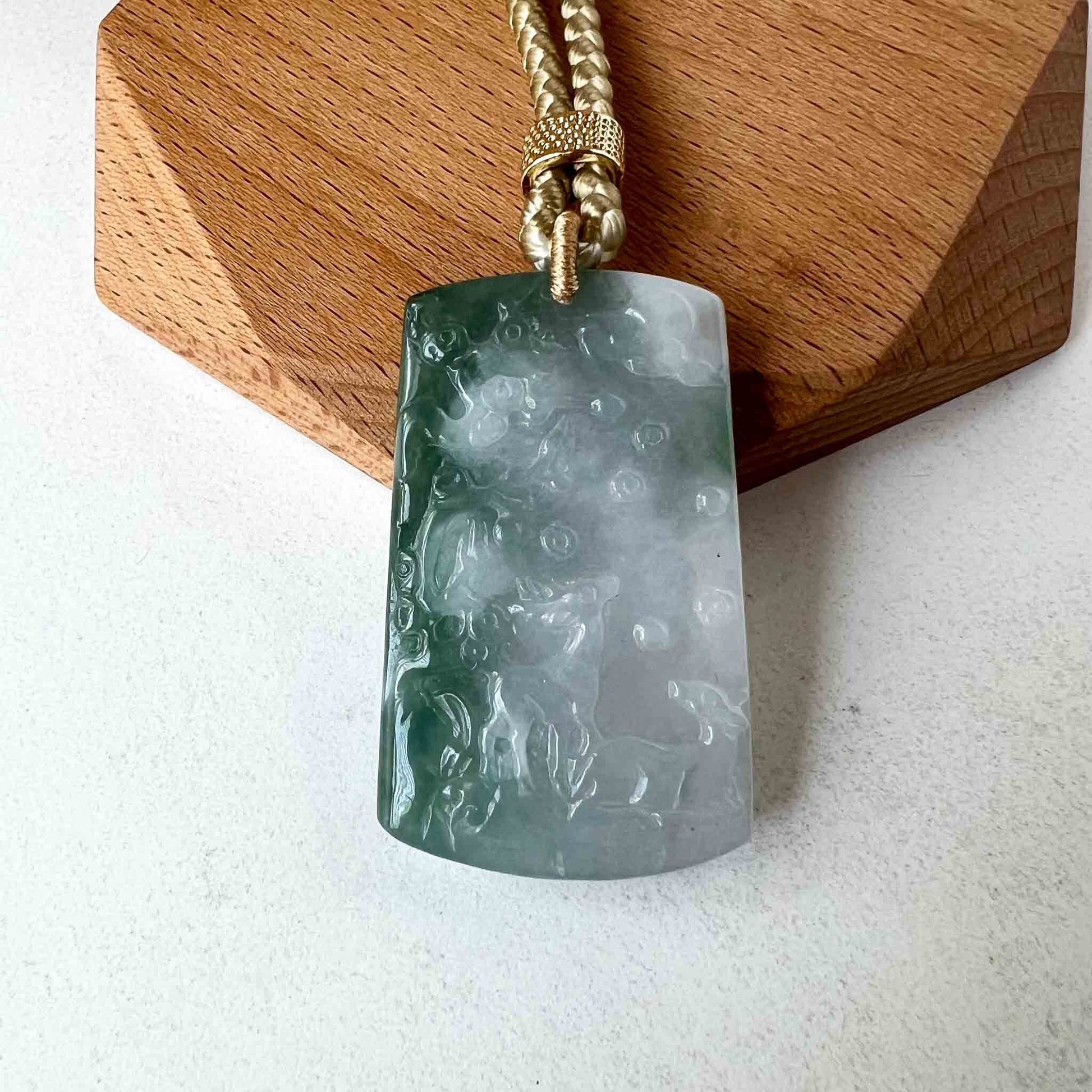 CARVING: The pendant is hand carved to depict two deers under a tree. The jade carving blends in with the beautiful green shades mixed with white throughout the piece. The scene in the jade is exquisitely hand carved. This piece is a a true hand carving masterpiece!