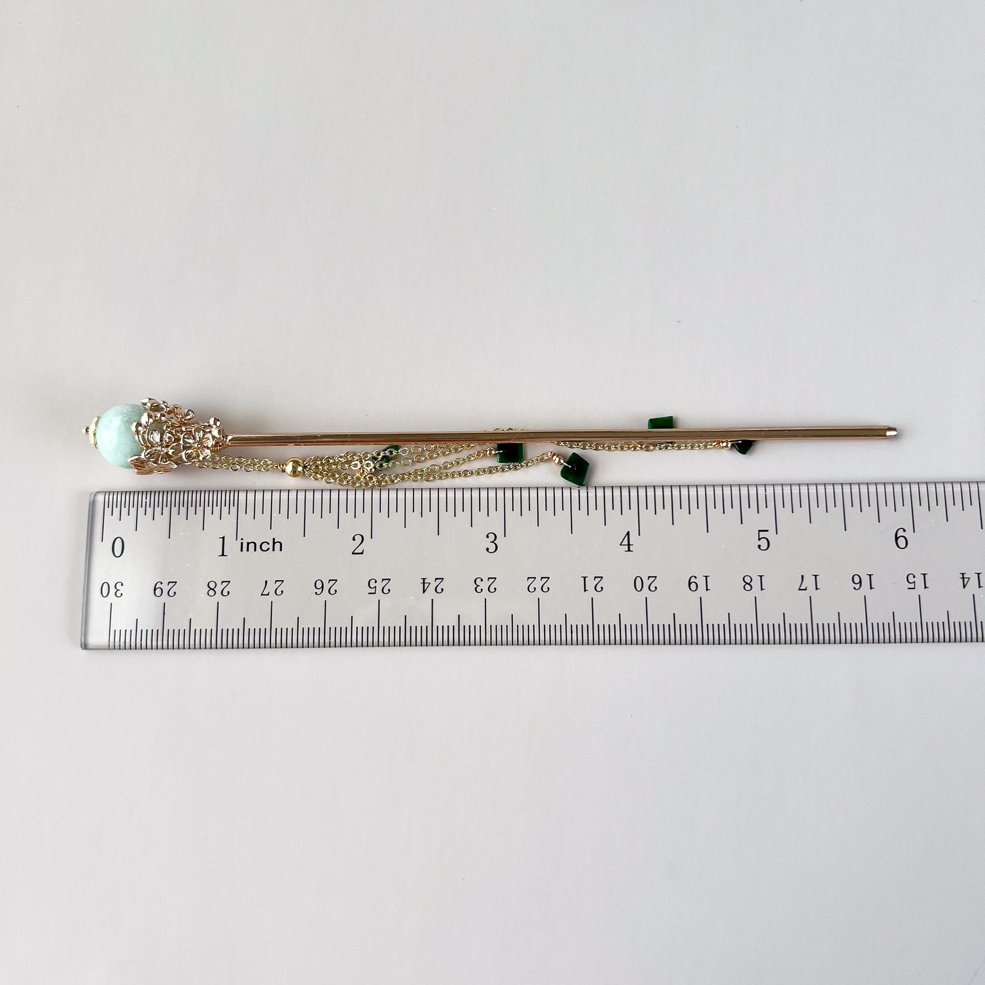 Beautiful gold plated hairpin with light green jade bead and accent chips. Comes with a gift box.