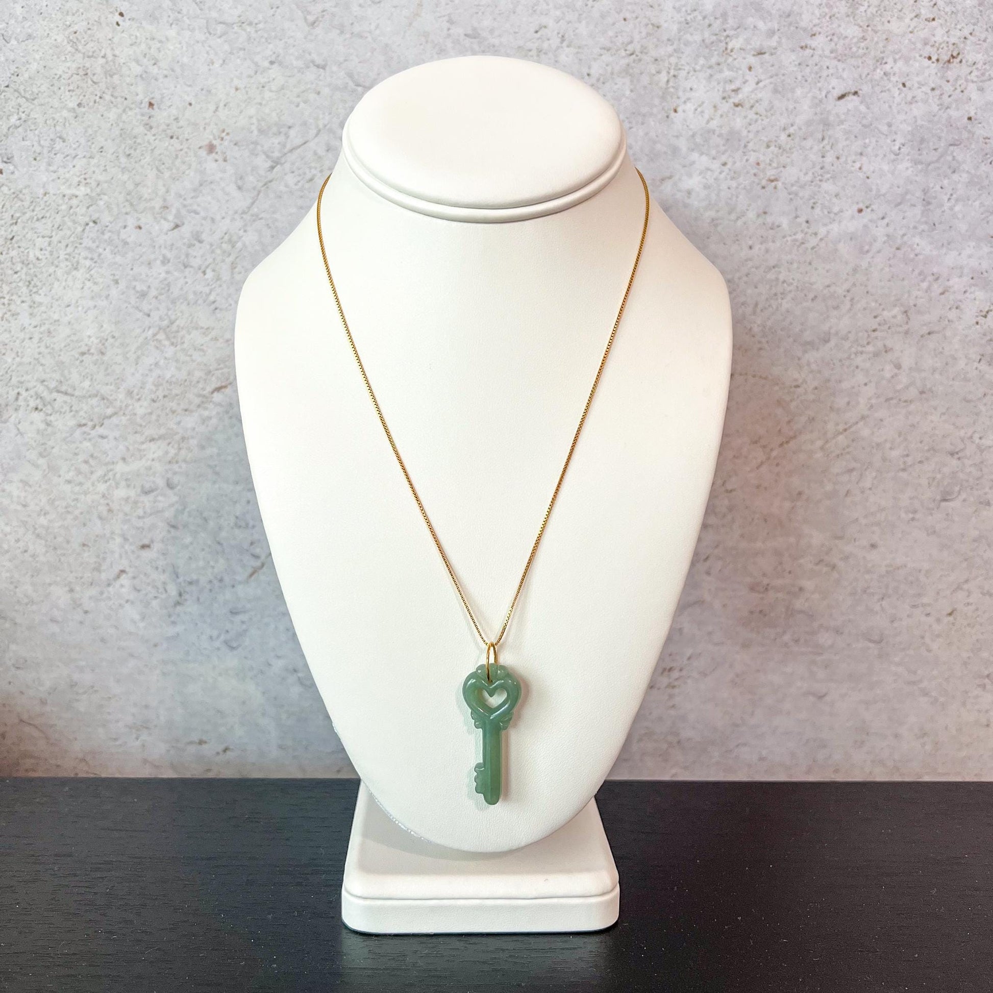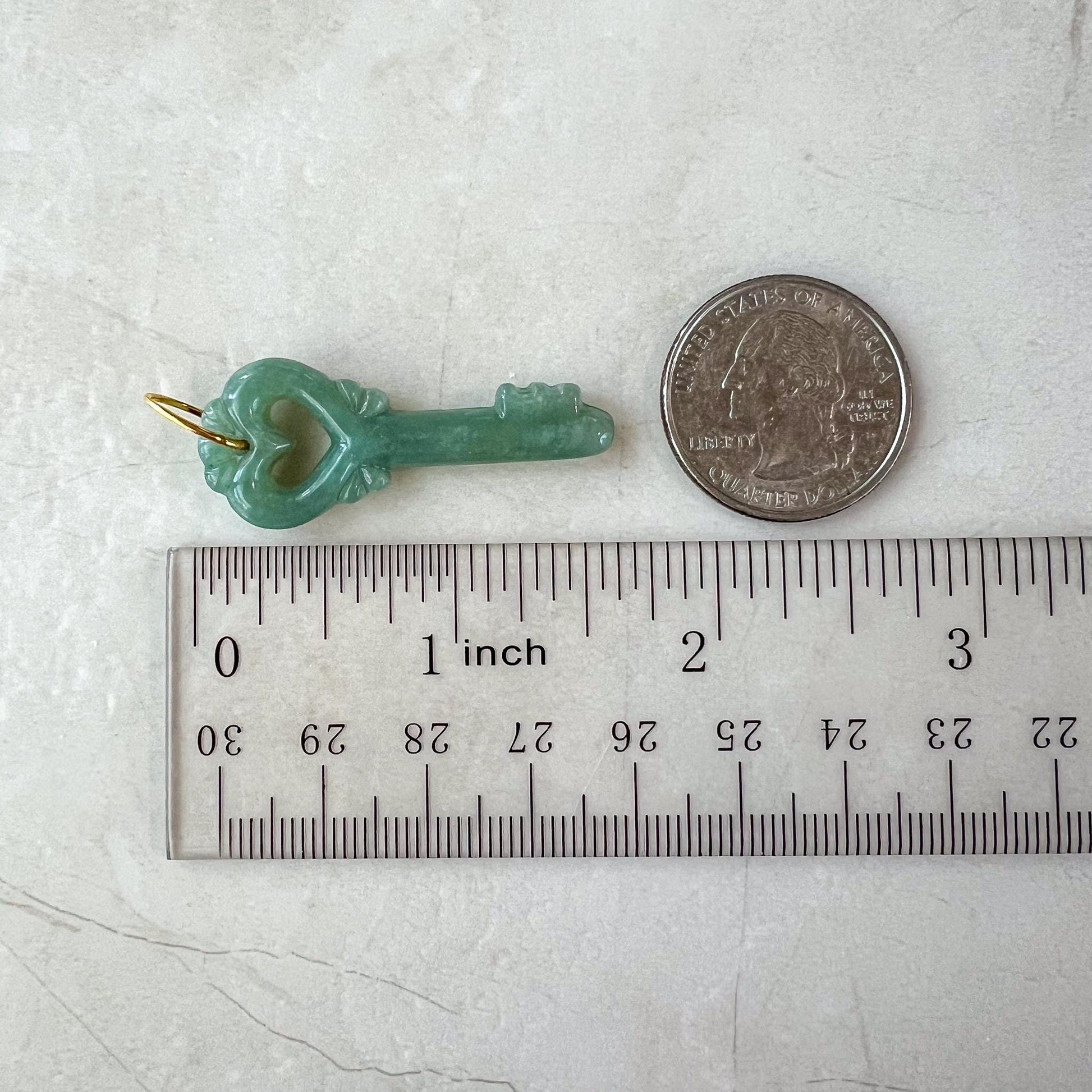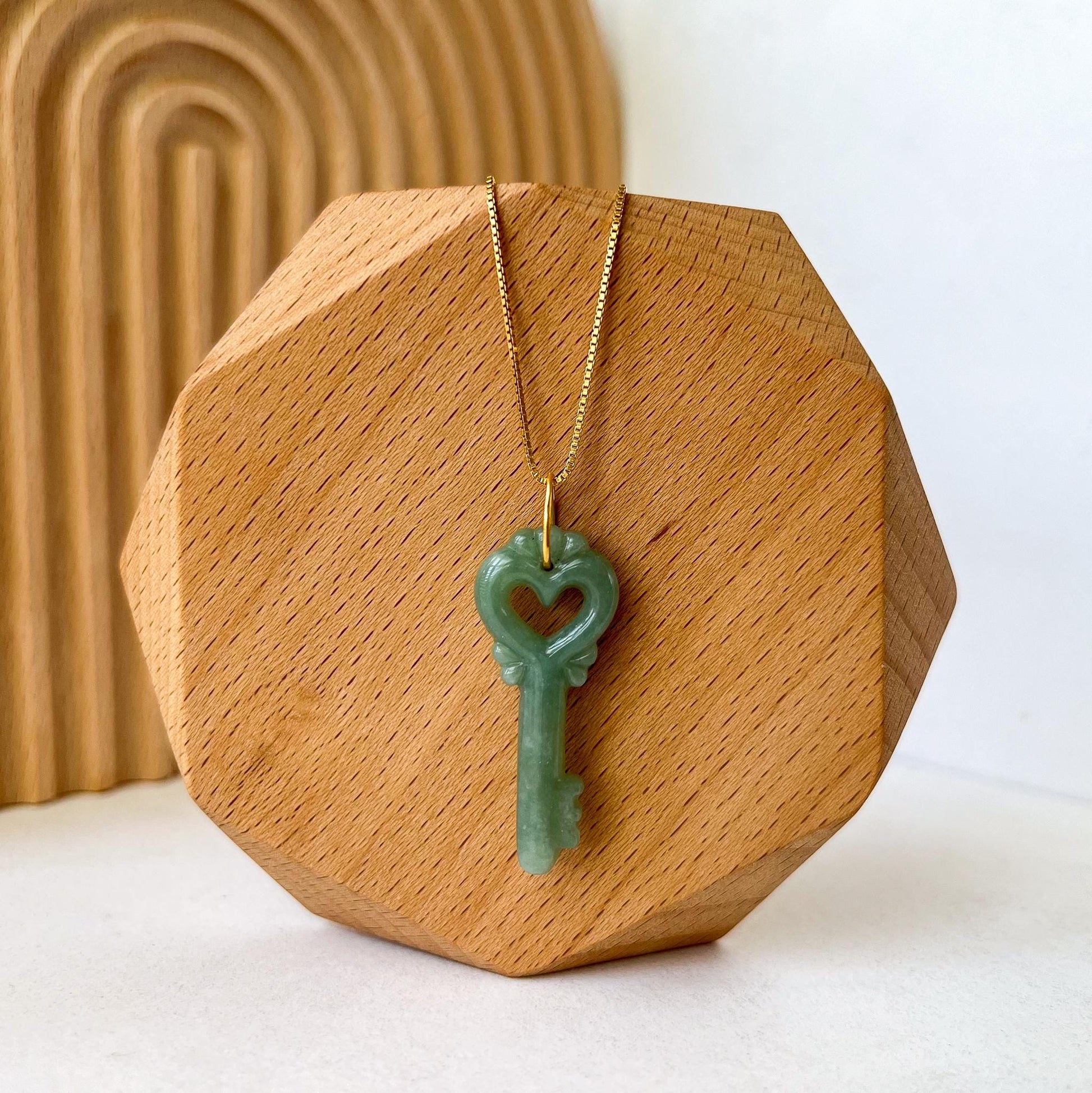 This jade key heart pendant features a carved jade heart knob, symbolizing love and serenity, paired with a minimalist 18k gold bail loop for a touch of sophistication. Crafted with natural untreated jade, this versatile piece is a beautiful blend of tradition and modernity.