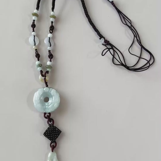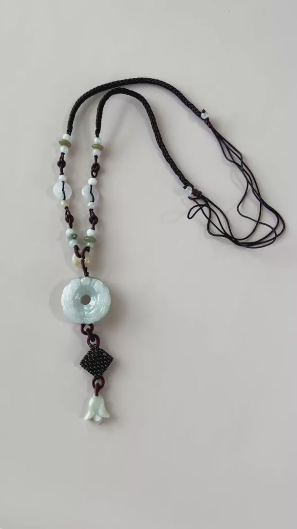 CARVING: This is a high grade jade pendant. It is carved jade in the form a circle. It is said to protect the wearer. This particular piece of jade is exquisitely carved with detail and embellished with multiple beads on the necklace, giving it a sophisticated yet traditional look.