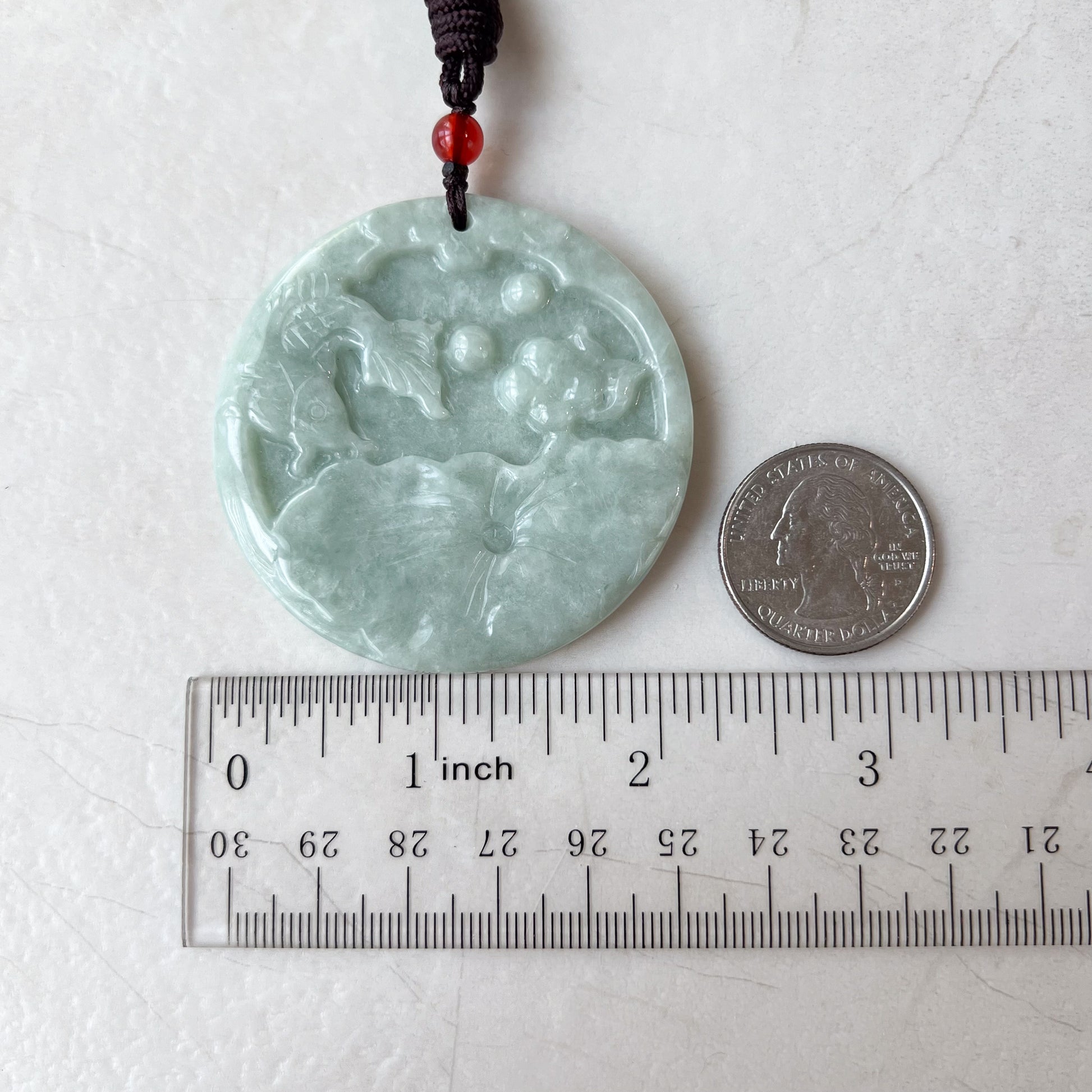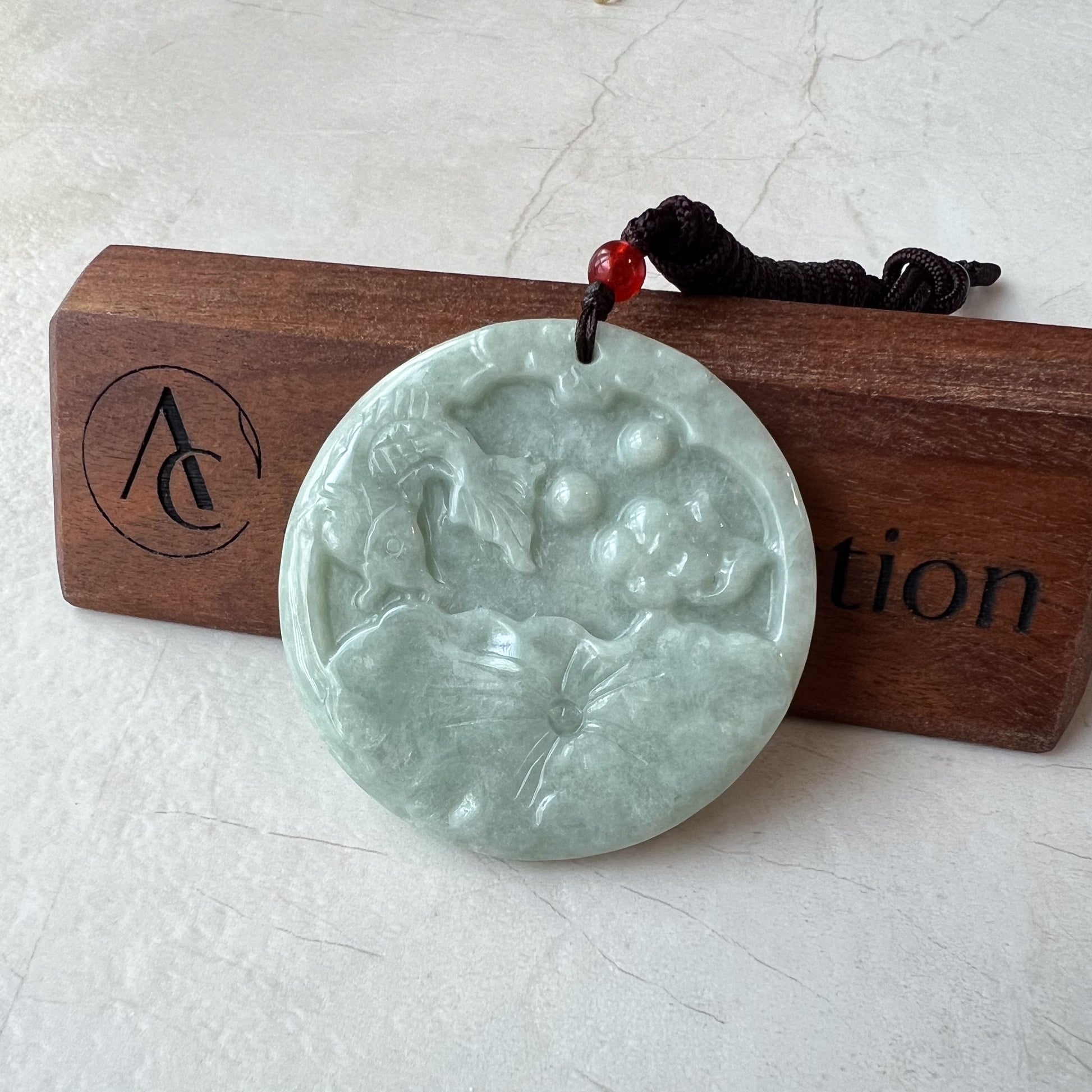 CARVING: The jade pendant is an intricately carved with a koi fish and a lotus flower in a pond. The koi fish is depicted with detailed scales and a flowing tail, swimming gracefully upward, symbolizing perseverance and transformation. The lotus flower is intricately carved, showcasing its delicate petals and the central pod, symbolizing purity and enlightenment. The pond scene is beautifully rendered on a natural jadeite jade stone, highlighting the high-quality craftsmanship.