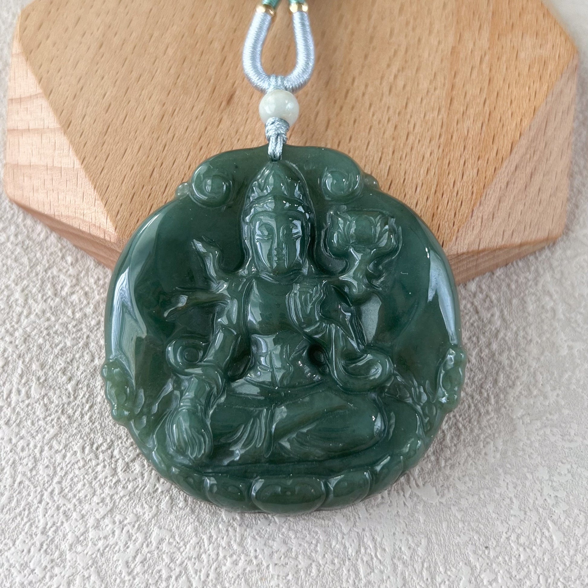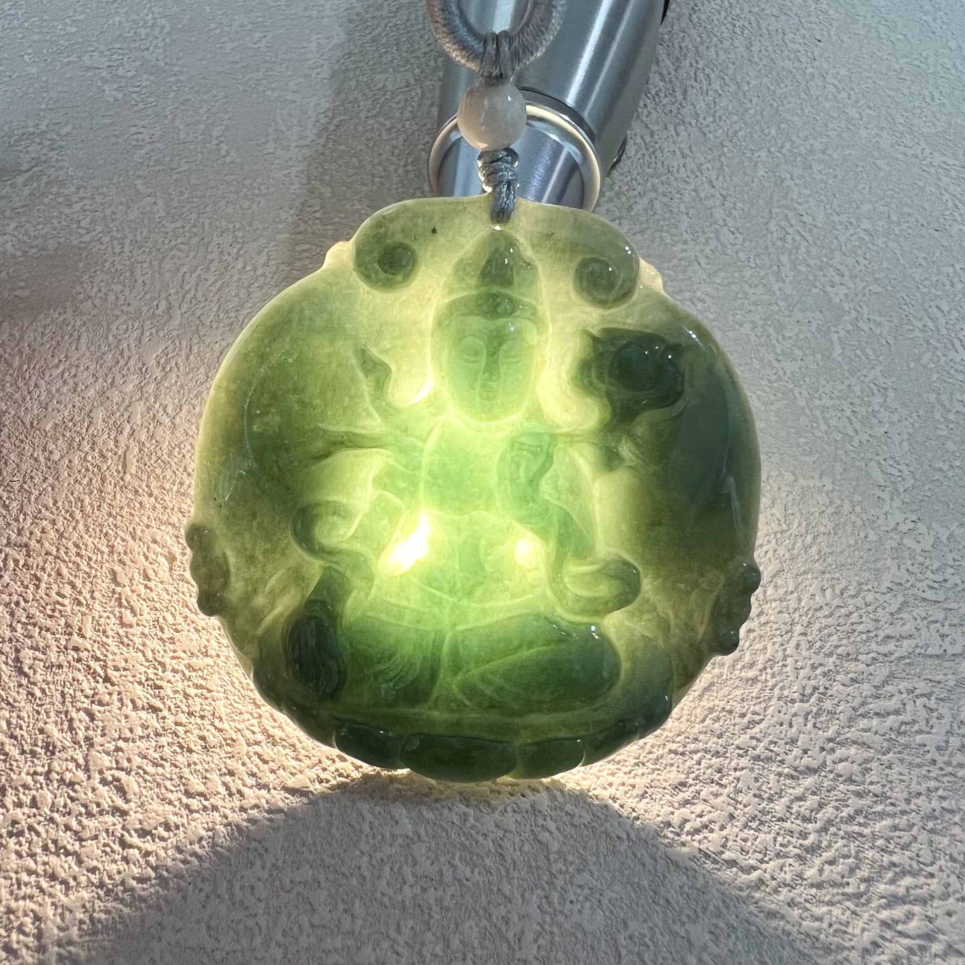 CARVING: The pendant is exquisitely hand carved jade (one of a kind!) in the form of the Mahāsthāmaprāpta (Also known as Da Shi Zhi). Mahāsthāmaprāpta is a bodhisattva mahāsattva who represents the power of wisdom. His name literally means "arrival of the great strength".