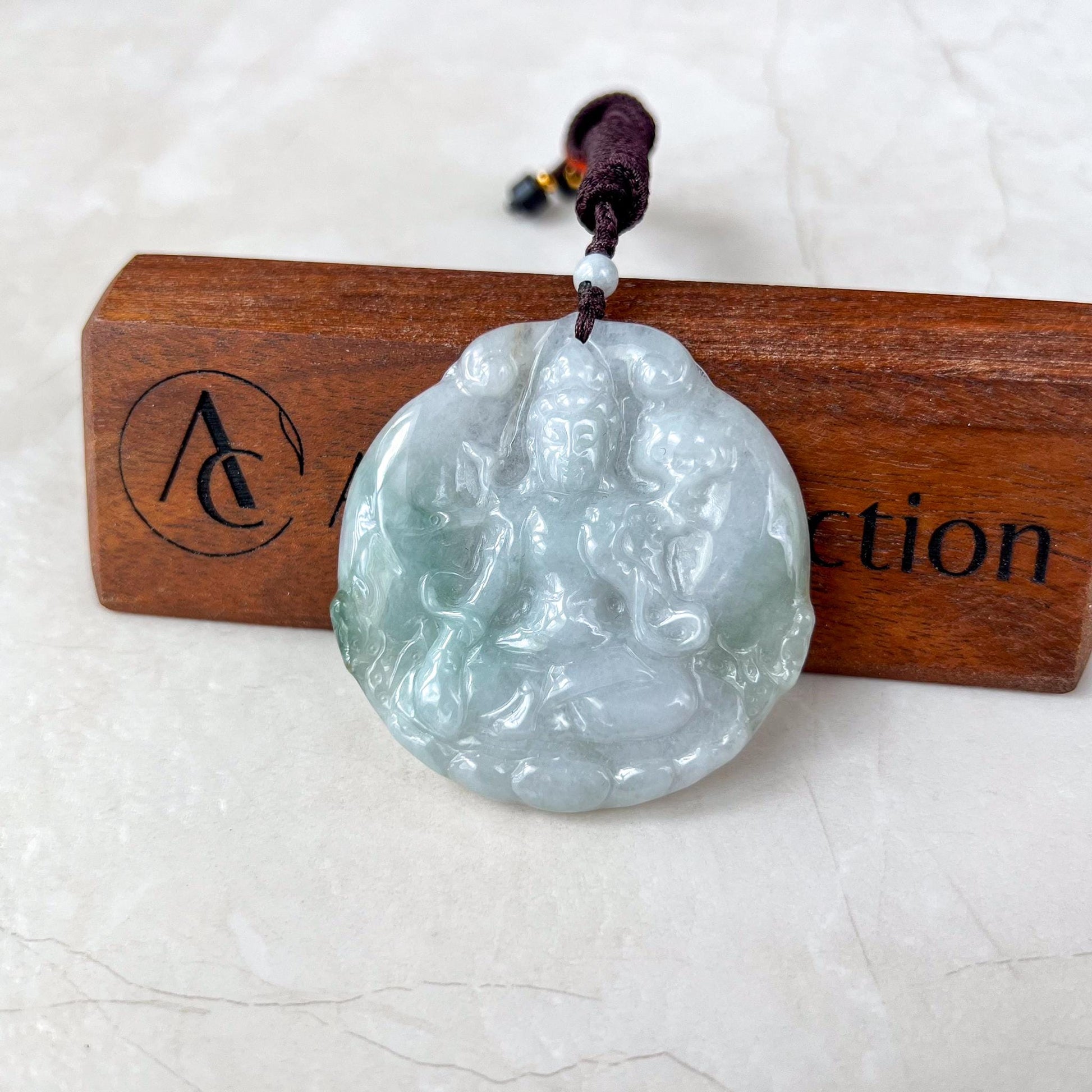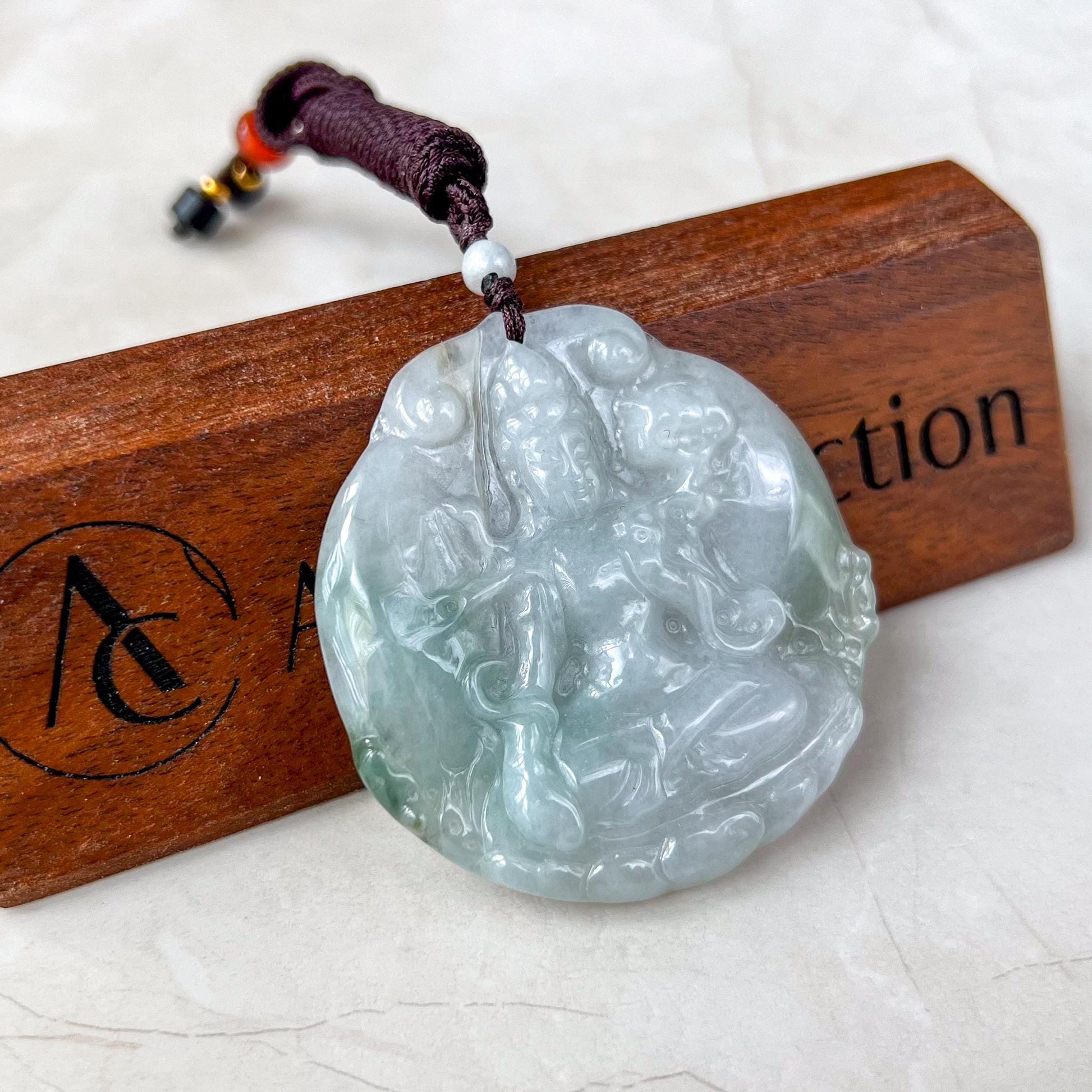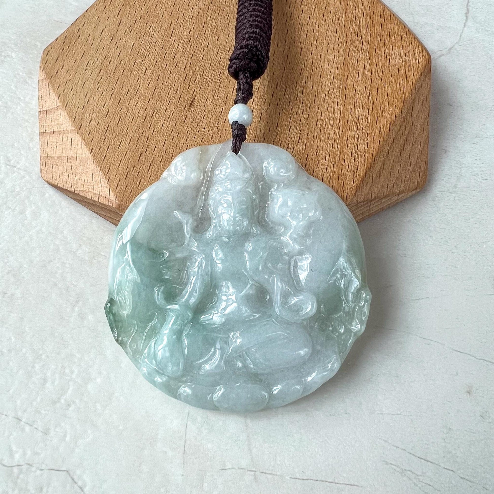 CARVING: This one-of-a-kind jade pendant is masterfully hand-carved in the likeness of Mahāsthāmaprāpta, the bodhisattva symbolizing the power of wisdom. The intricate details capture his serene presence and embody his name, which means "arrival of great strength." This pendant is a powerful symbol of enlightenment and inner peace, making it both a meaningful amulet and a treasured heirloom.