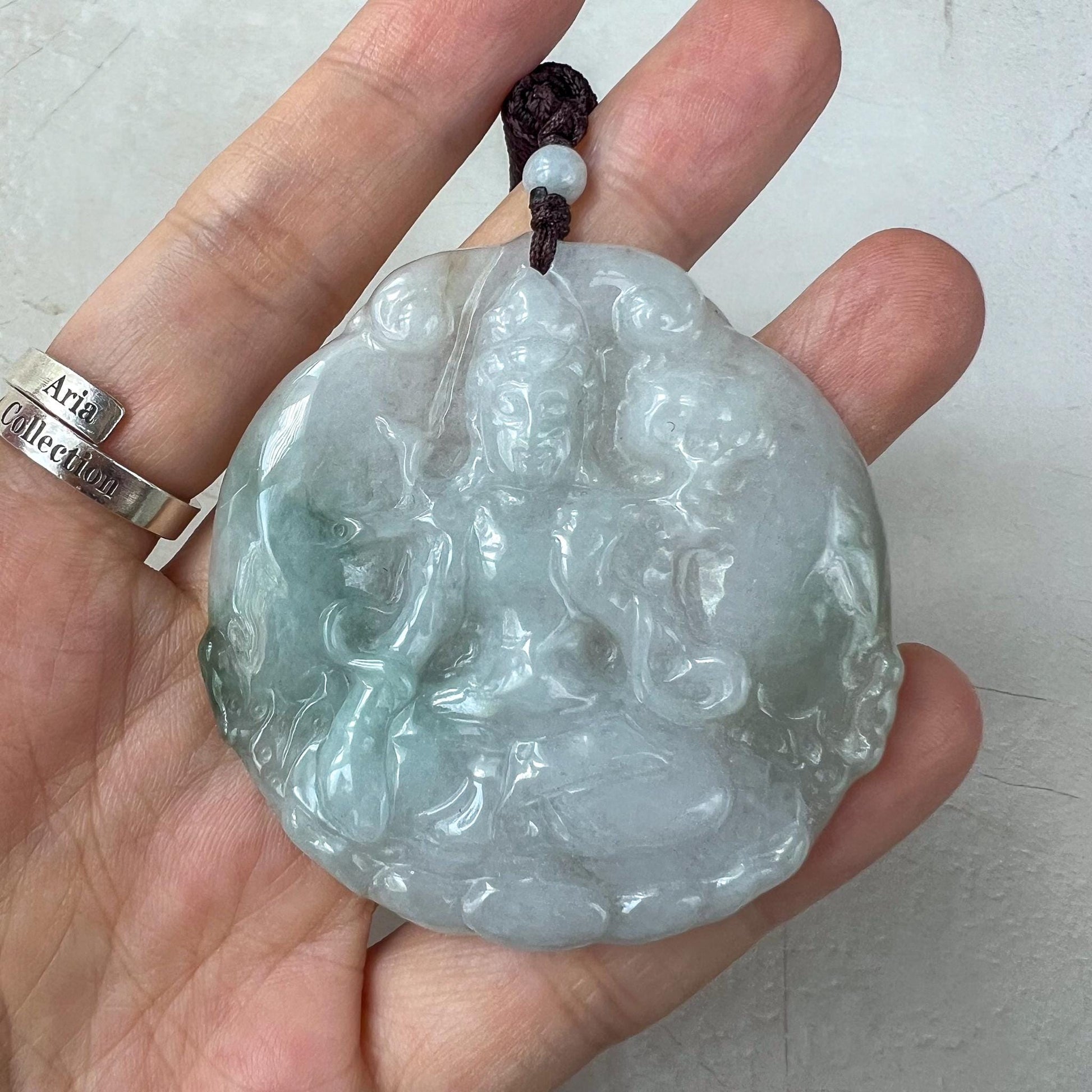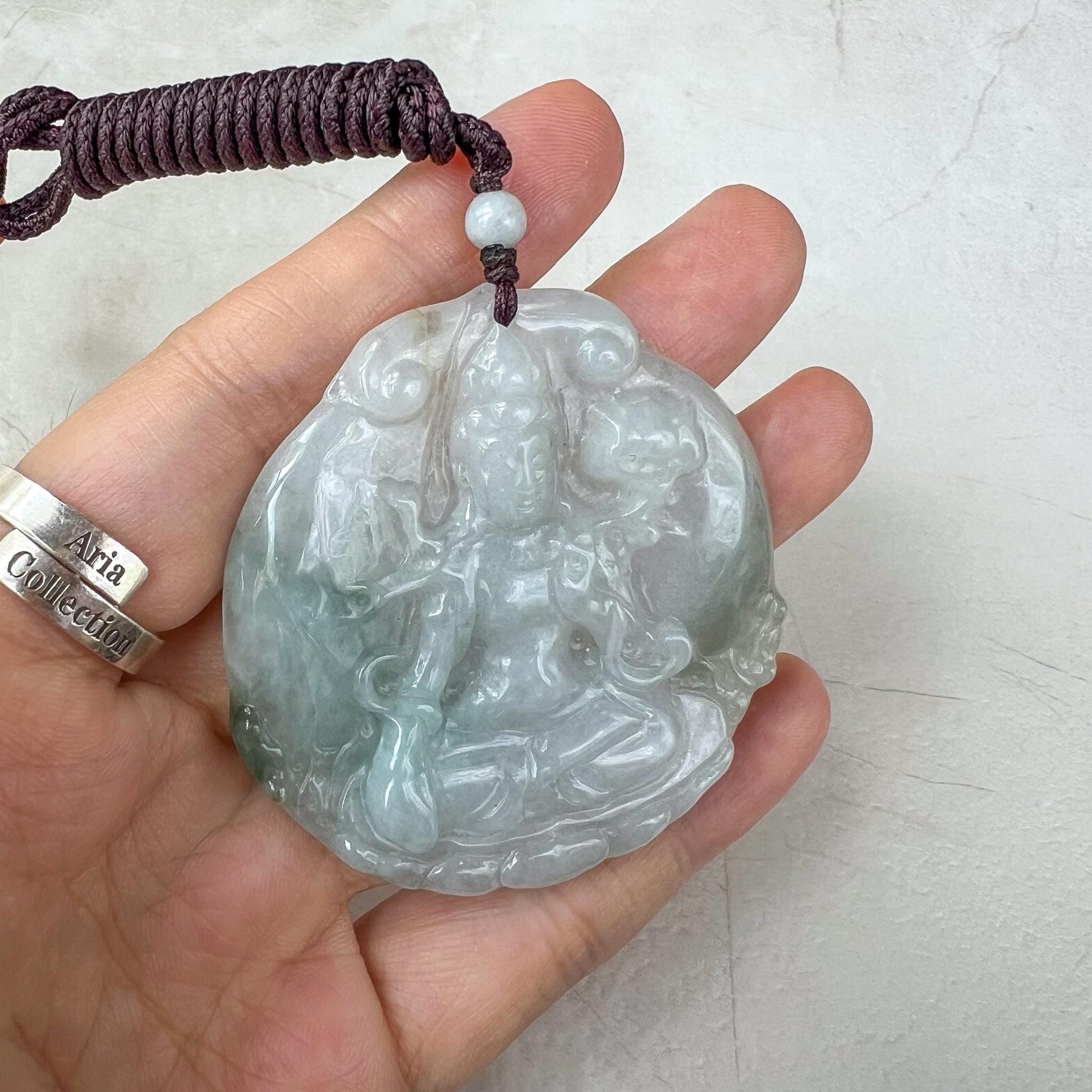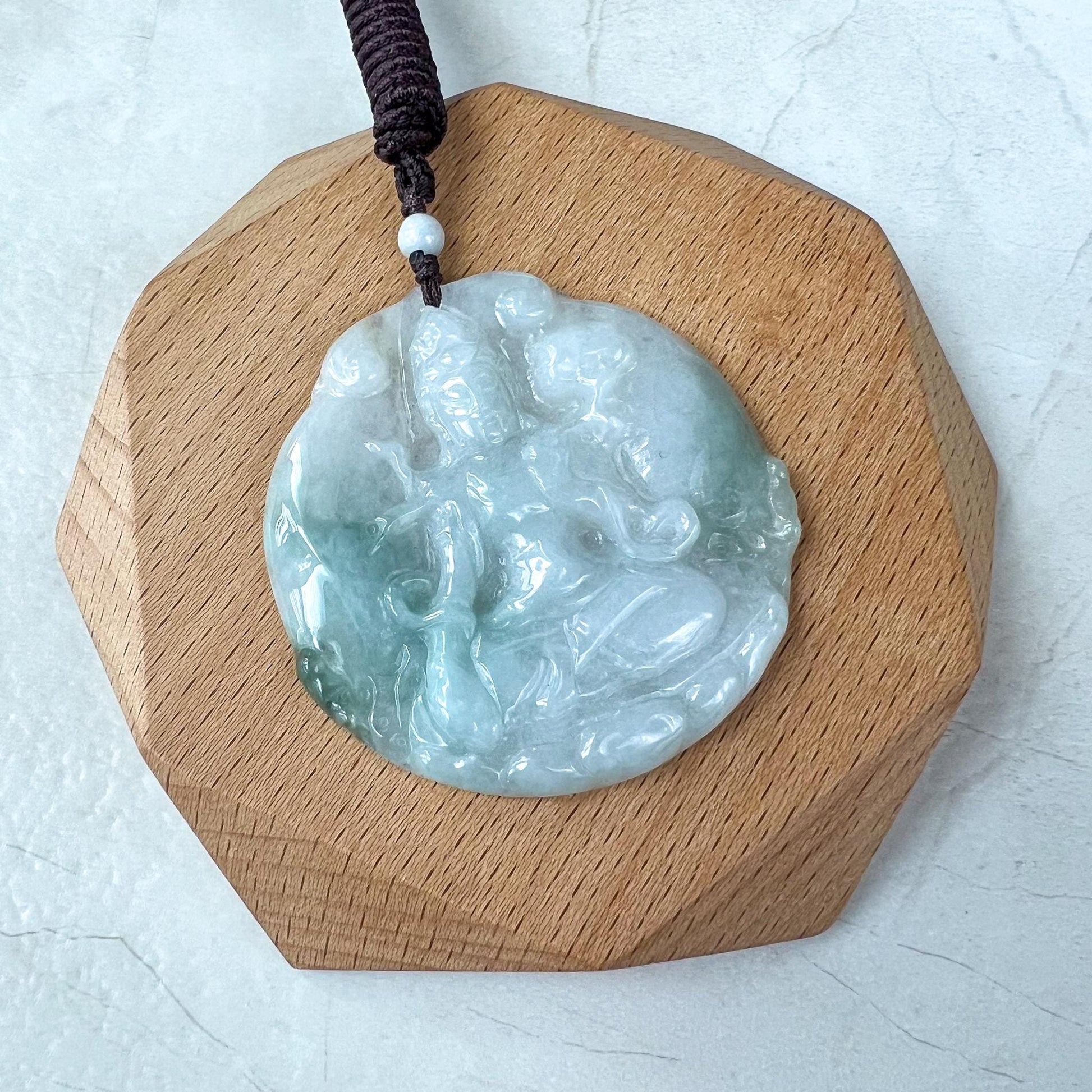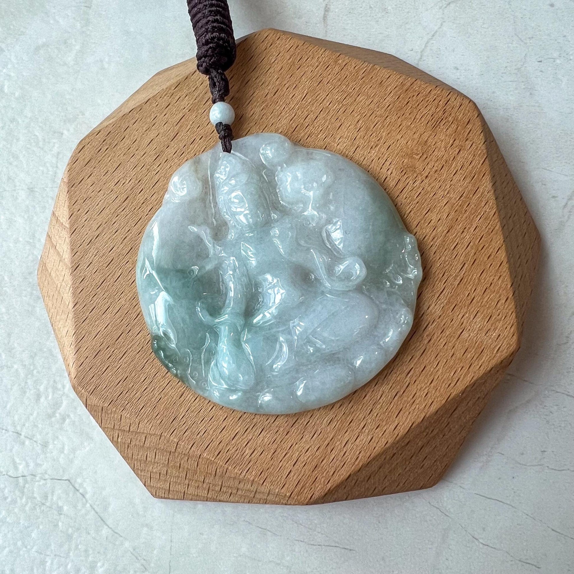 CARVING: This one-of-a-kind jade pendant is masterfully hand-carved in the likeness of Mahāsthāmaprāpta, the bodhisattva symbolizing the power of wisdom. The intricate details capture his serene presence and embody his name, which means "arrival of great strength." This pendant is a powerful symbol of enlightenment and inner peace, making it both a meaningful amulet and a treasured heirloom.