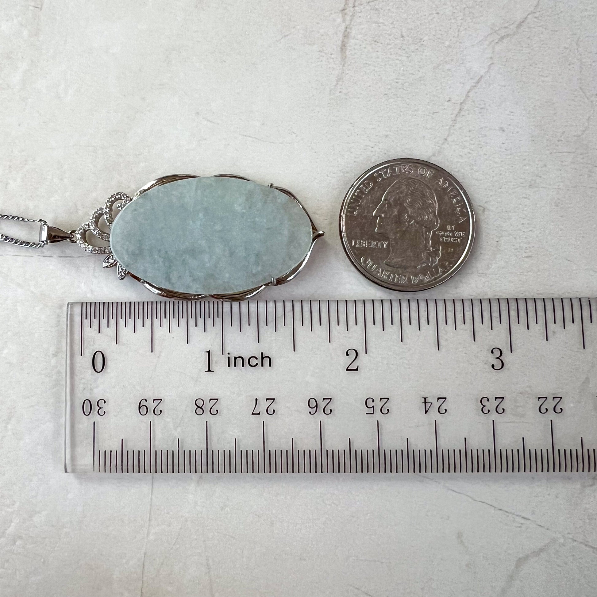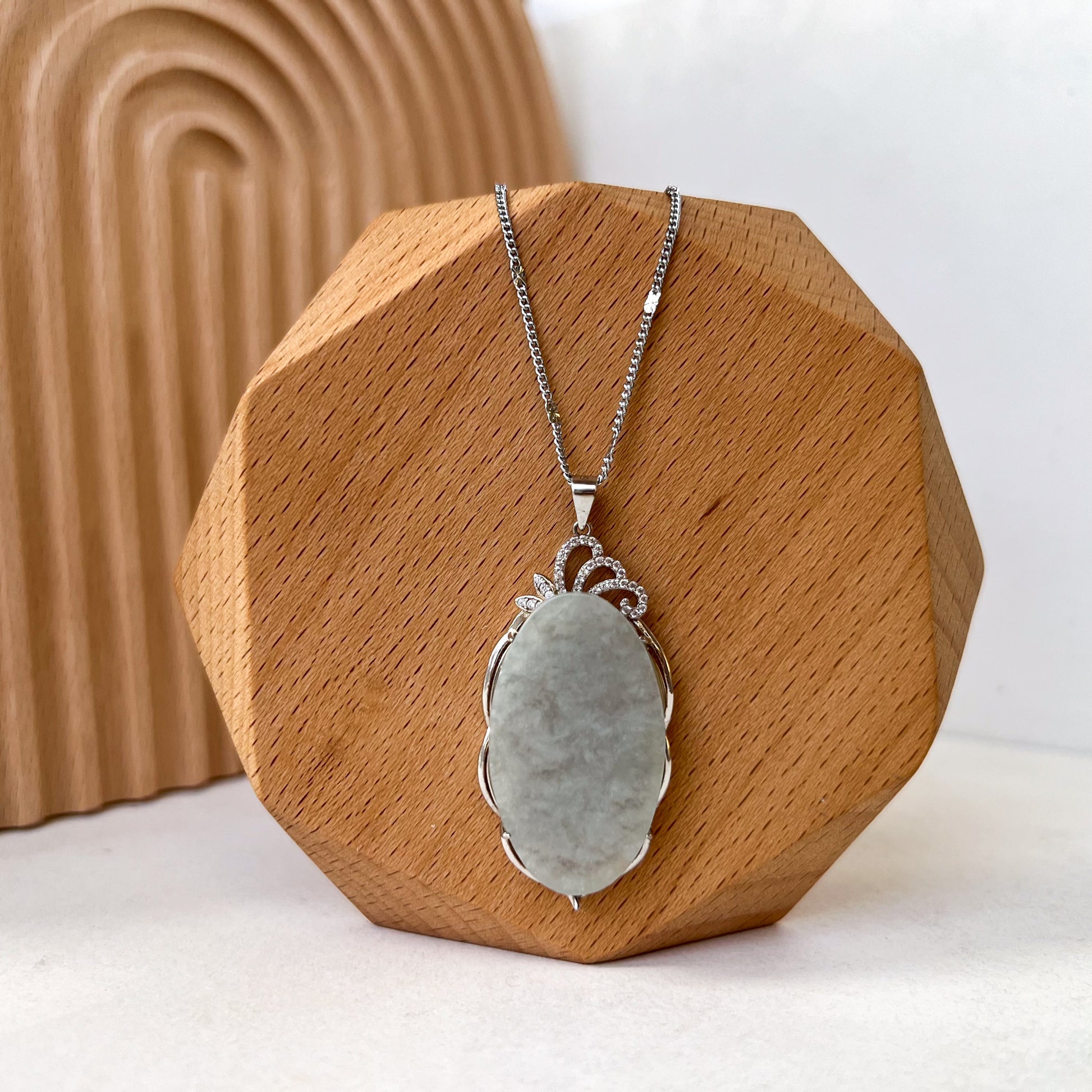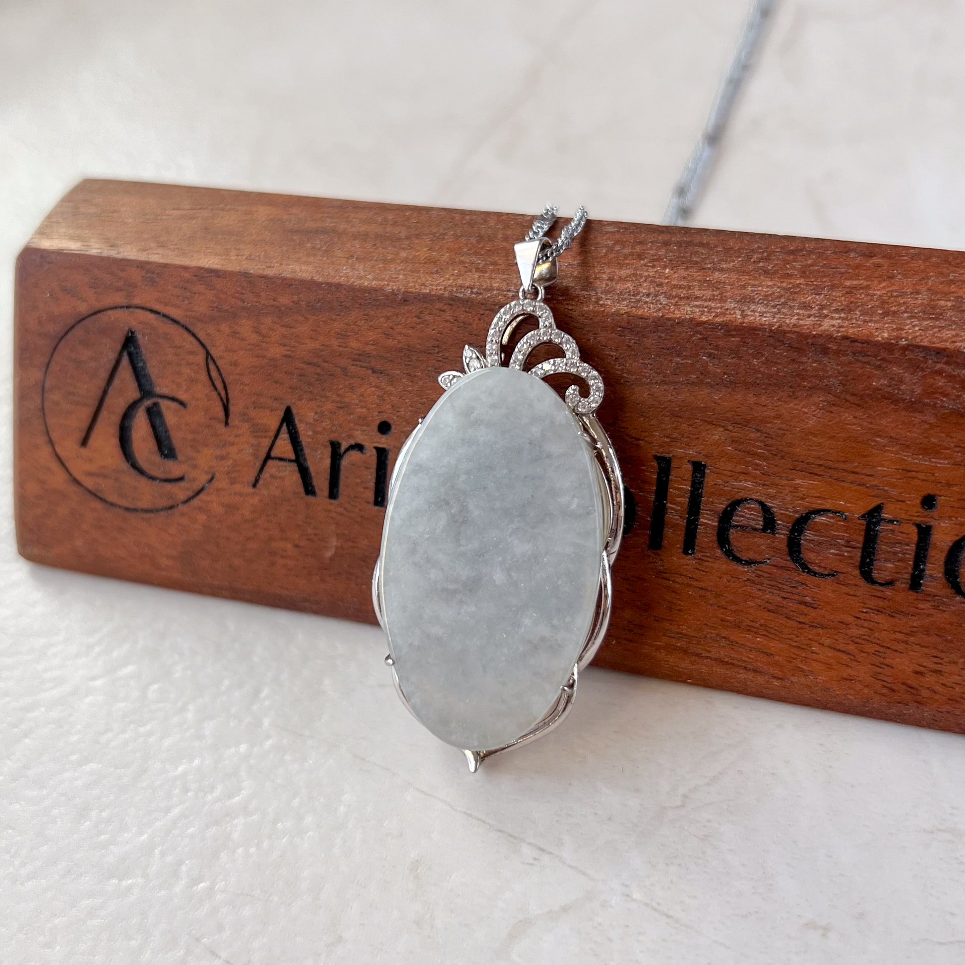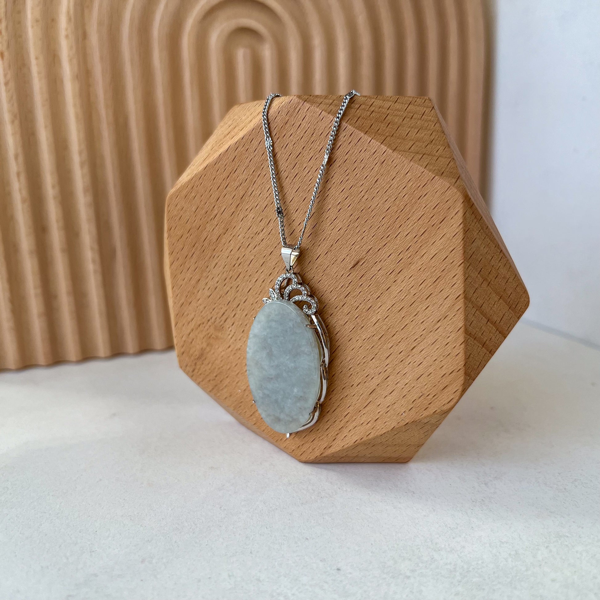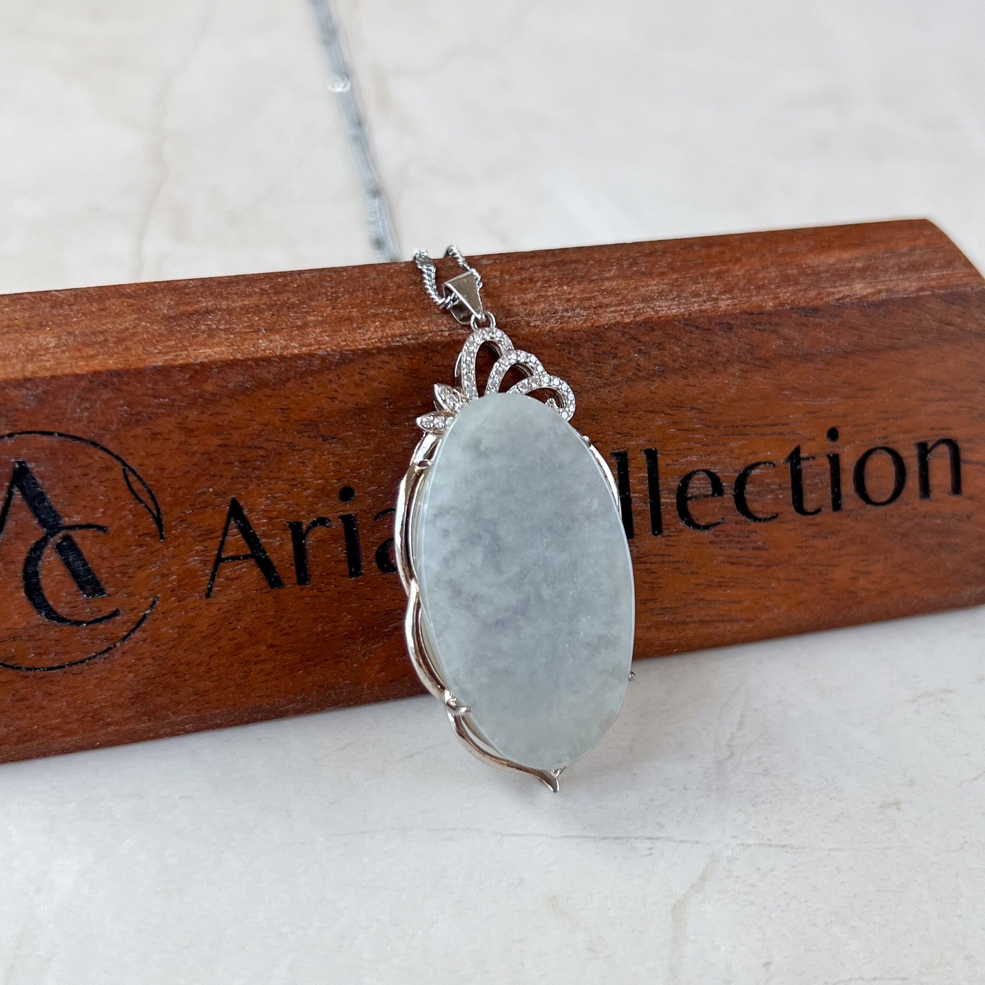 JADE COLOR: The pendant has a beautiful light blue-gray tones. This minimalist dainty piece is semi-translucent and allows light to shine through when held against the light or sun. This allows for a "glowing effect" when light reflects on the stone, which is beautiful under natural sunlight. This is a premium quality in jadeite jade.