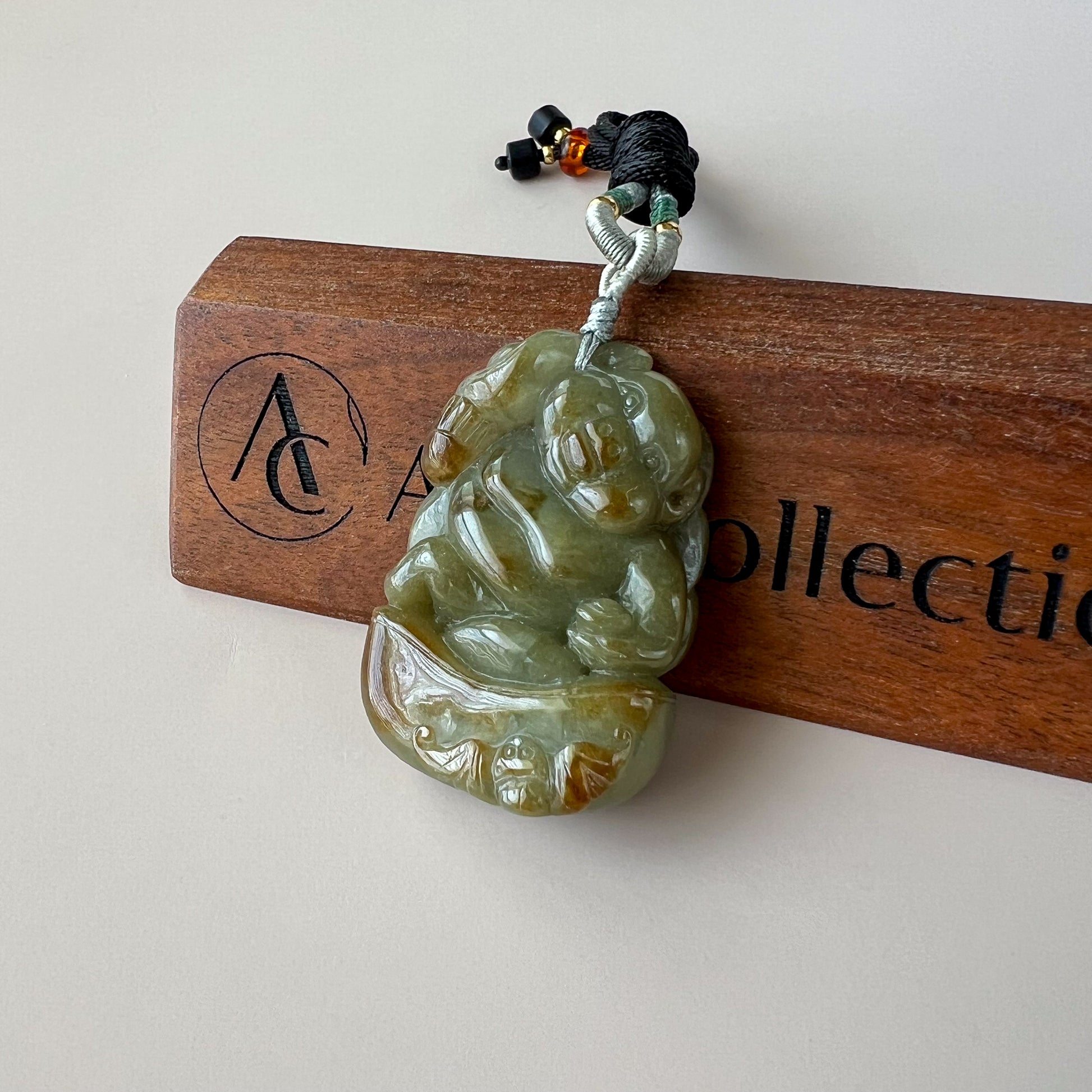 CARVING: This hand-carved jade pendant features Zhu Bajie, the beloved character from Journey to the West, symbolizing humor, resilience, and abundance. He is depicted in lively detail, accompanied by a bat, an auspicious emblem of blessings and happiness in Chinese culture.
