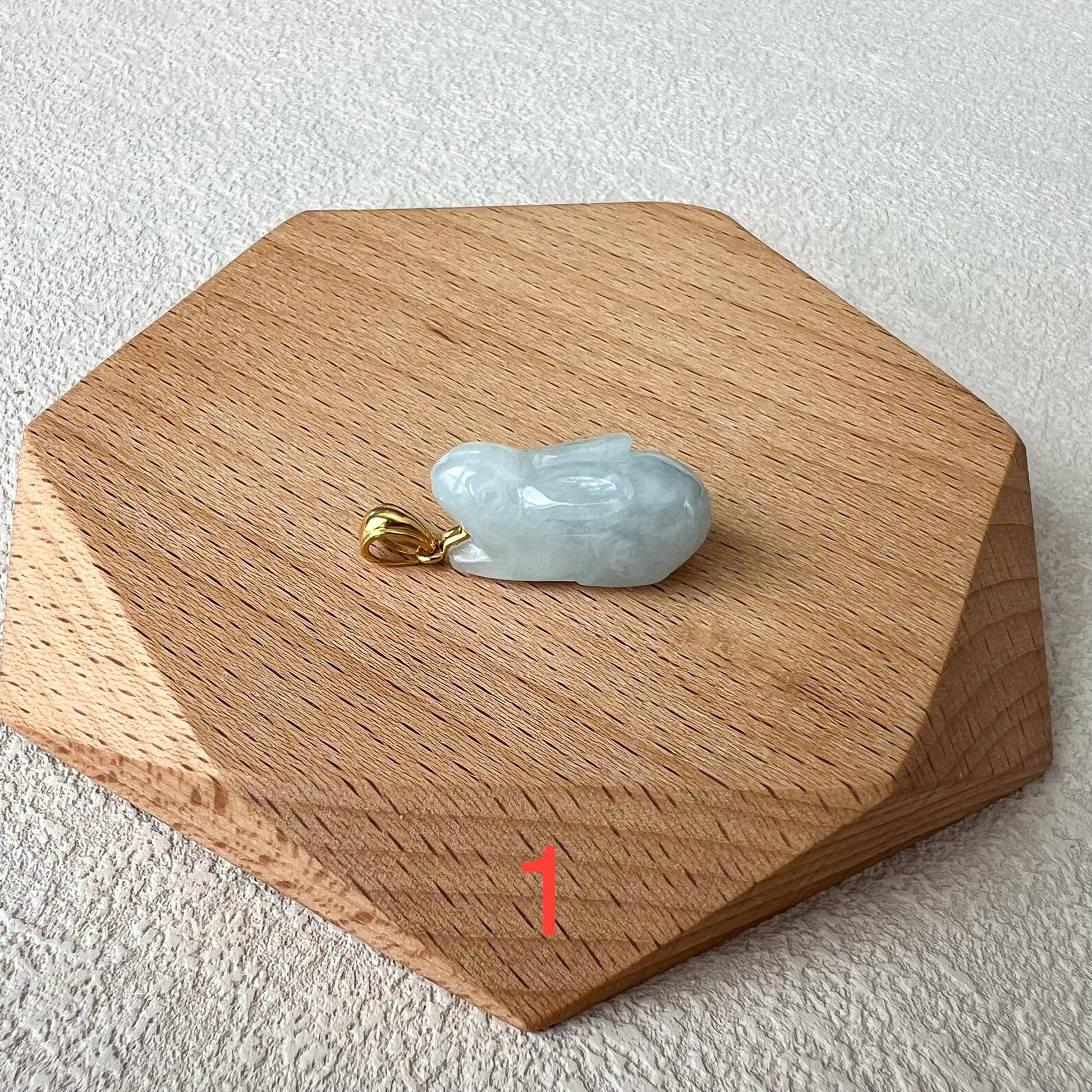 PENDANT: This rabbit pendant is made with natural jadeite jade and 18K solid yellow gold for the bail. The pendant is a charming and delightful piece of jewelry that captures the grace and beauty of these beloved creatures. Crafted with meticulous attention to detail, the pendant showcases the adorable features of a rabbit, making it a whimsical and enchanting accessory.