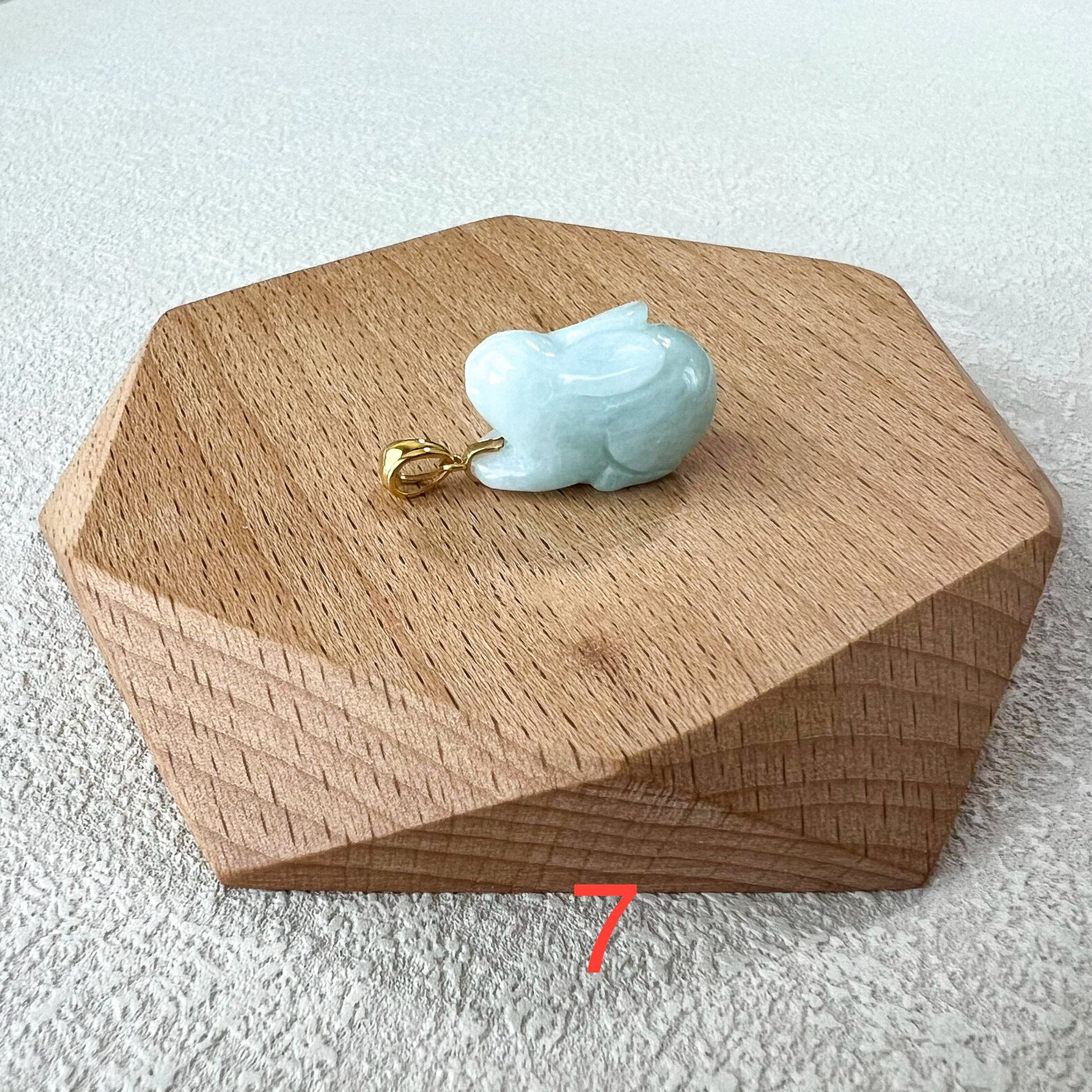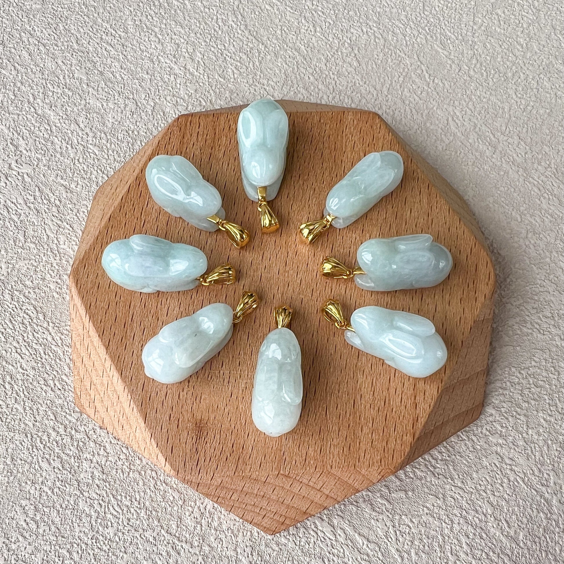 PENDANT: This rabbit pendant is made with natural jadeite jade and 18K solid yellow gold for the bail. The pendant is a charming and delightful piece of jewelry that captures the grace and beauty of these beloved creatures. Crafted with meticulous attention to detail, the pendant showcases the adorable features of a rabbit, making it a whimsical and enchanting accessory.