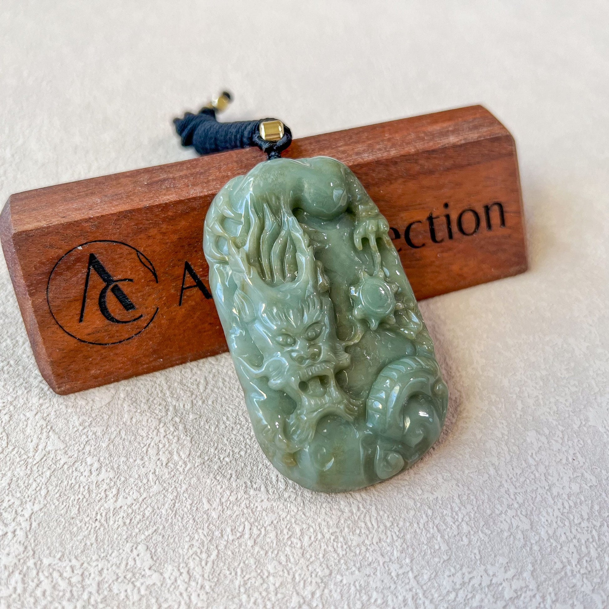 CARVING: The pendant is carved in the form of the Chinese Zodiac - Dragon. This jade piece has beautiful semi-translucent tones with striking hues of green. It is absolutely stunning hand carving, you can see the details of the dragon scales. This piece is a larger piece. It is thick and considered a heavier than most pendants. Check out the measurements, size, and weight before buying! This is a really great stunning large pendant piece. When you wear it, it really stands out in the room!