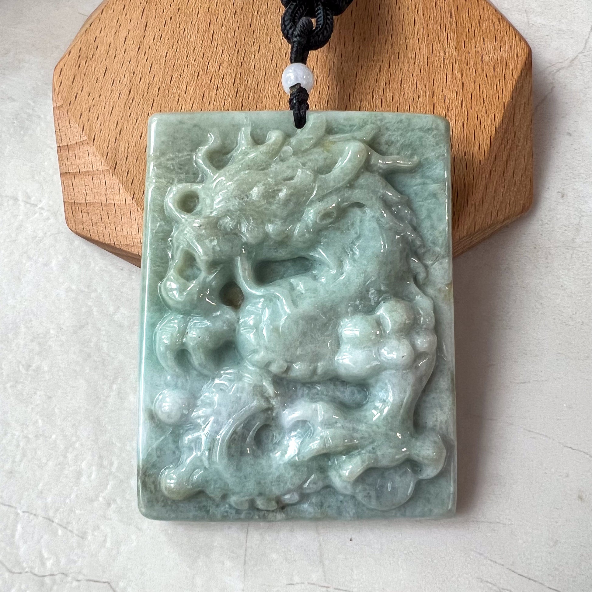CARVING: The pendant is carved in the form of the Chinese Zodiac - Dragon. This jade piece has beautiful green jade tones. It is absolutely stunning hand carving, you can see the details of the dragon scales. This piece is a larger piece. It is thick and considered a heavier than most pendants. Check out the measurements, size, and weight before buying! This is a really great stunning large pendant piece. The master carver has added decorative carving on the back side. The style of this carving is a more "rustic style" meaning not all parts of the piece is perfectly polished. This is to give the natural stone a more natural and rustic feel. When you wear it, it really stands out in the room!