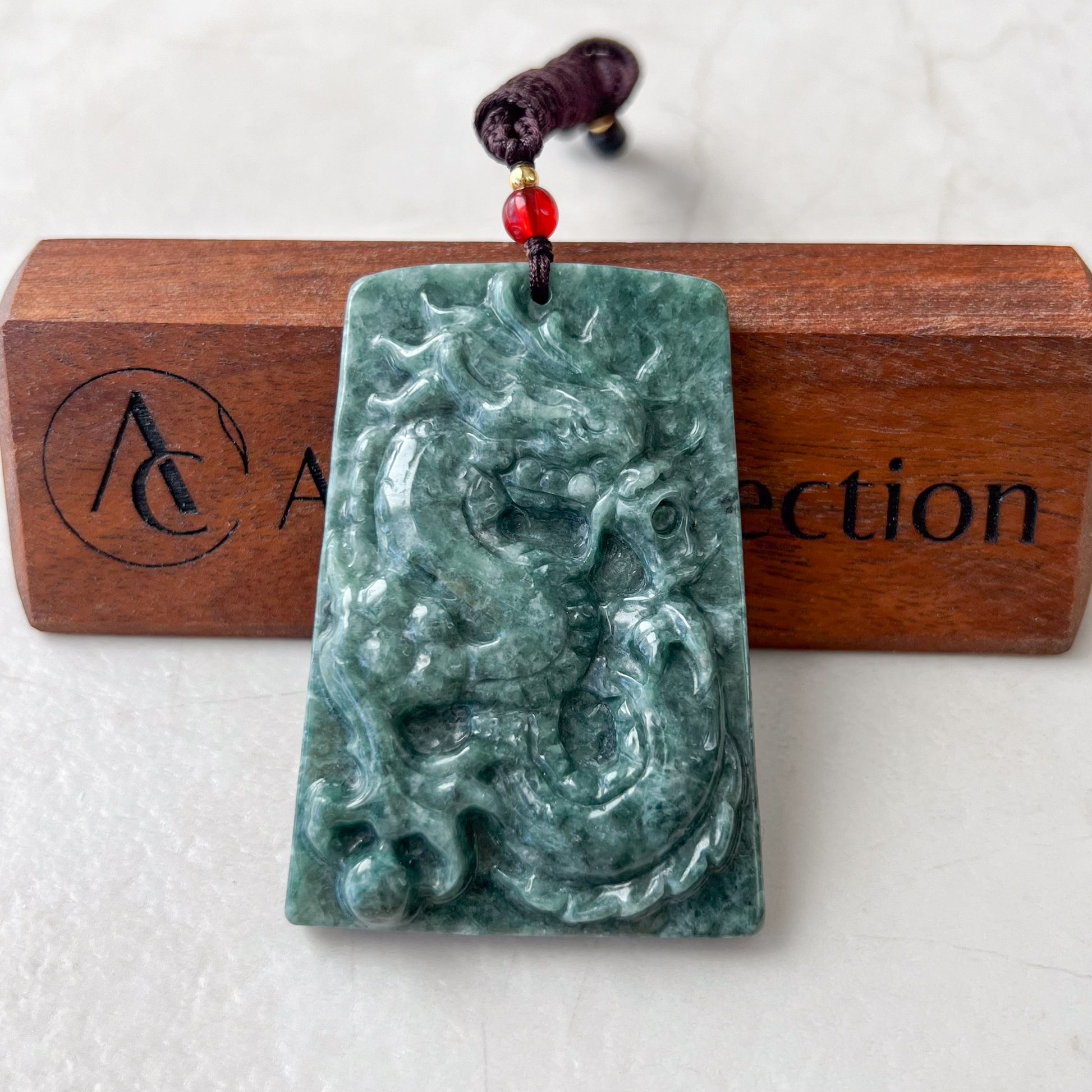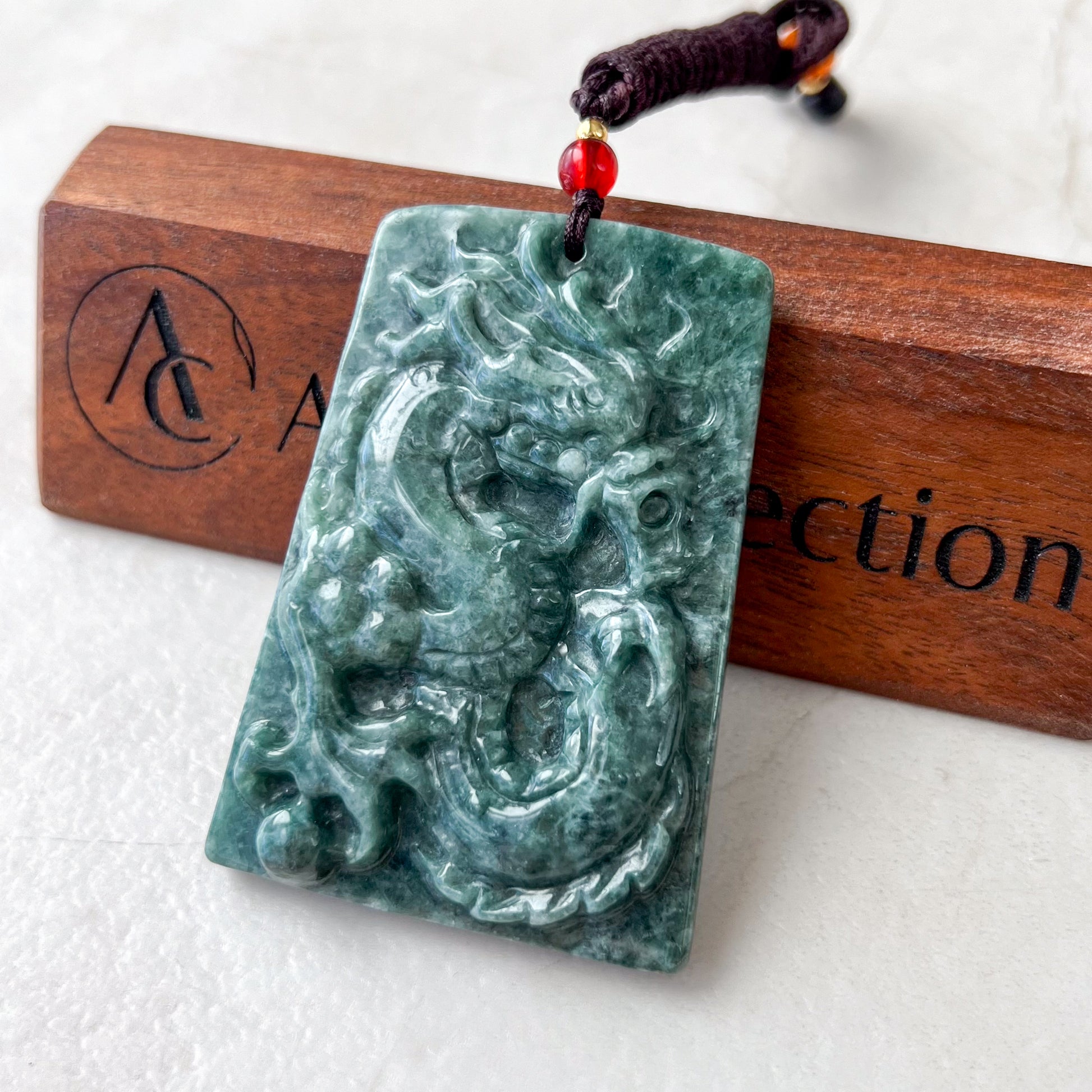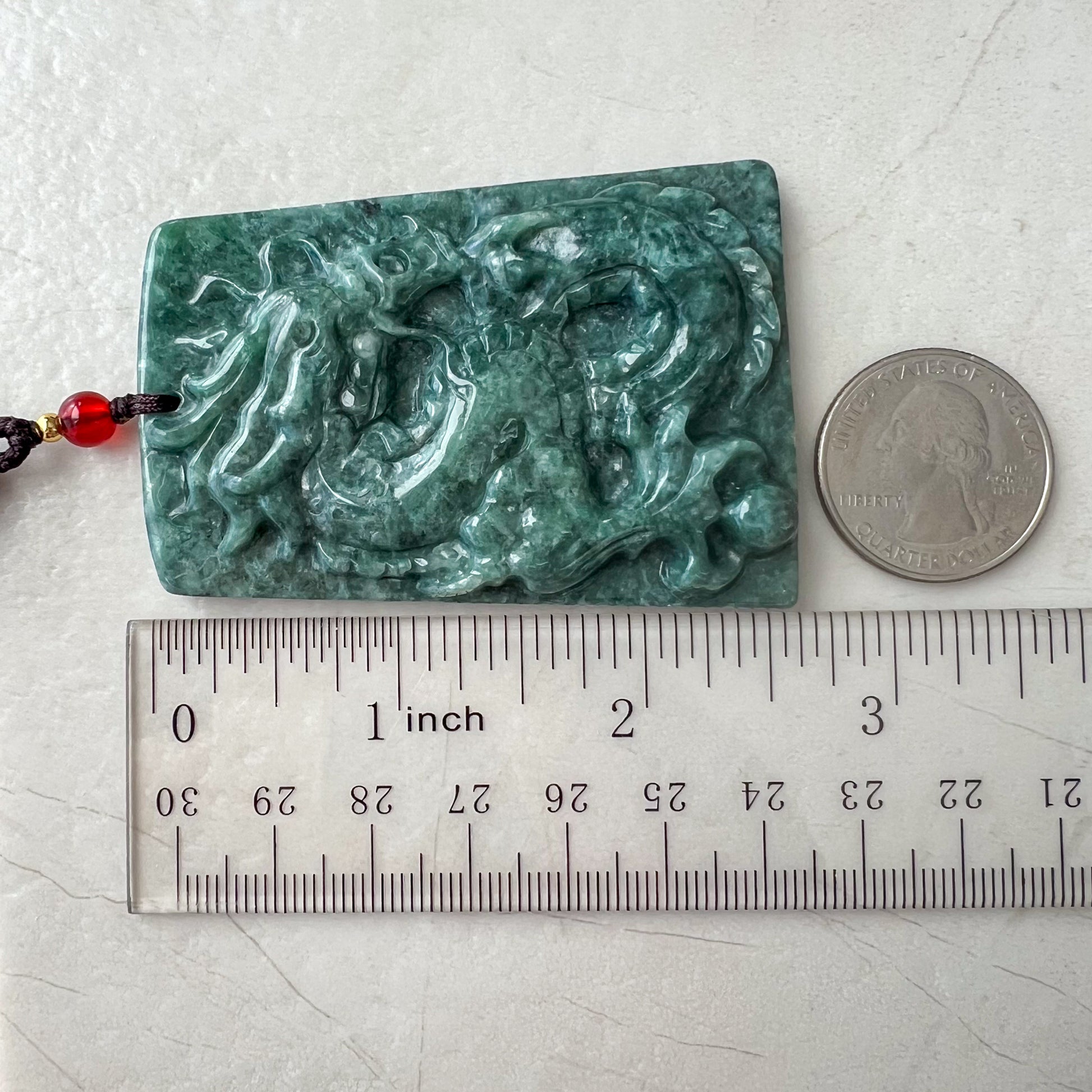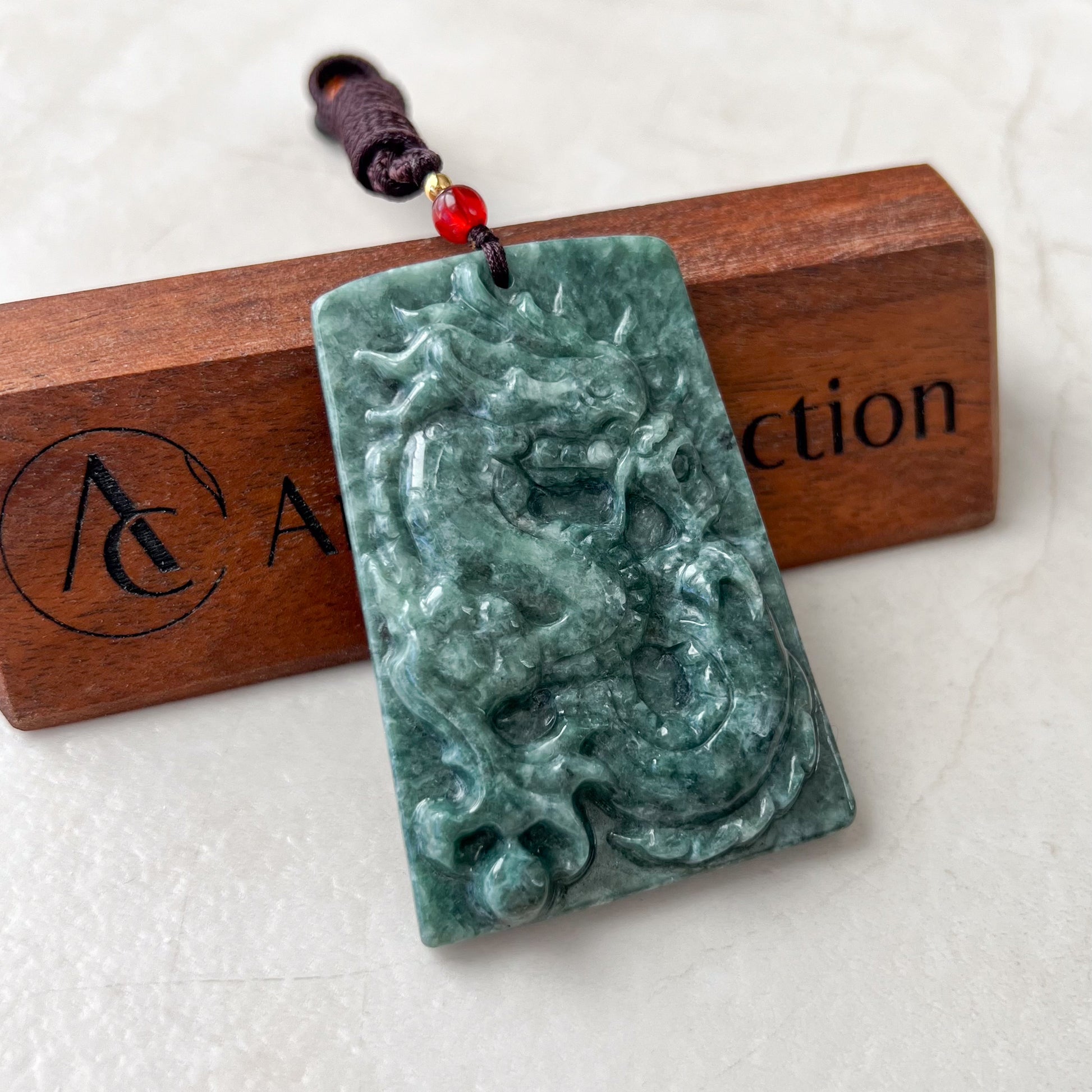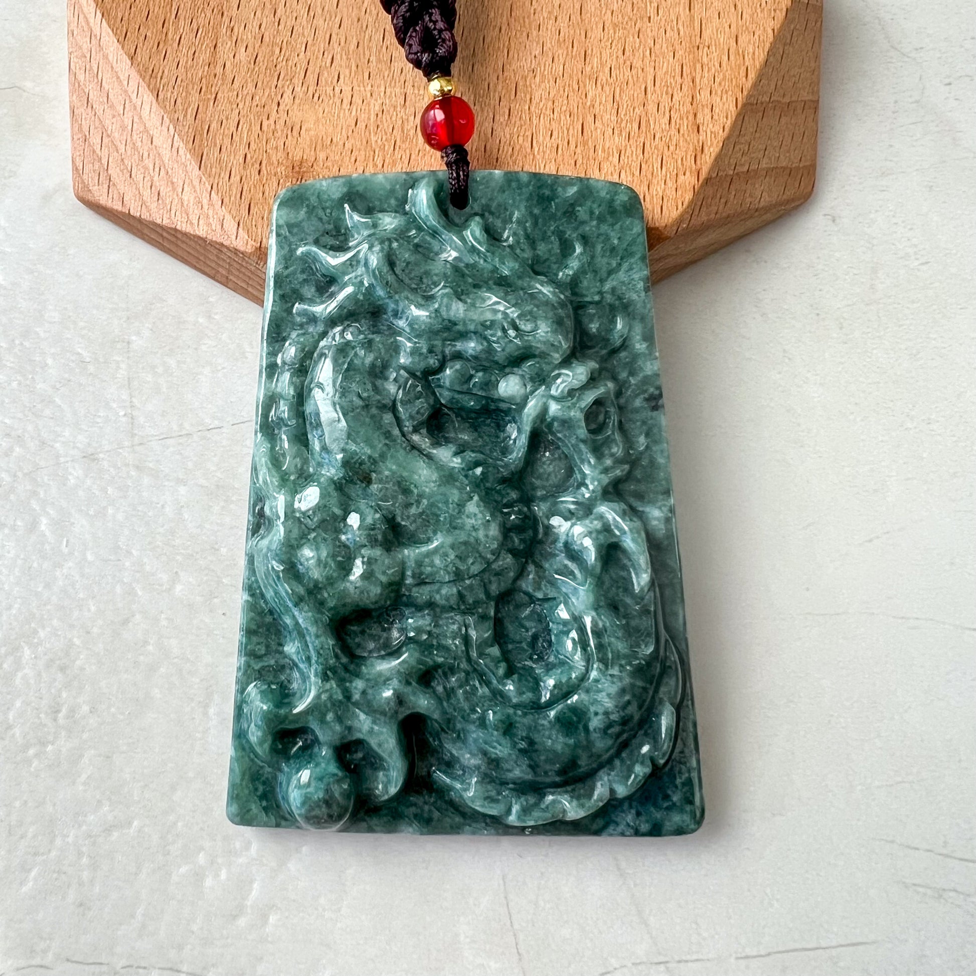 CARVING: The pendant is carved in the form of the Chinese Zodiac - Dragon. This jade piece has beautiful green jade tones. It is absolutely stunning hand carving, you can see the details of the dragon scales. This piece is a larger piece. It is thick and considered a heavier than most pendants. Check out the measurements, size, and weight before buying! This is a really great stunning large pendant piece. When you wear it, it really stands out in the room!
