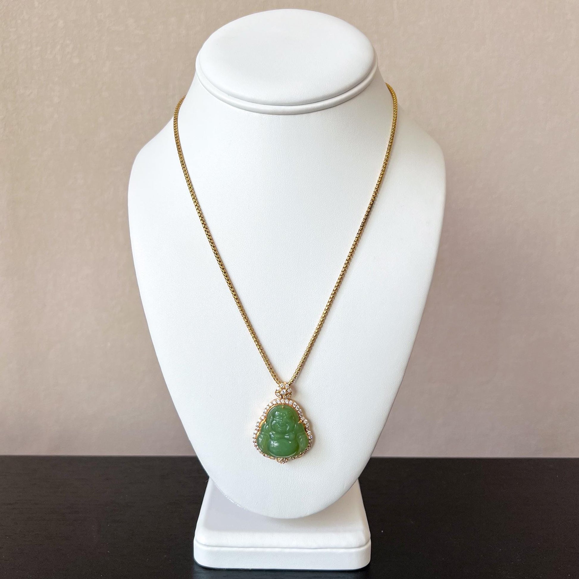 CARVING: This pendant features a meticulously carved jade Laughing/Happy Buddha, set in an 18K solid gold frame that exudes luxury and elegance. The frame is further embellished with accent diamonds, adding a touch of brilliance and sophistication to the piece. The jade itself boasts rich green hues with exceptional reflection, displaying the coveted "cat‘s eye" effect, a premium quality in nephrite jade.