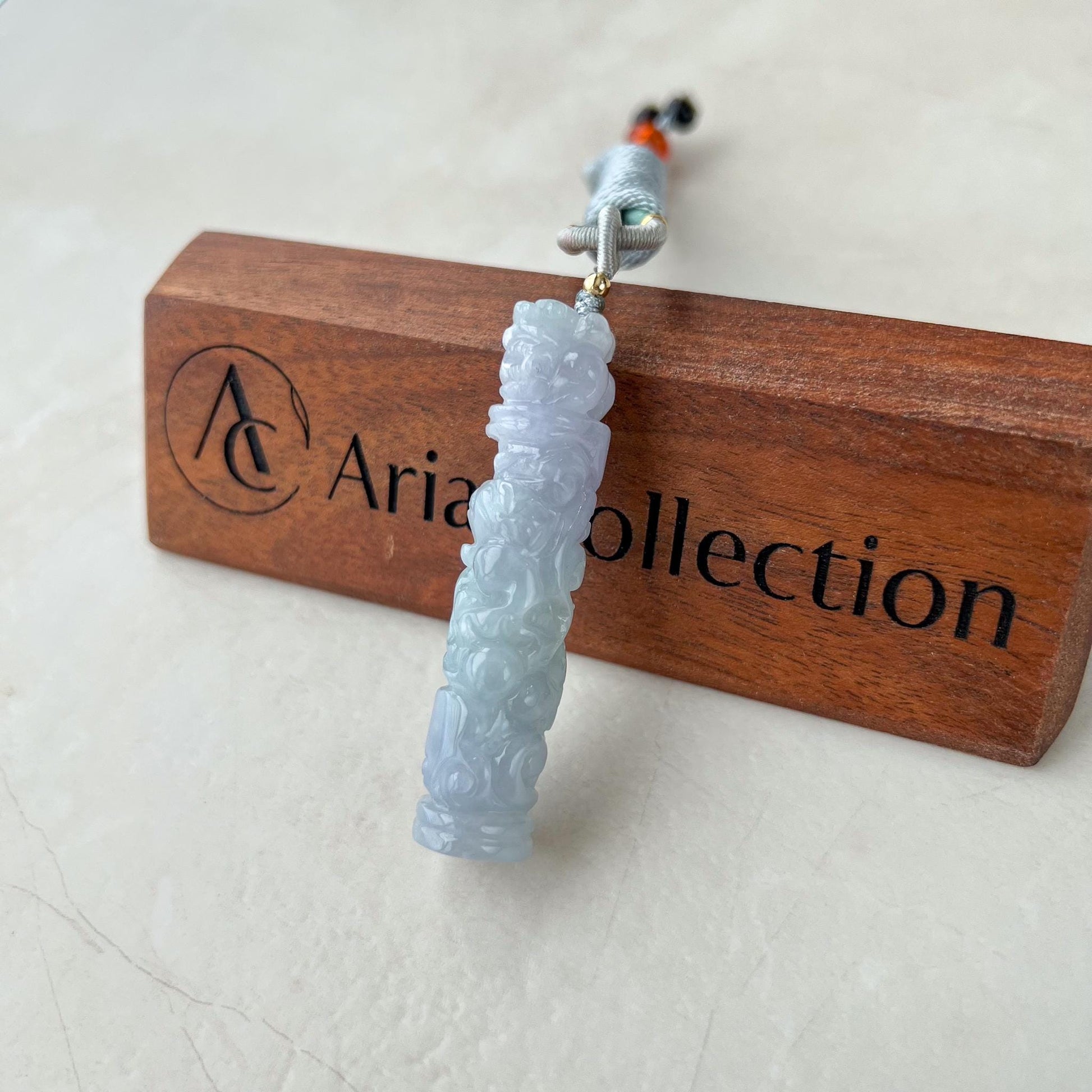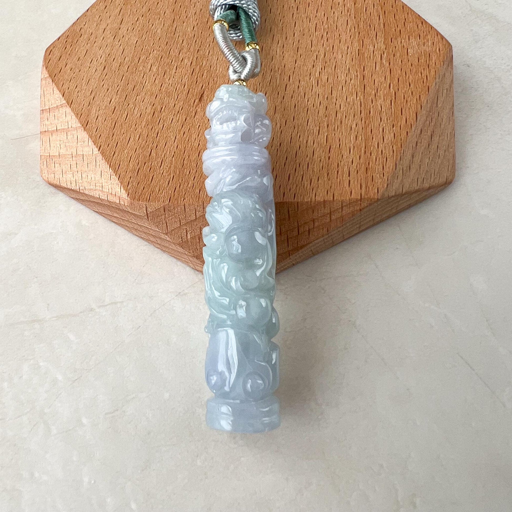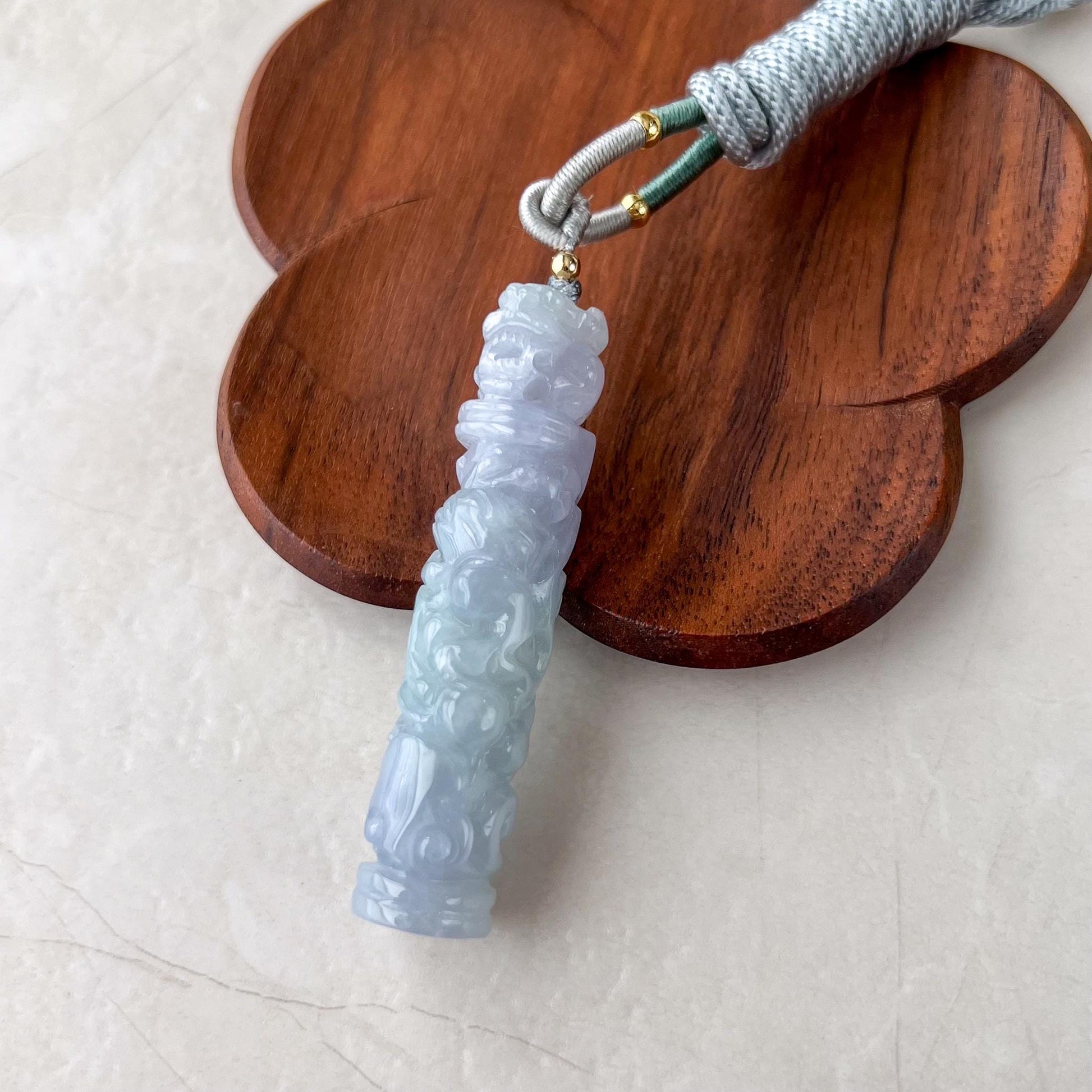 CARVING: This Jade Dragon Pillar Column Pendant is a truly unique, hand-carved masterpiece, crafted from premium icy lavender-blue jadeite. The pendant showcases a magnificent dragon meticulously coiling around a pillar, symbolizing strength, ascension, and protection. Every curve and scale of the dragon has been delicately carved by a skilled artisan, resulting in a highly detailed design that is impossible to replicate.