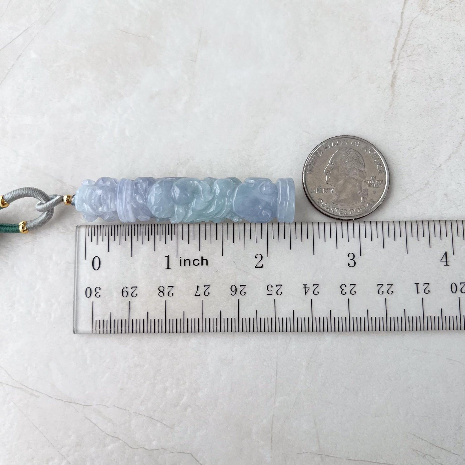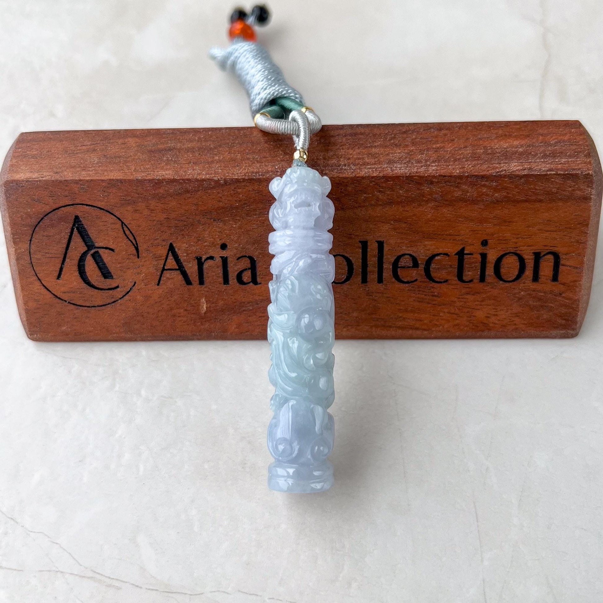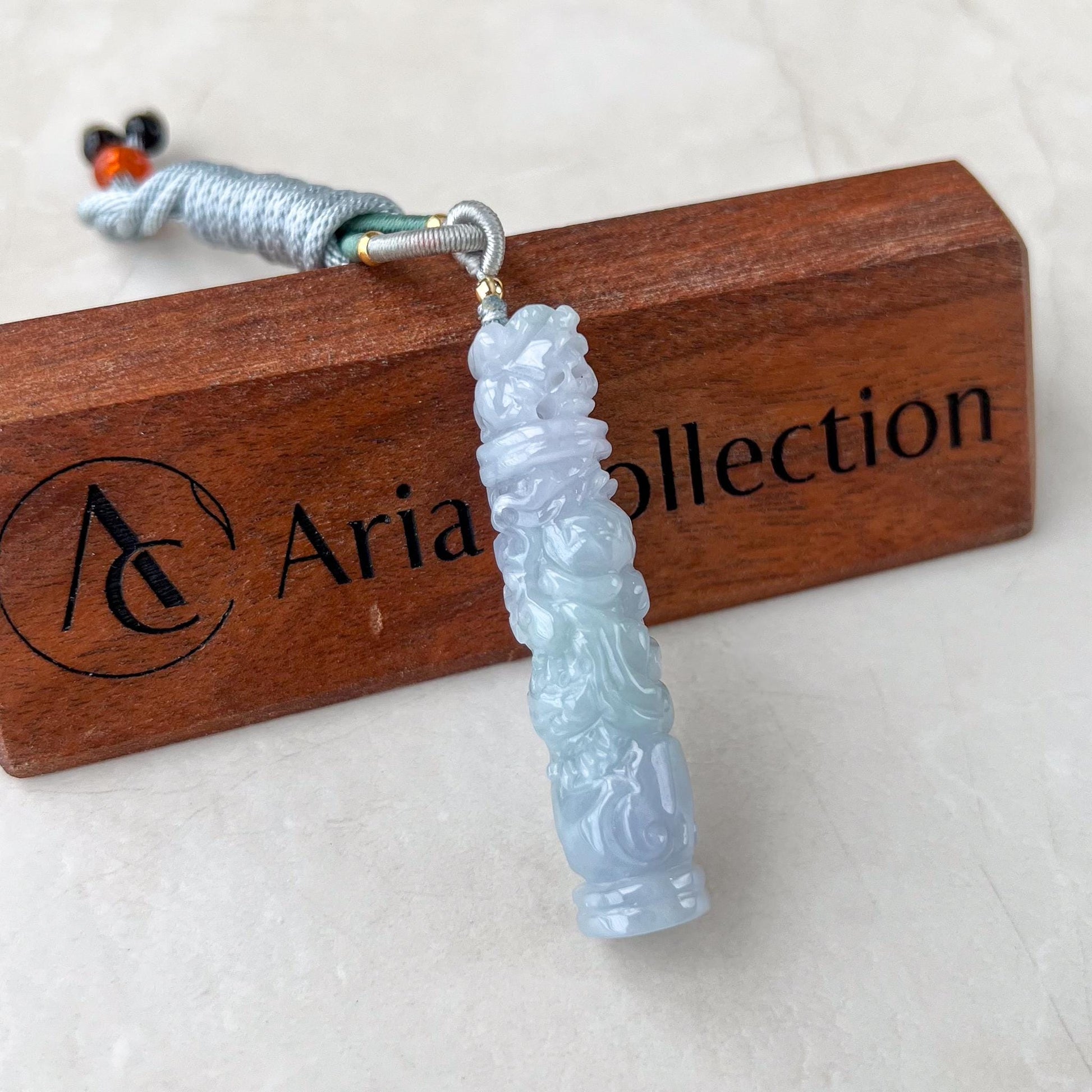 CARVING: This Jade Dragon Pillar Column Pendant is a truly unique, hand-carved masterpiece, crafted from premium icy lavender-blue jadeite. The pendant showcases a magnificent dragon meticulously coiling around a pillar, symbolizing strength, ascension, and protection. Every curve and scale of the dragon has been delicately carved by a skilled artisan, resulting in a highly detailed design that is impossible to replicate.