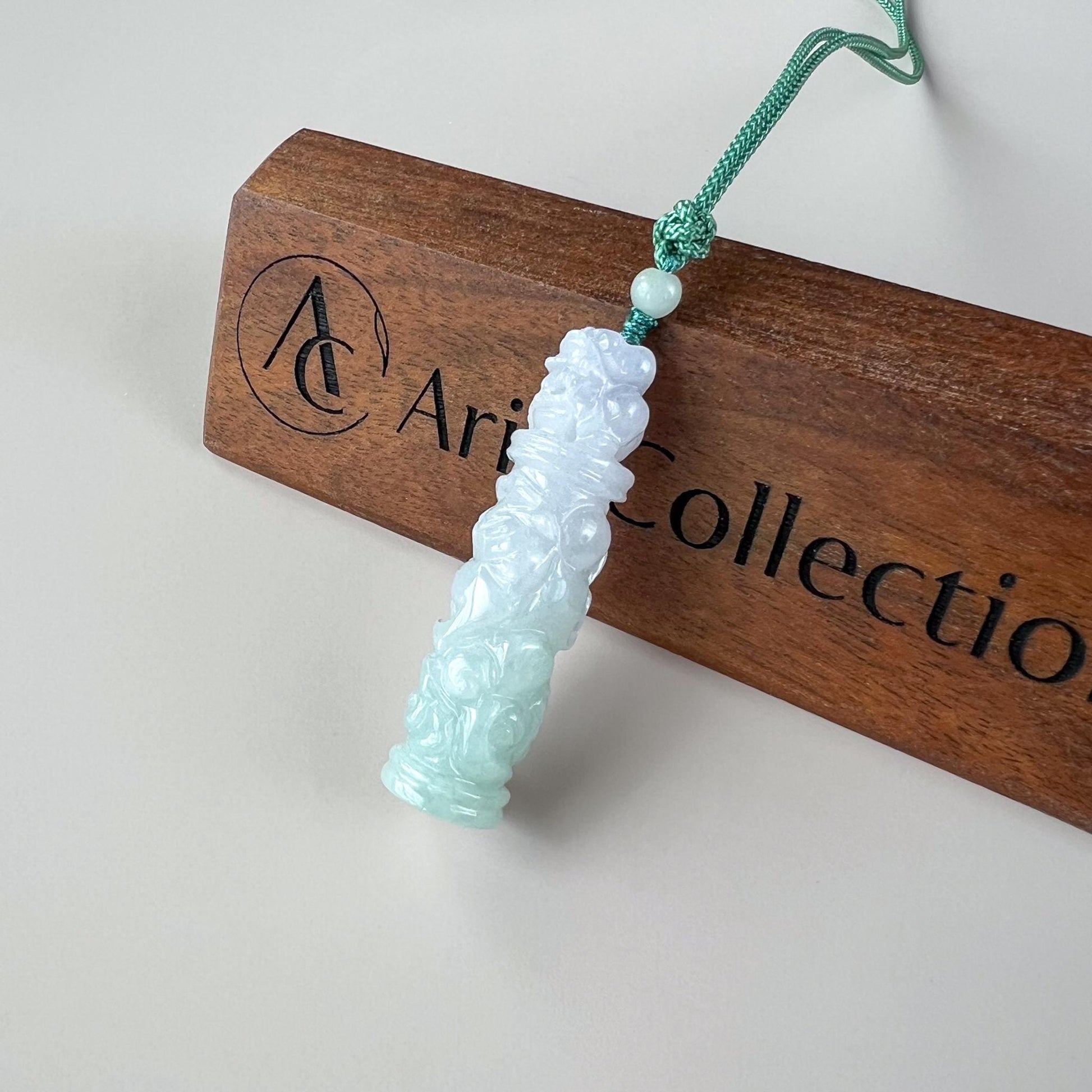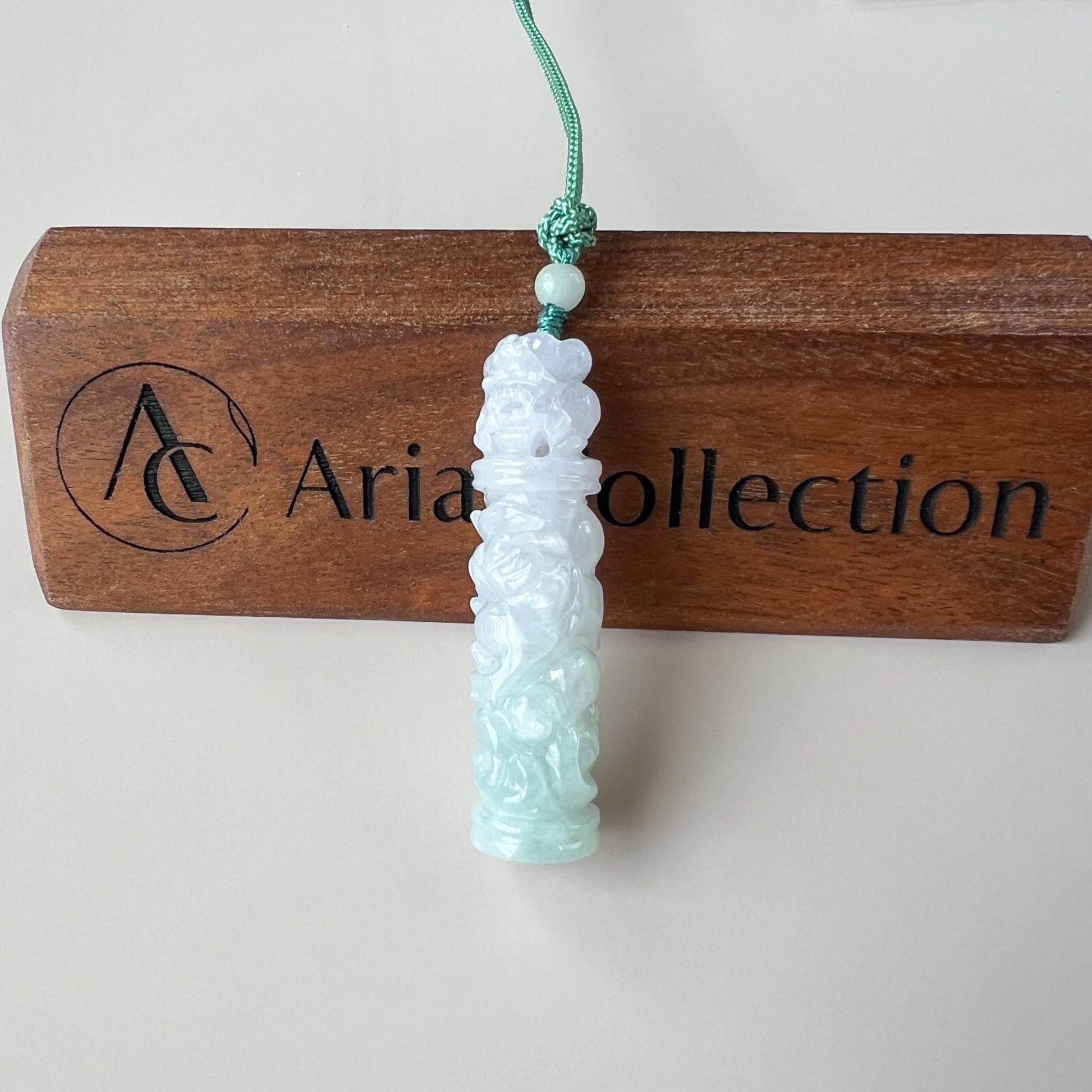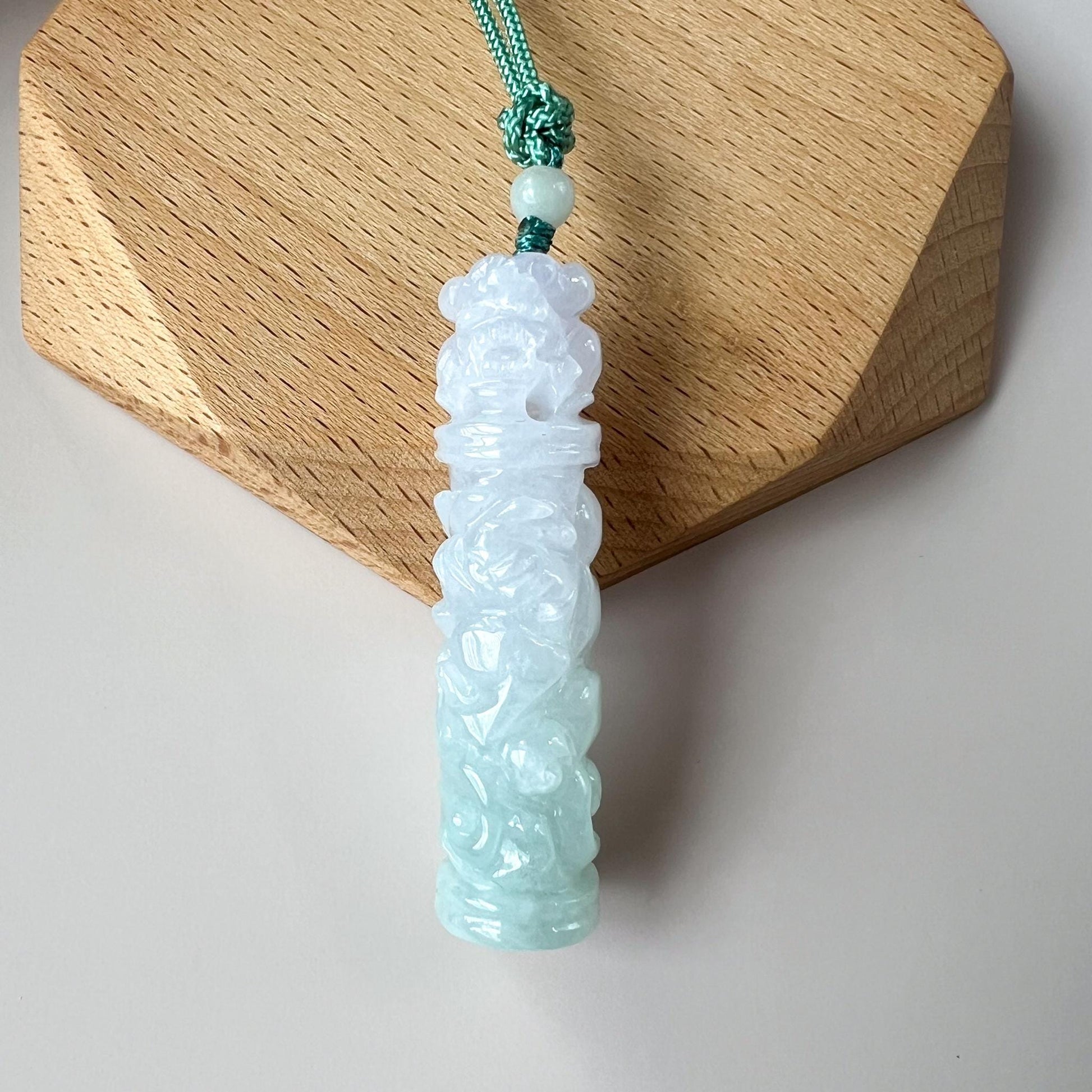CARVING: This Jade Dragon Pillar Column Pendant is a truly unique, hand-carved masterpiece, crafted from premium icy lavender-blue jadeite. The pendant showcases a magnificent dragon meticulously coiling around a pillar, symbolizing strength, ascension, and protection. Every curve and scale of the dragon has been delicately carved by a skilled artisan, resulting in a highly detailed design that is impossible to replicate.