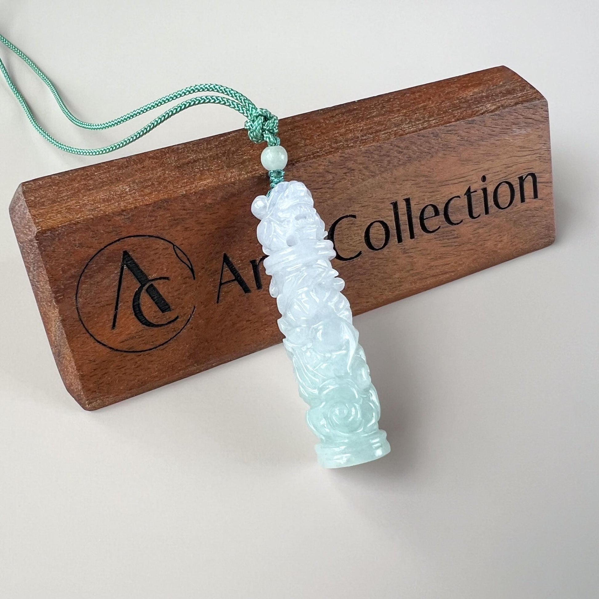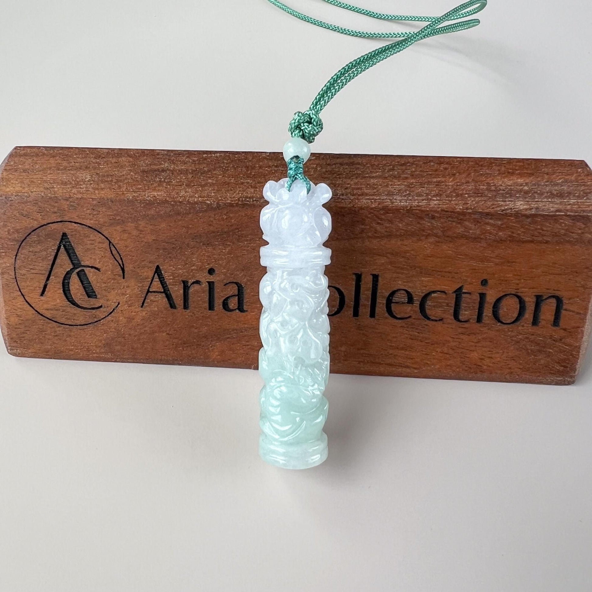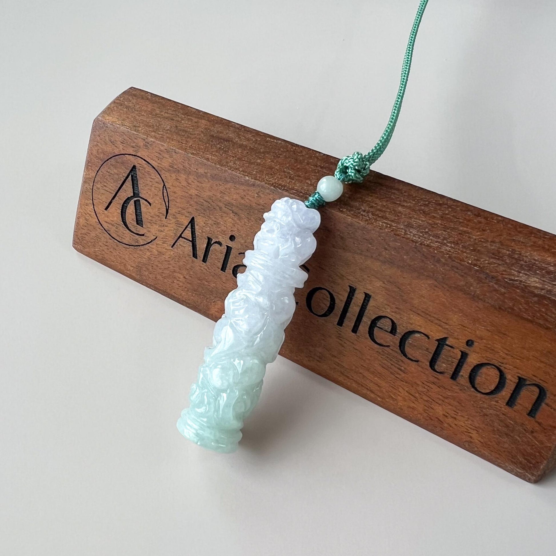 CARVING: This Jade Dragon Pillar Column Pendant is a truly unique, hand-carved masterpiece, crafted from premium icy lavender-blue jadeite. The pendant showcases a magnificent dragon meticulously coiling around a pillar, symbolizing strength, ascension, and protection. Every curve and scale of the dragon has been delicately carved by a skilled artisan, resulting in a highly detailed design that is impossible to replicate.