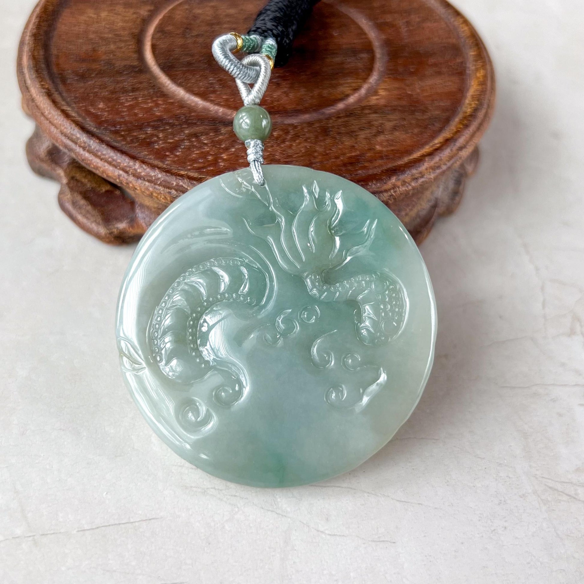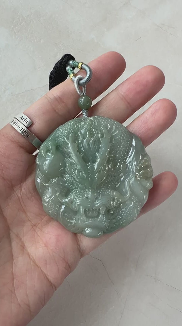 The design of this Dragon Symbolism Pendant is expertly crafted to highlight the intricate details of the dragon, from its scaled body to its fierce expression and flowing mane. It is hand-carved from natural grade a jadeite jade.