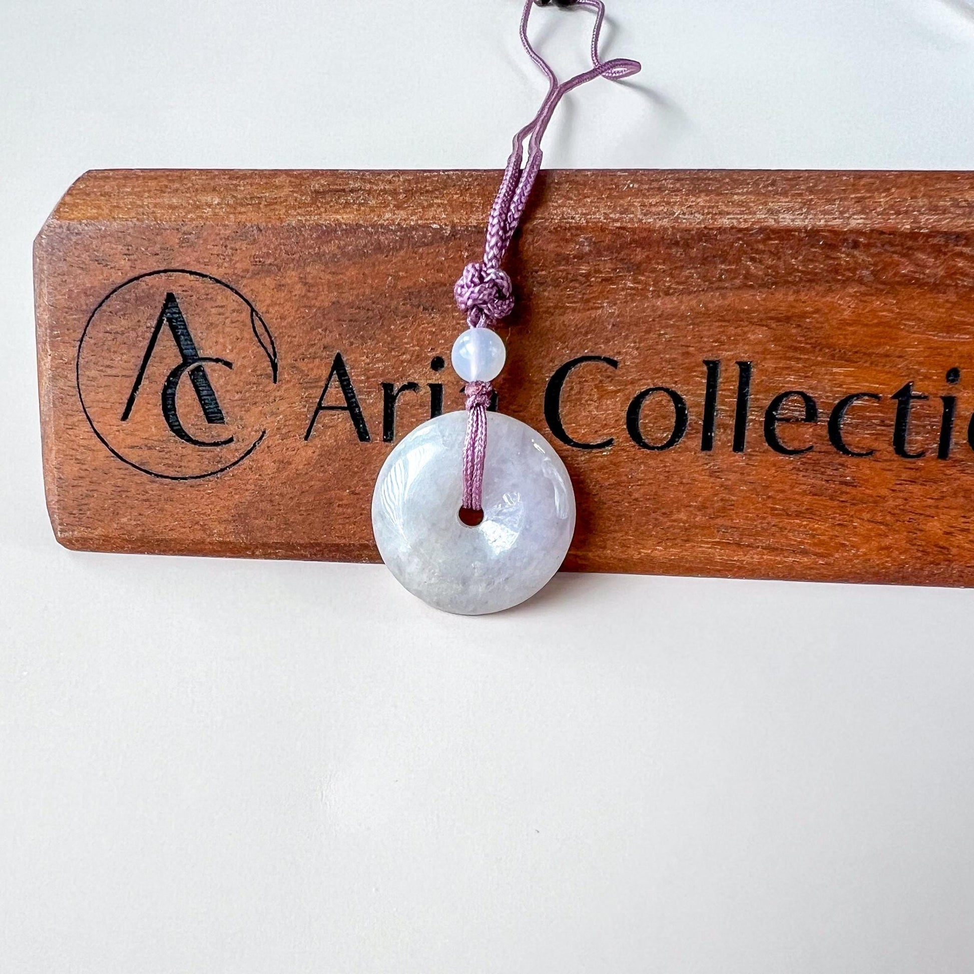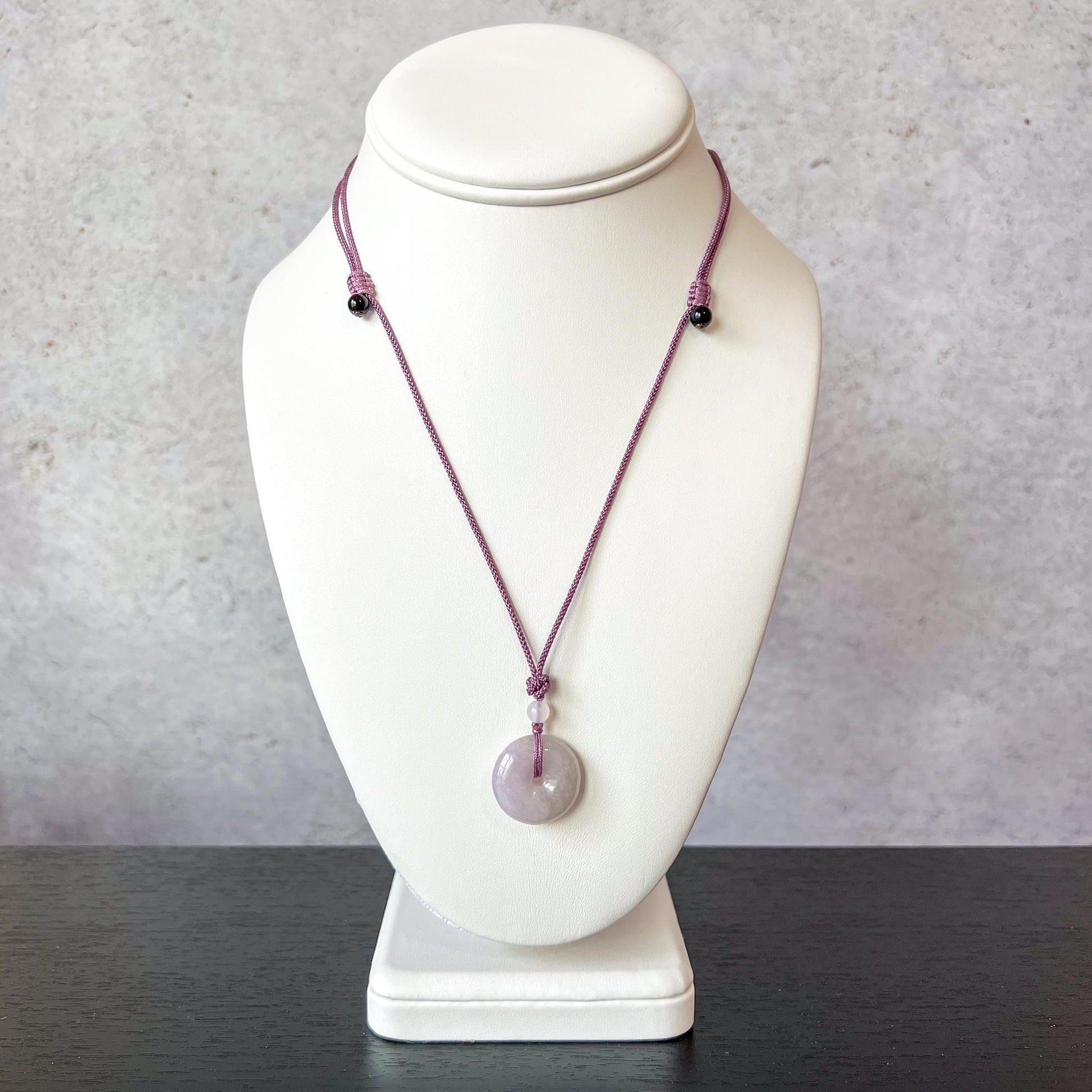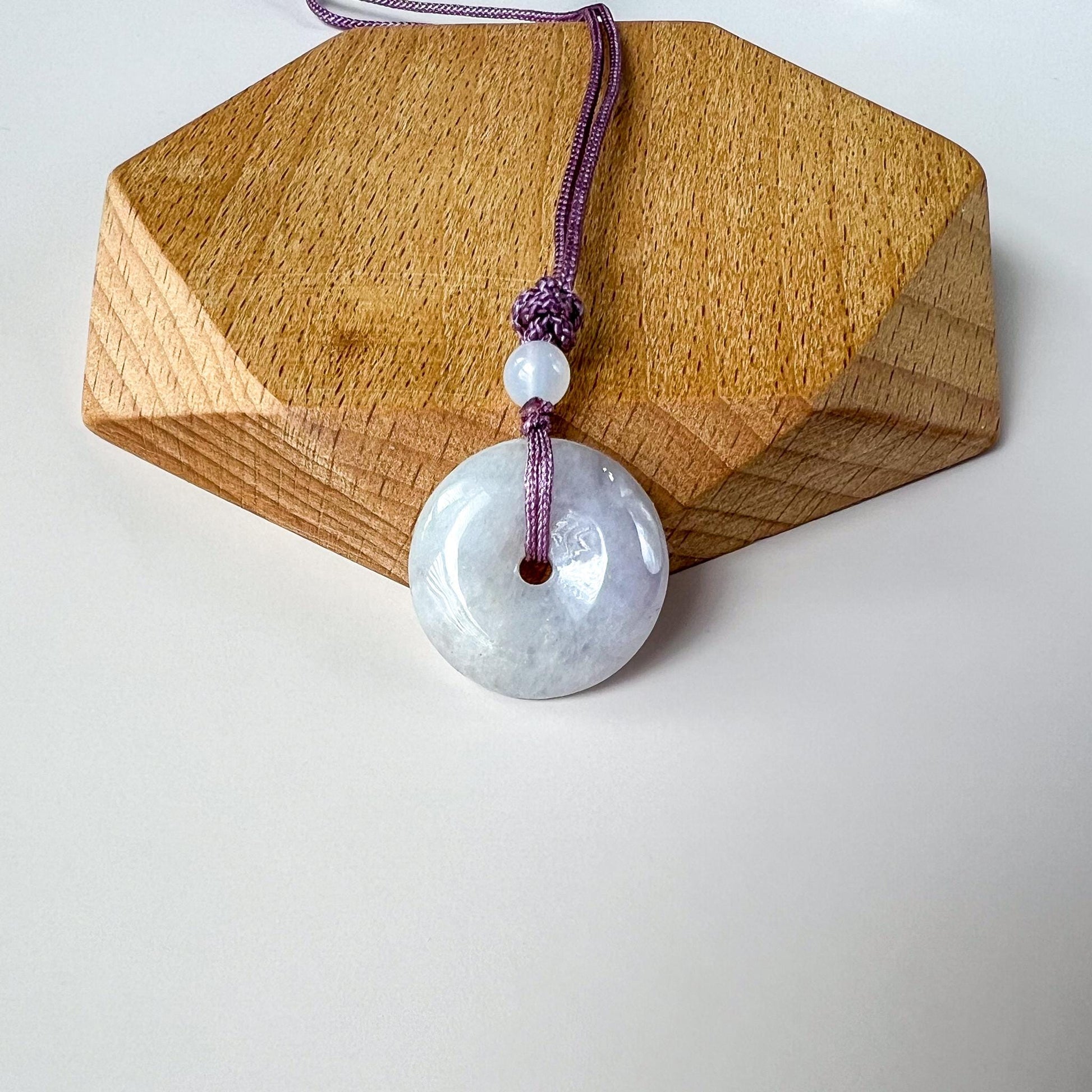 CARVING: The Light Lavender Harmony Circle Jade Pendant, Ping An Kou is a stunning piece that embodies the essence of peace, balance, and harmony. Crafted from high-quality jadeite, the pendant features a classic “Ping An Kou” (平安扣) design, which symbolizes protection, safety, and good fortune. The circular shape, representing completeness and unity, adds a timeless and elegant touch, resonating with the deep cultural significance of continuity and wholeness.