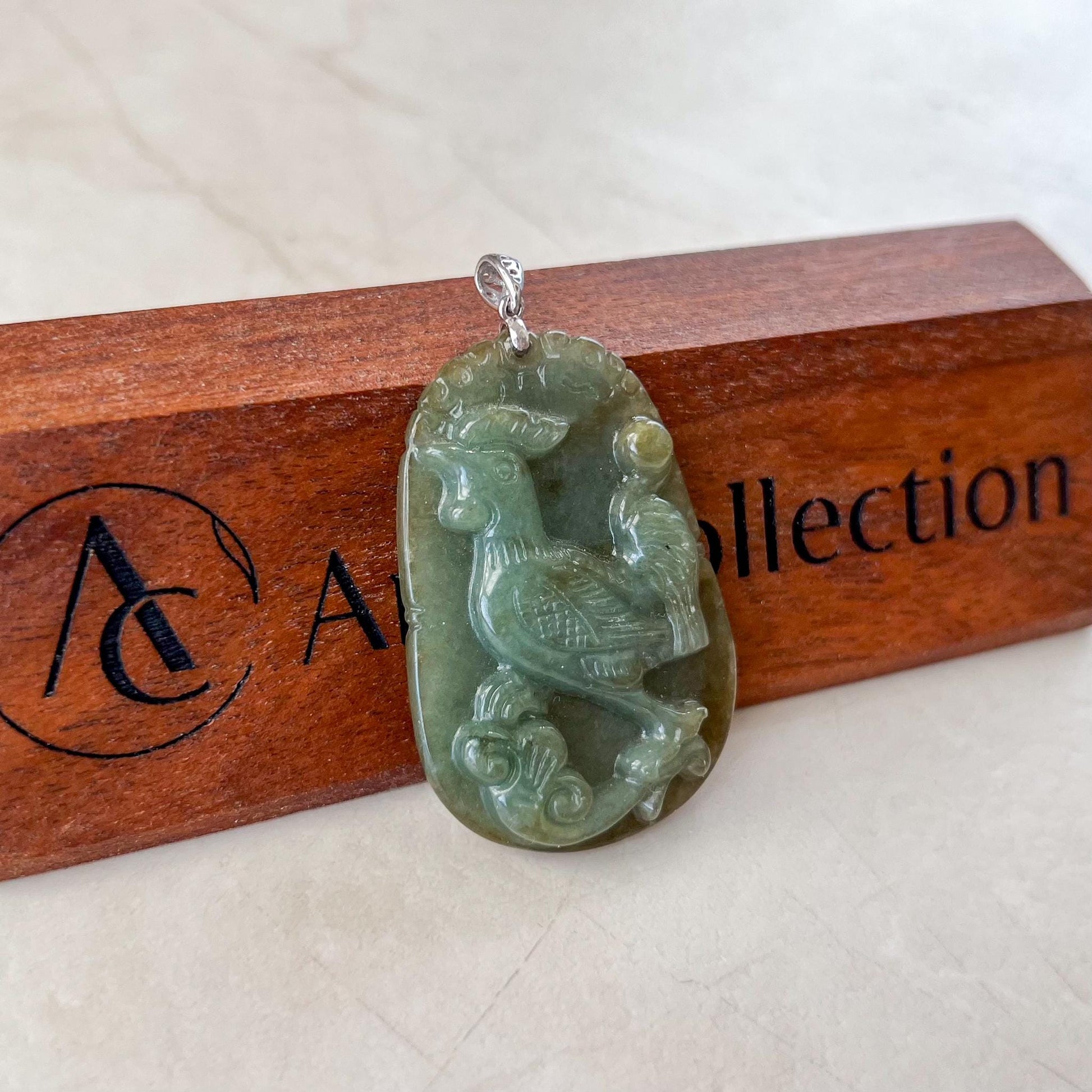 CARVING: This elegant jade pendant showcases a finely carved rooster, a symbol of vigilance, prosperity, and good fortune. Crafted from natural green jade, the pendant carries a calming energy that promotes balance and protection, while the detailed carving highlights the rooster’s proud stance and intricate feathers. Finished with a sterling silver bail, it is both a meaningful talisman and a timeless piece of jewelry, perfect for those who value tradition, symbolism, and enduring beauty.