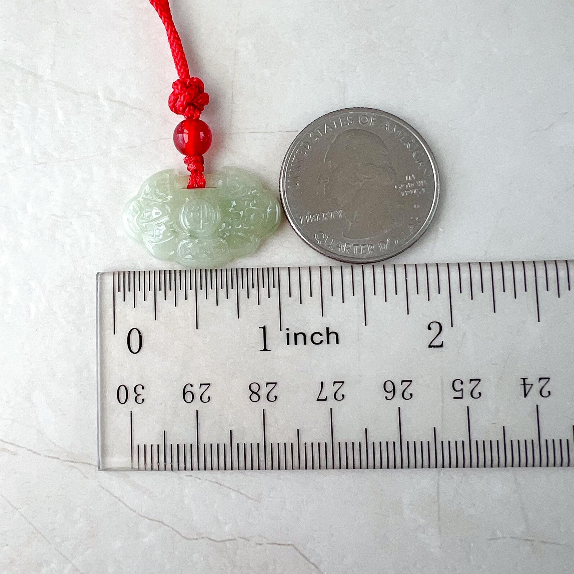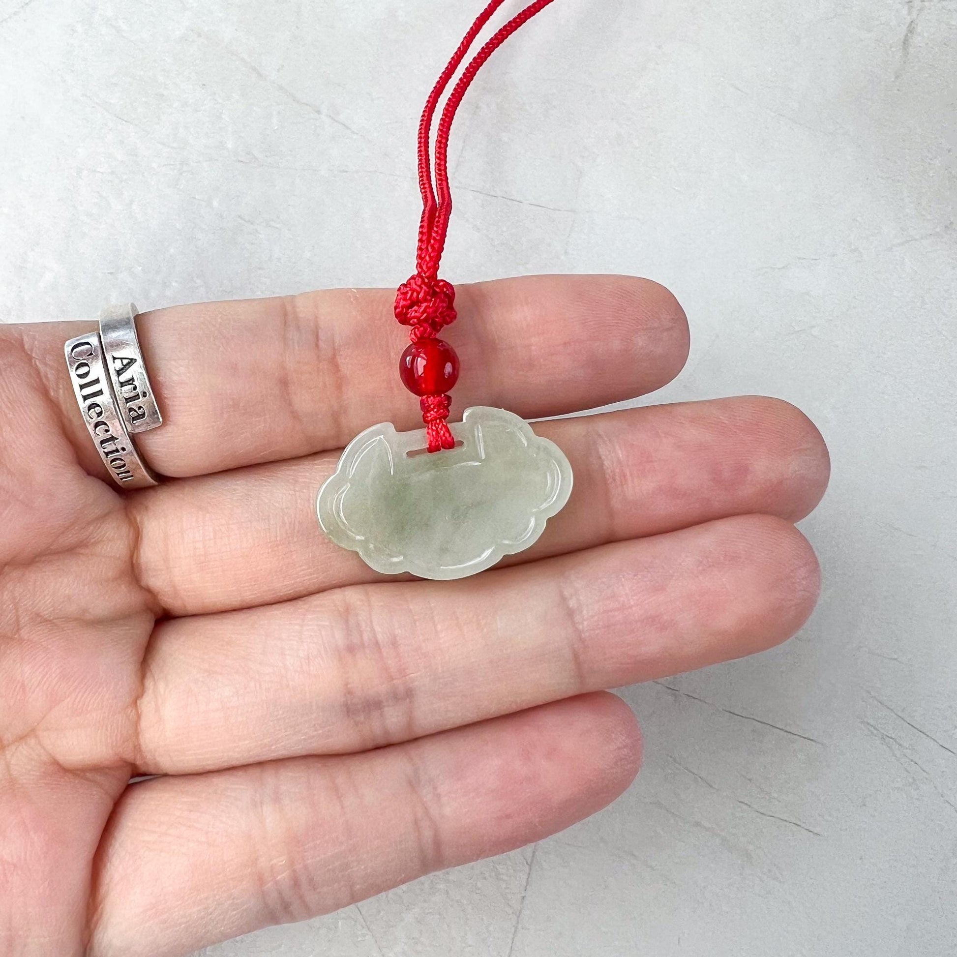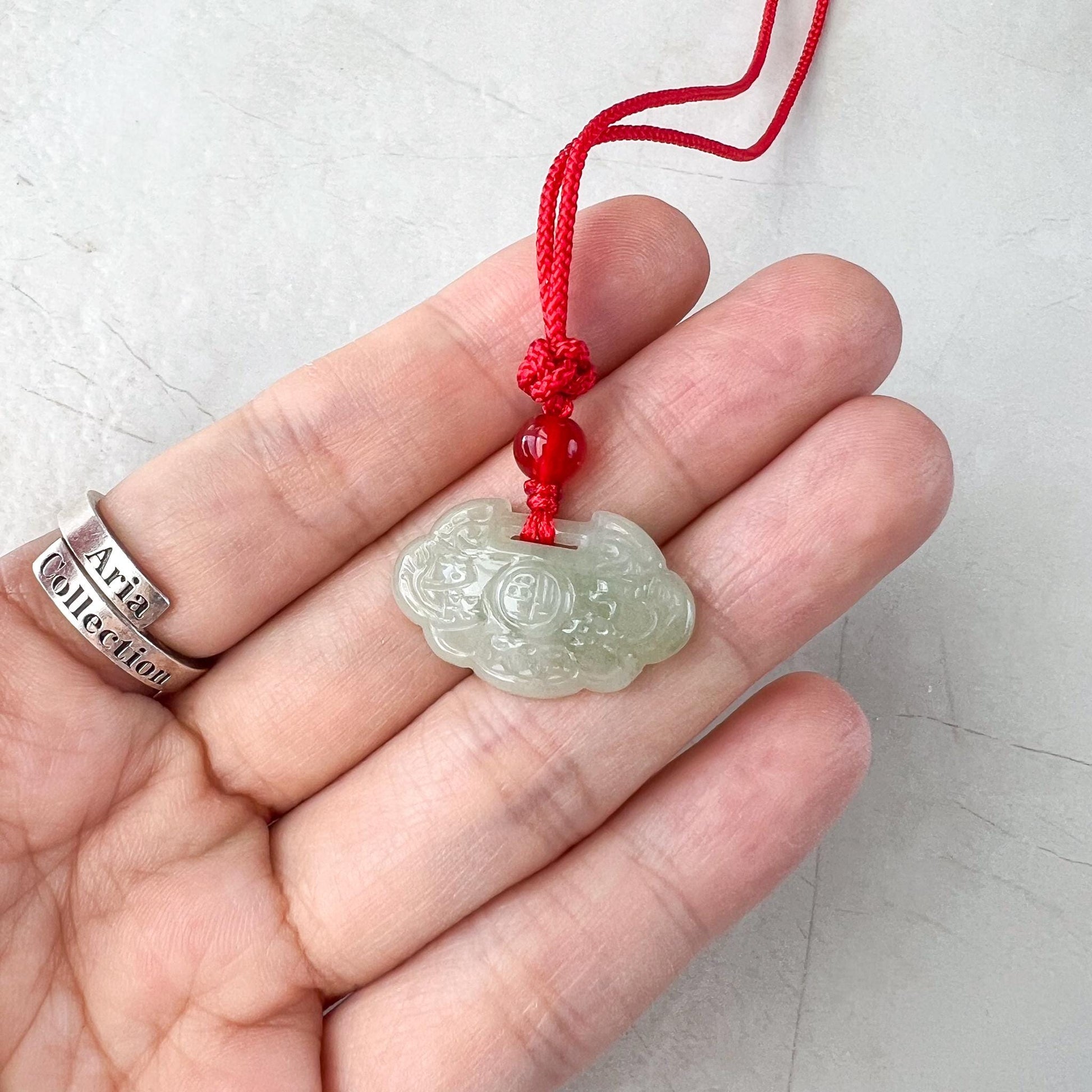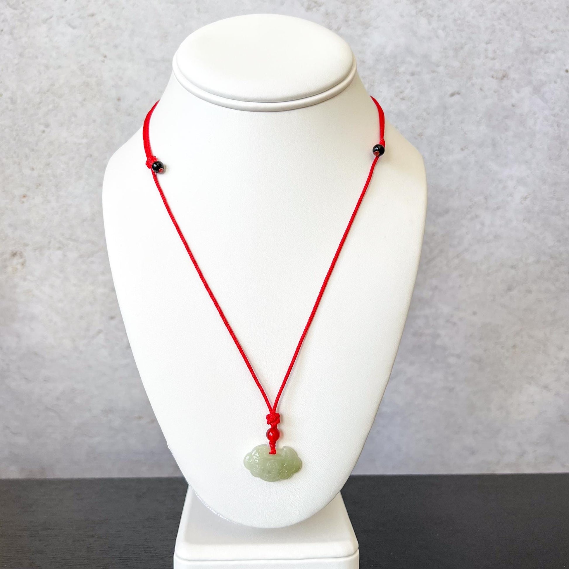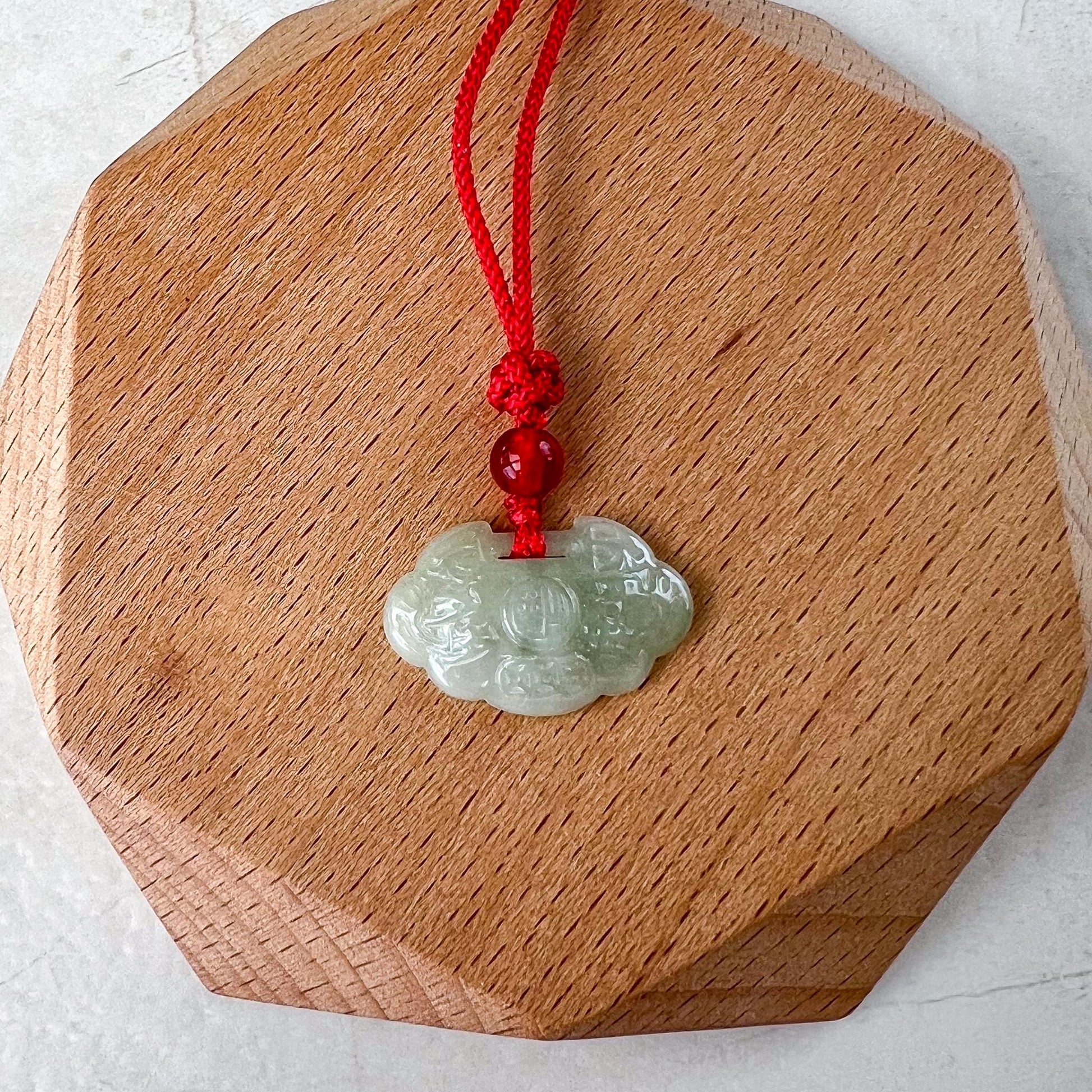 Crafted from natural jade, the pendant has a smooth, light green that reflects harmony and vitality. It is paired with a striking red cord and bead—red symbolizing prosperity and protection—making it not only a powerful talisman but also a beautiful piece of cultural artistry.