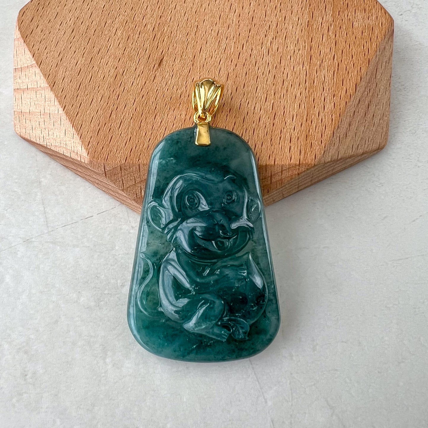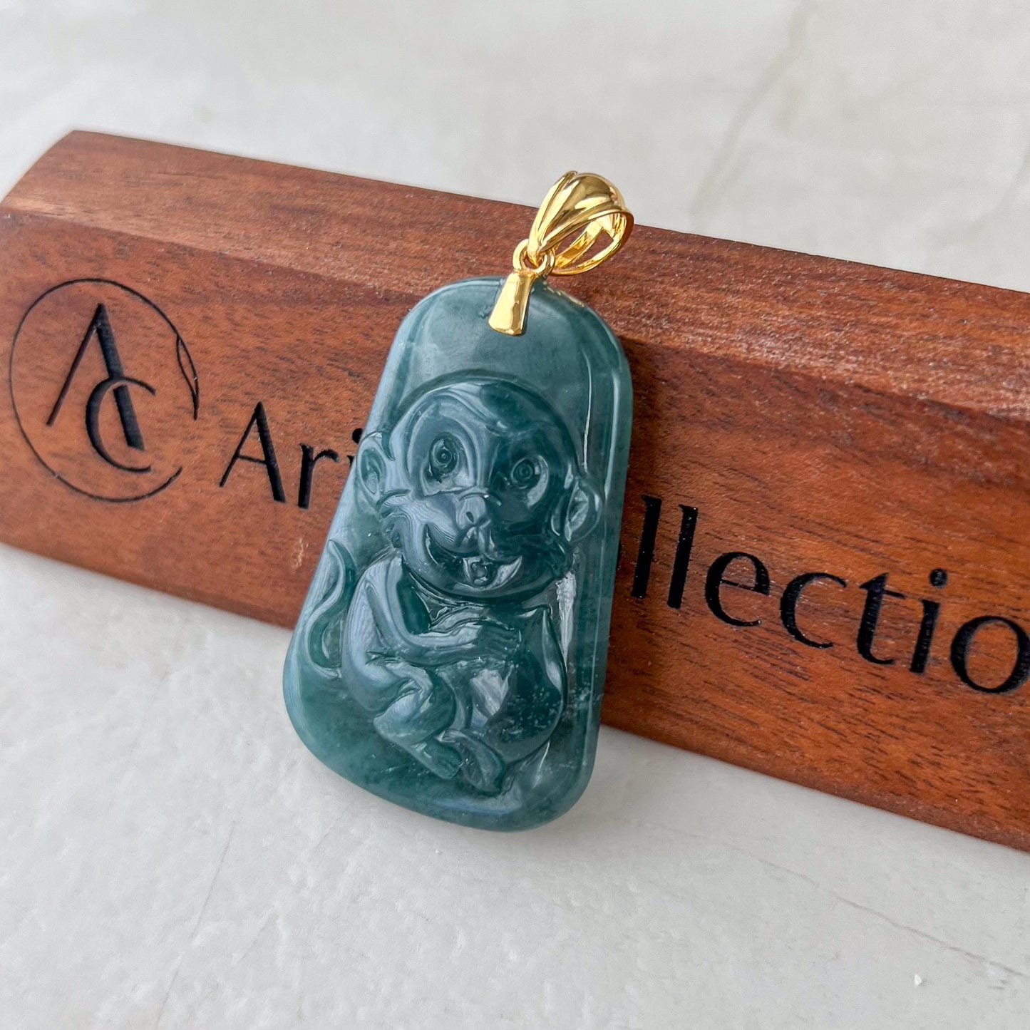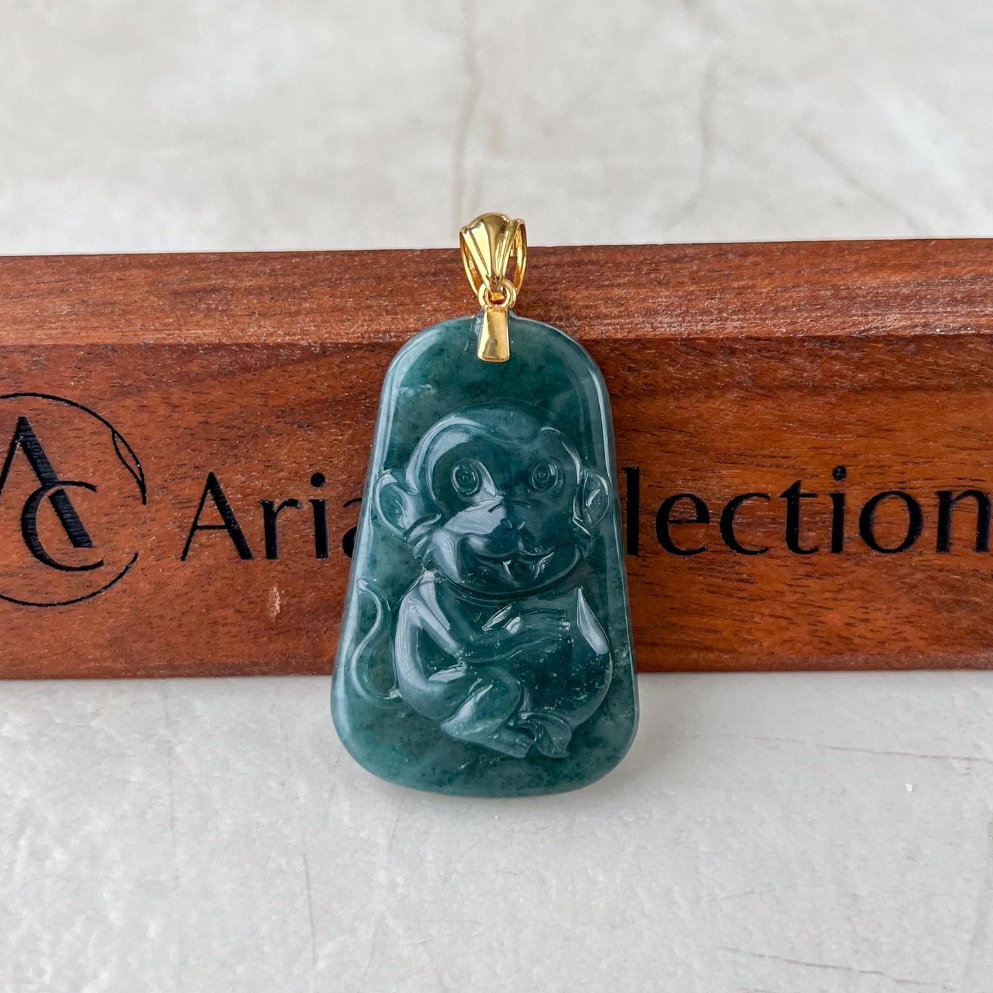Accentuated by an elegant 18K solid gold bail, this pendant strikes a perfect balance between luxury and meaning. The warm glow of the gold enhances the rich green hue of the jade, adding an element of refinement while ensuring durability. The craftsmanship extends to every detail, with the monkeys finely carved fur texture and the smooth, polished surface of the jade peach adding depth and artistry to the design.