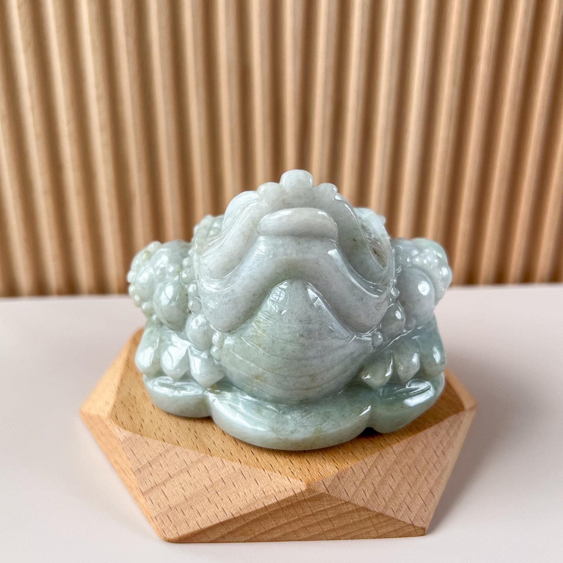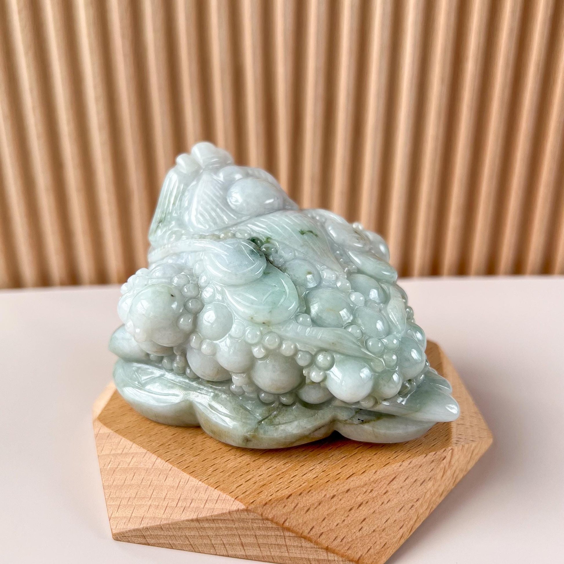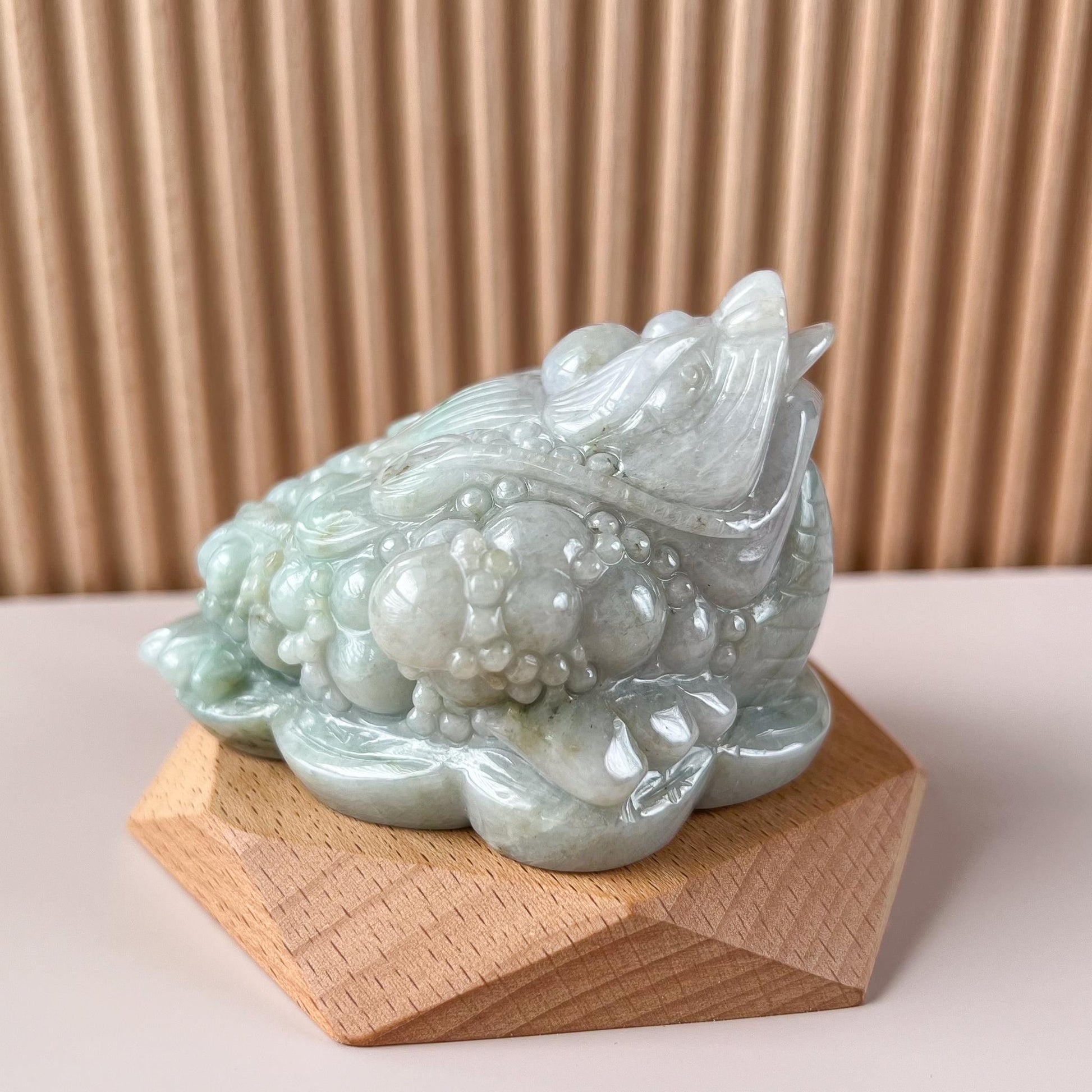 CARVING: This exquisite hand-carved jade Fortune Toad (also known as the Money Frog or Chan Chu 蟾蜍) is a powerful symbol of wealth, prosperity, and good fortune in Chinese culture. Crafted from natural jadeite, the figurine showcases fine detailing—from the toad’s textured back and strong form to the clusters of coins and treasures it guards.