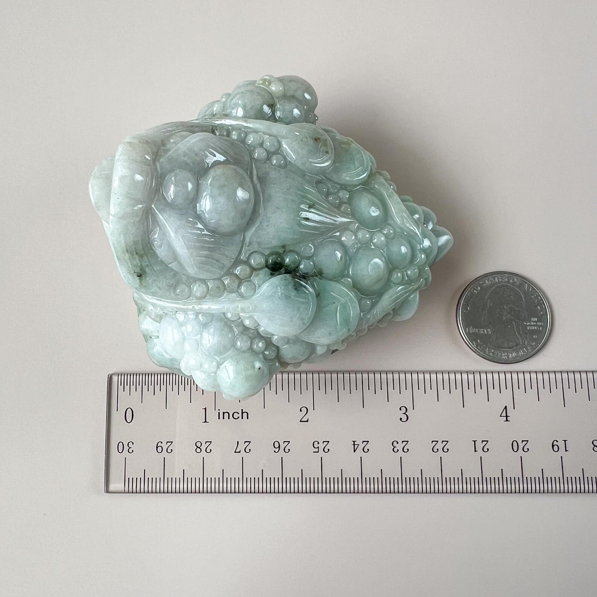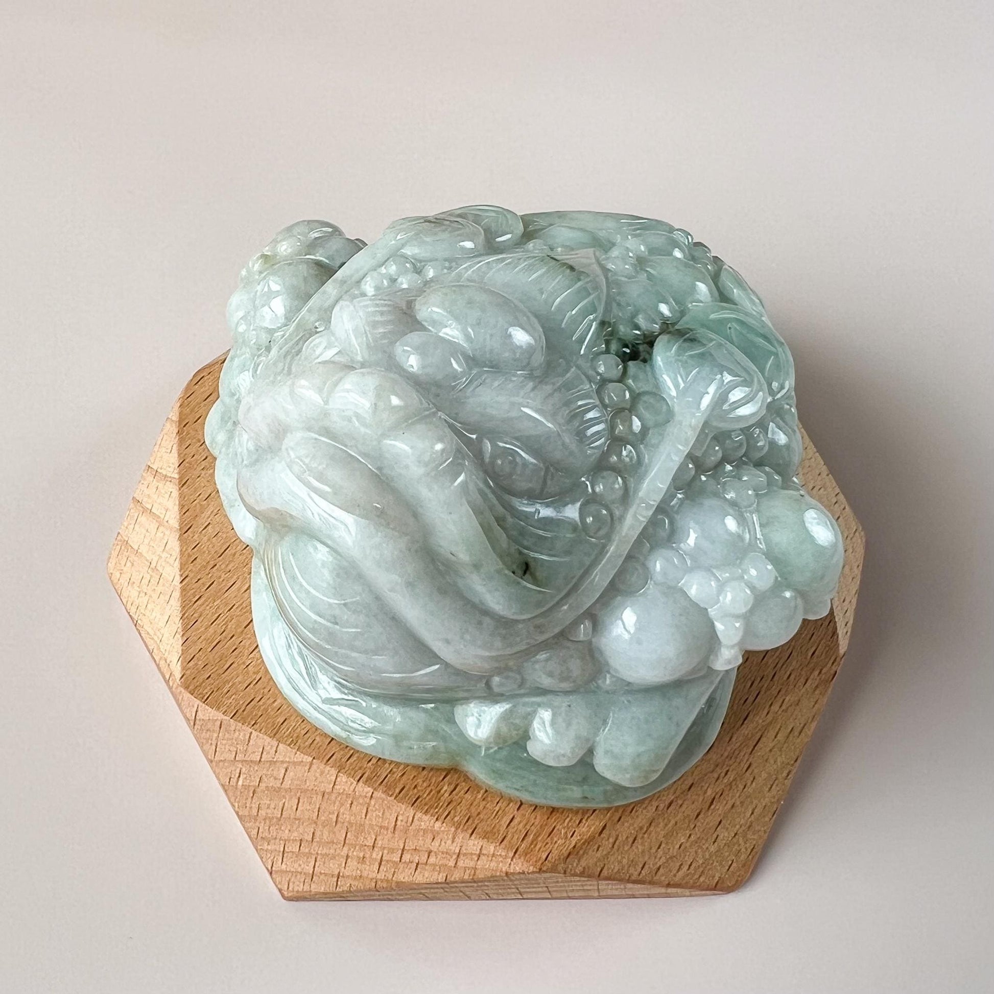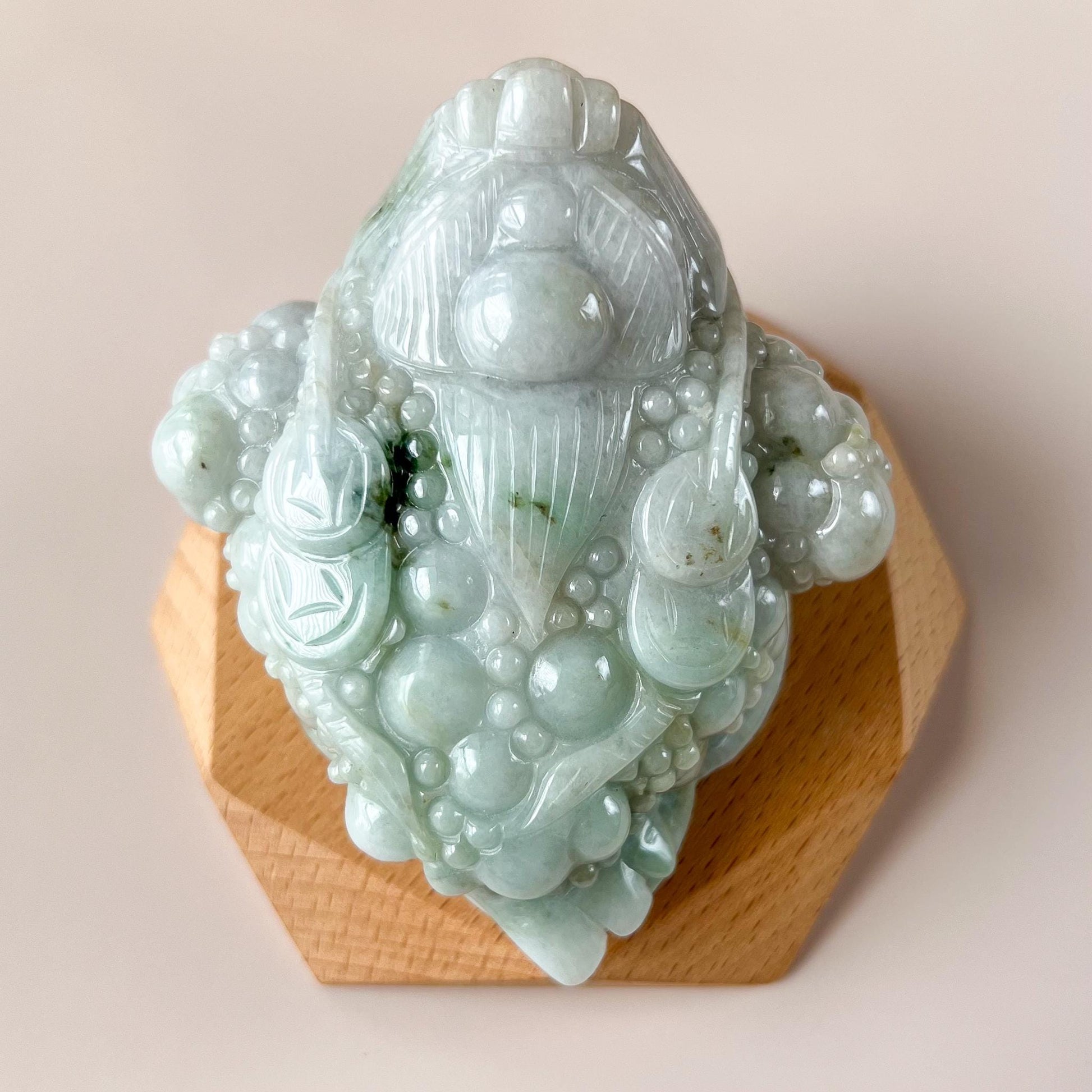 CARVING: This exquisite hand-carved jade Fortune Toad (also known as the Money Frog or Chan Chu 蟾蜍) is a powerful symbol of wealth, prosperity, and good fortune in Chinese culture. Crafted from natural jadeite, the figurine showcases fine detailing—from the toad’s textured back and strong form to the clusters of coins and treasures it guards.