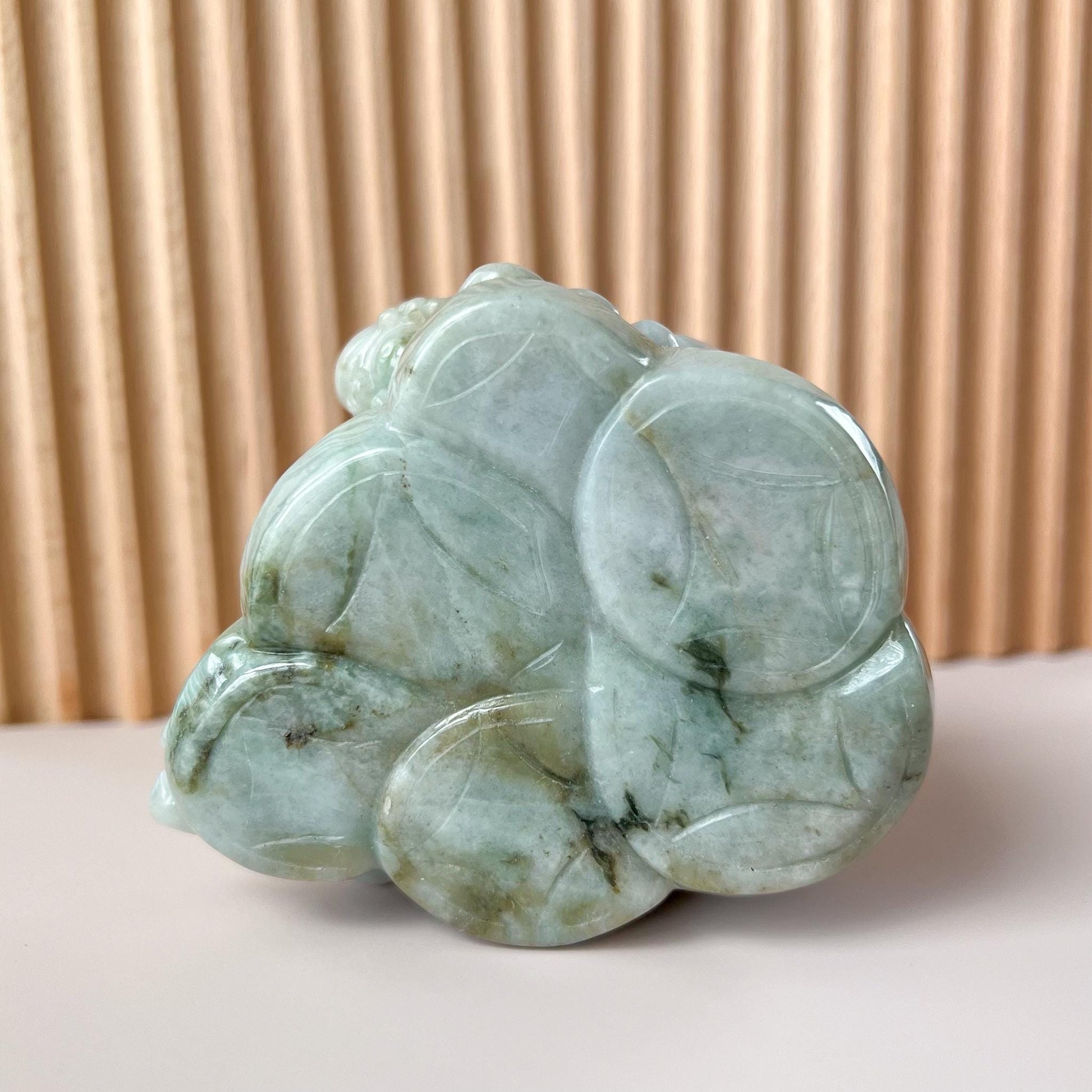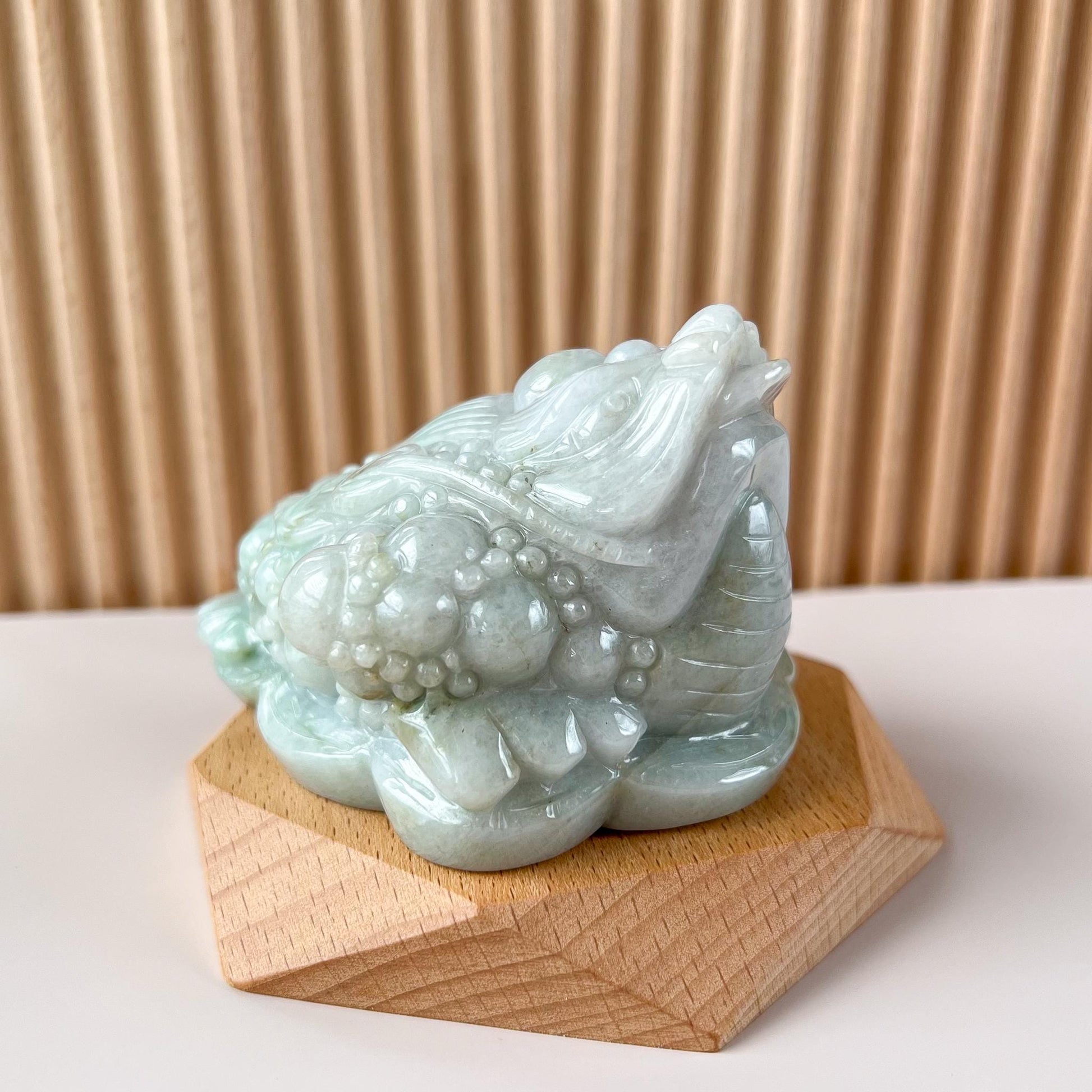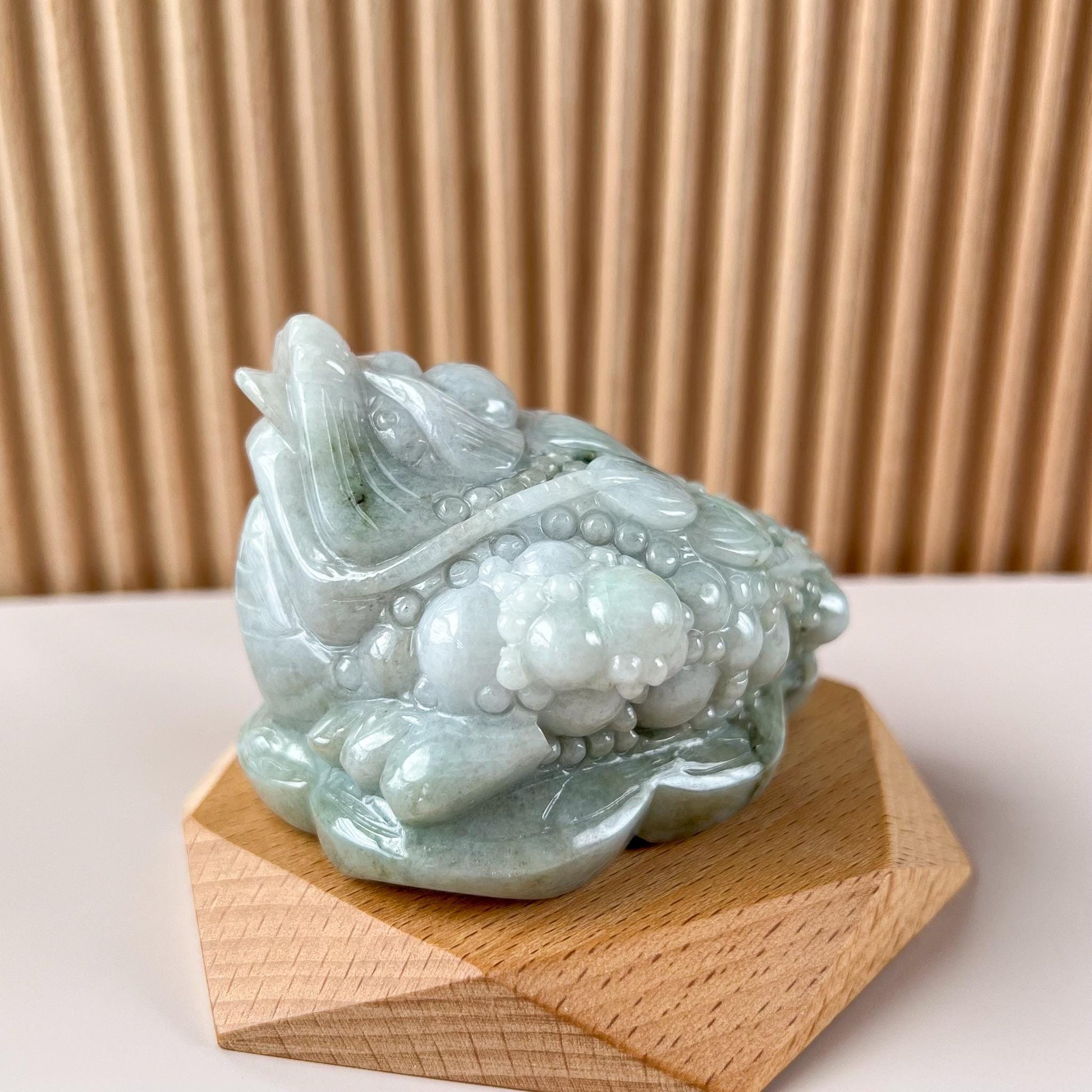 The Fortune Toad is traditionally depicted as a three-legged creature and believed to draw wealth and protection into the home or business. Its smooth polish and natural translucency highlight the quality of the jade, while subtle green hues symbolize growth, renewal, and abundance.