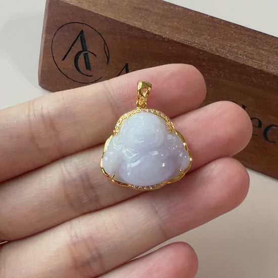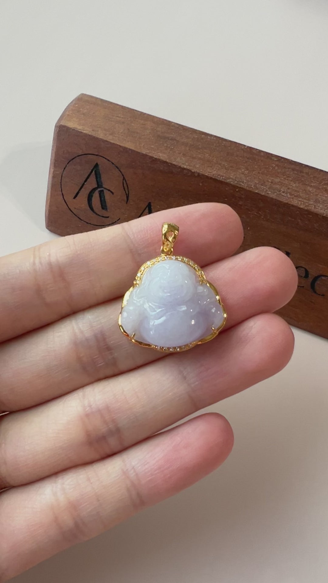 Purple Lavender Jadeite Jade Happy Buddha Carved Pendant with 18k Solid Gold, NY-0723-1705470502