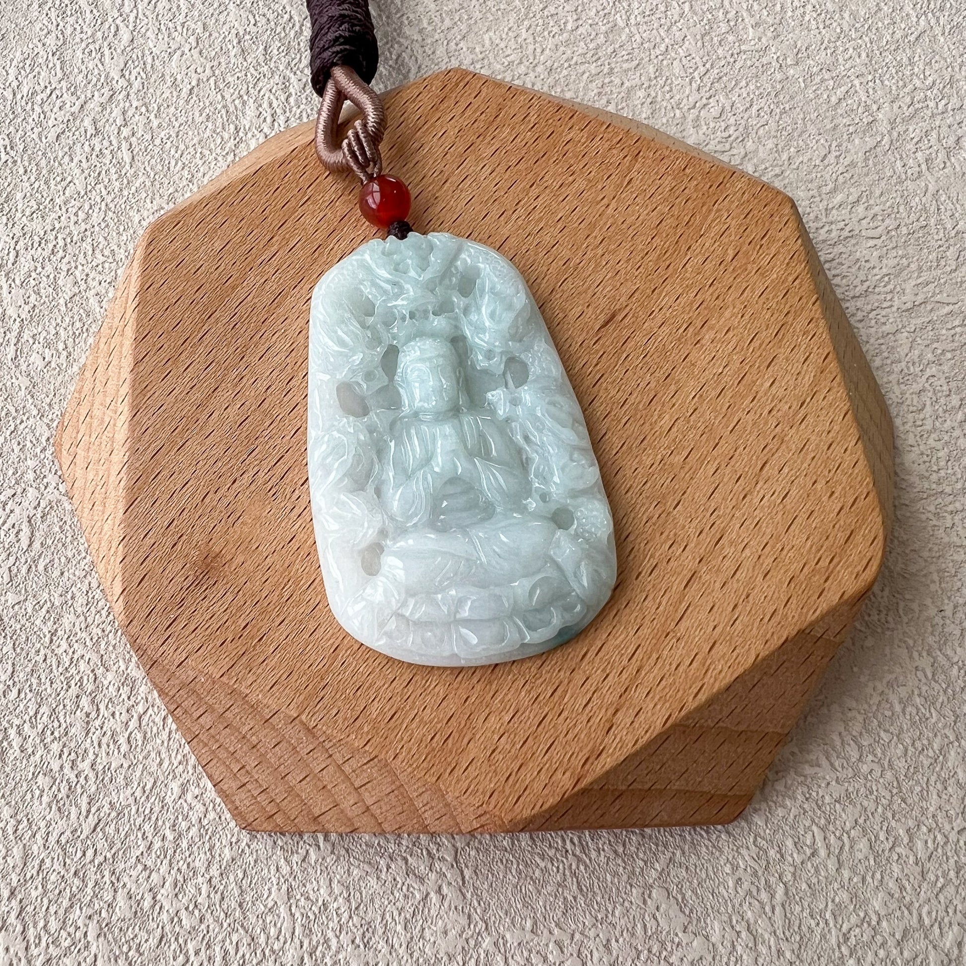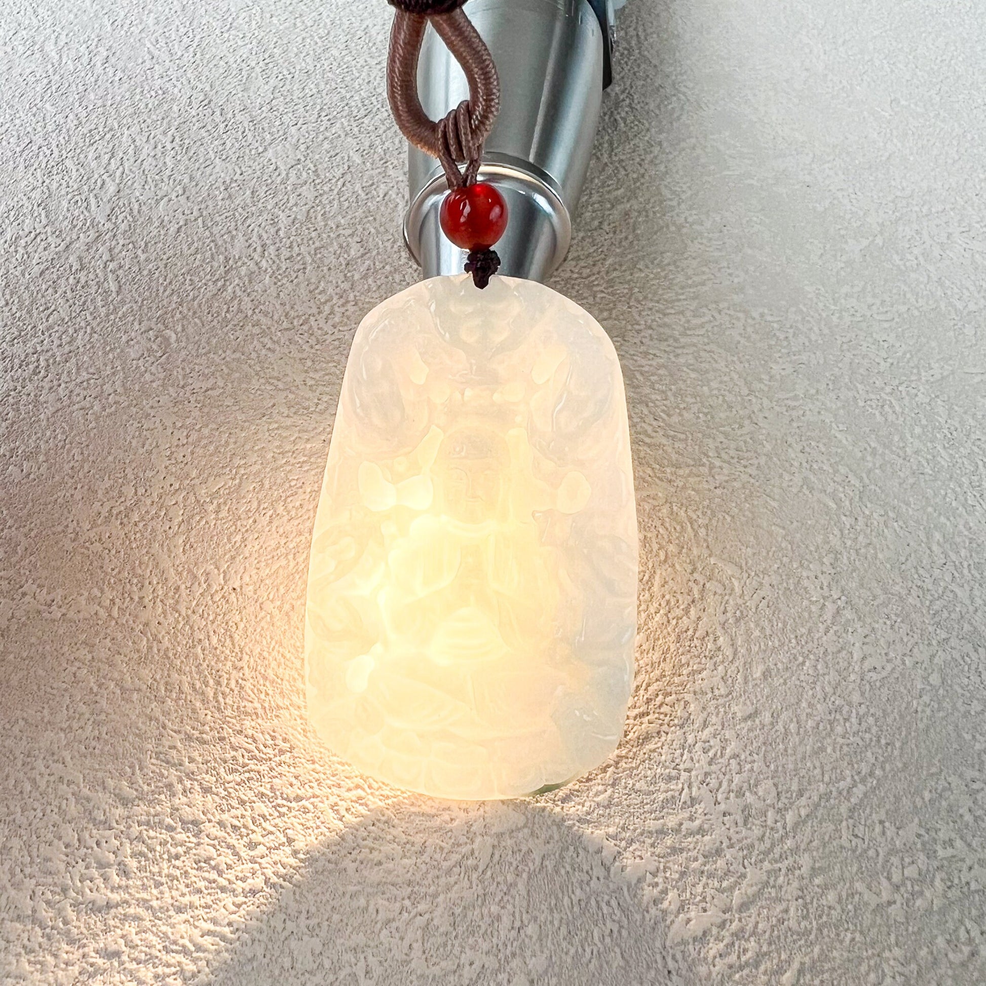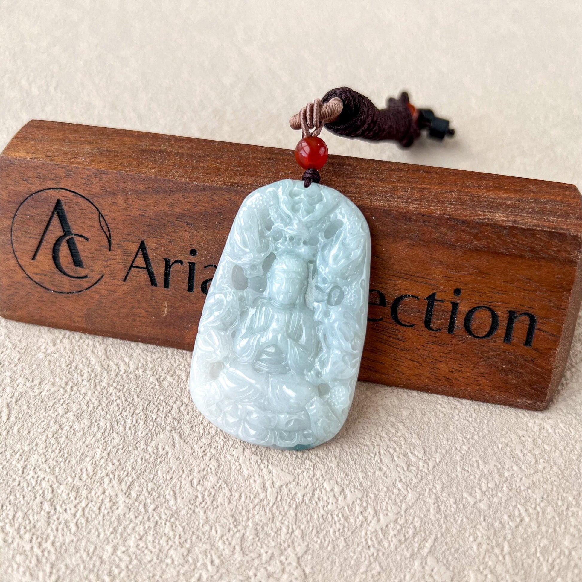 CARVING: This jade pendant showcases eight dragons encircling a meditating Buddha, symbolizing protection and wisdom. Each dragon is finely carved, emphasizing their guardian roles. The Buddha, in a meditative pose, highlights tranquility and enlightenment. On the back, a ninth dragon signifies completeness and all-encompassing safeguard. Crafted from high-quality jade, the piece combines artistry with spiritual symbolism, serving as both a protective talisman and a testament to skilled jade carving.